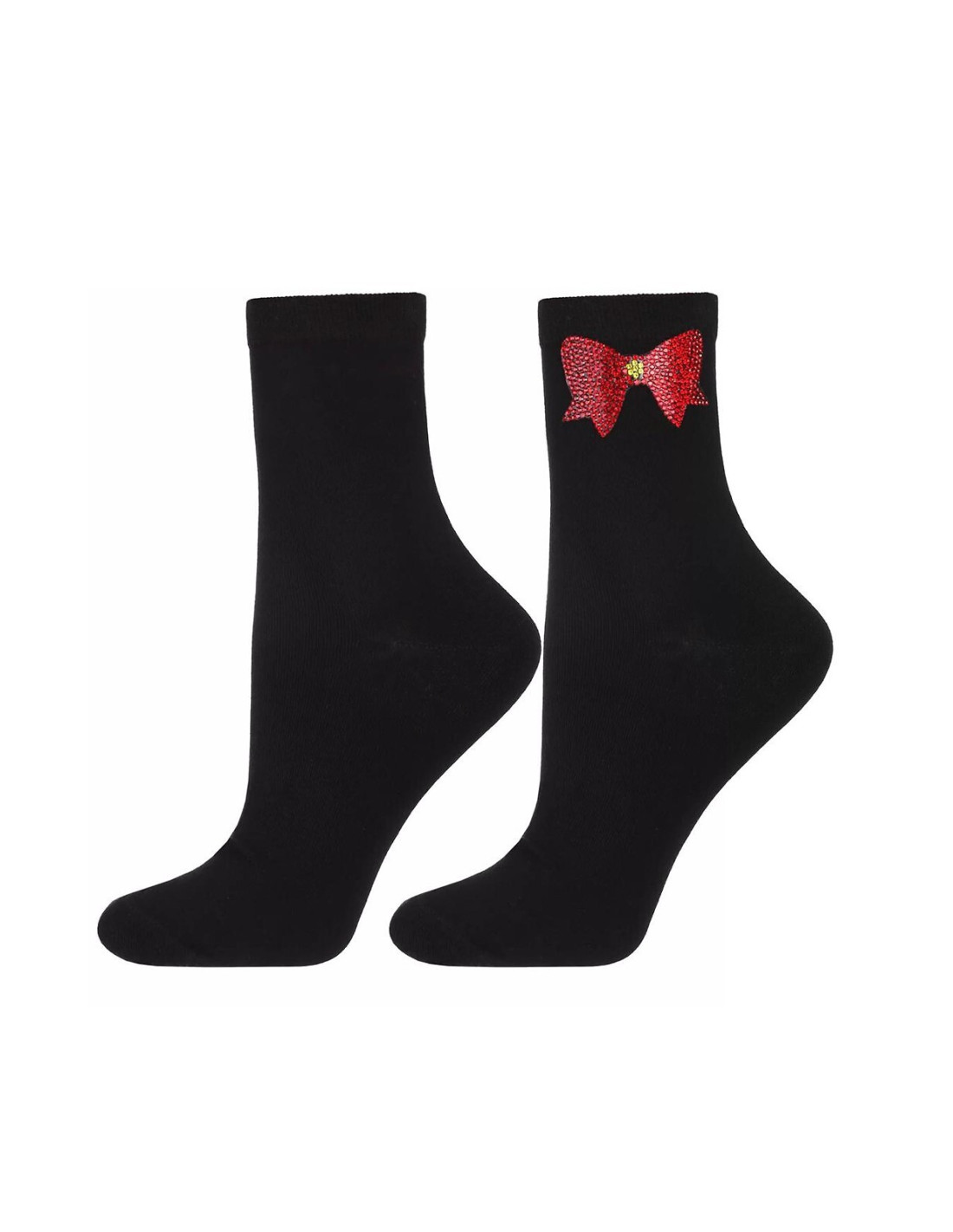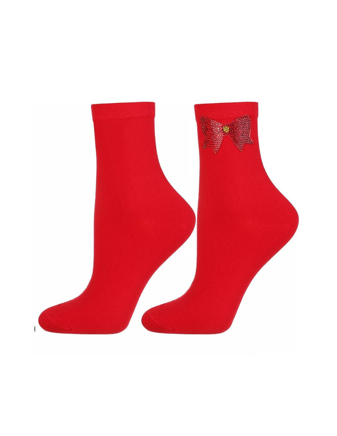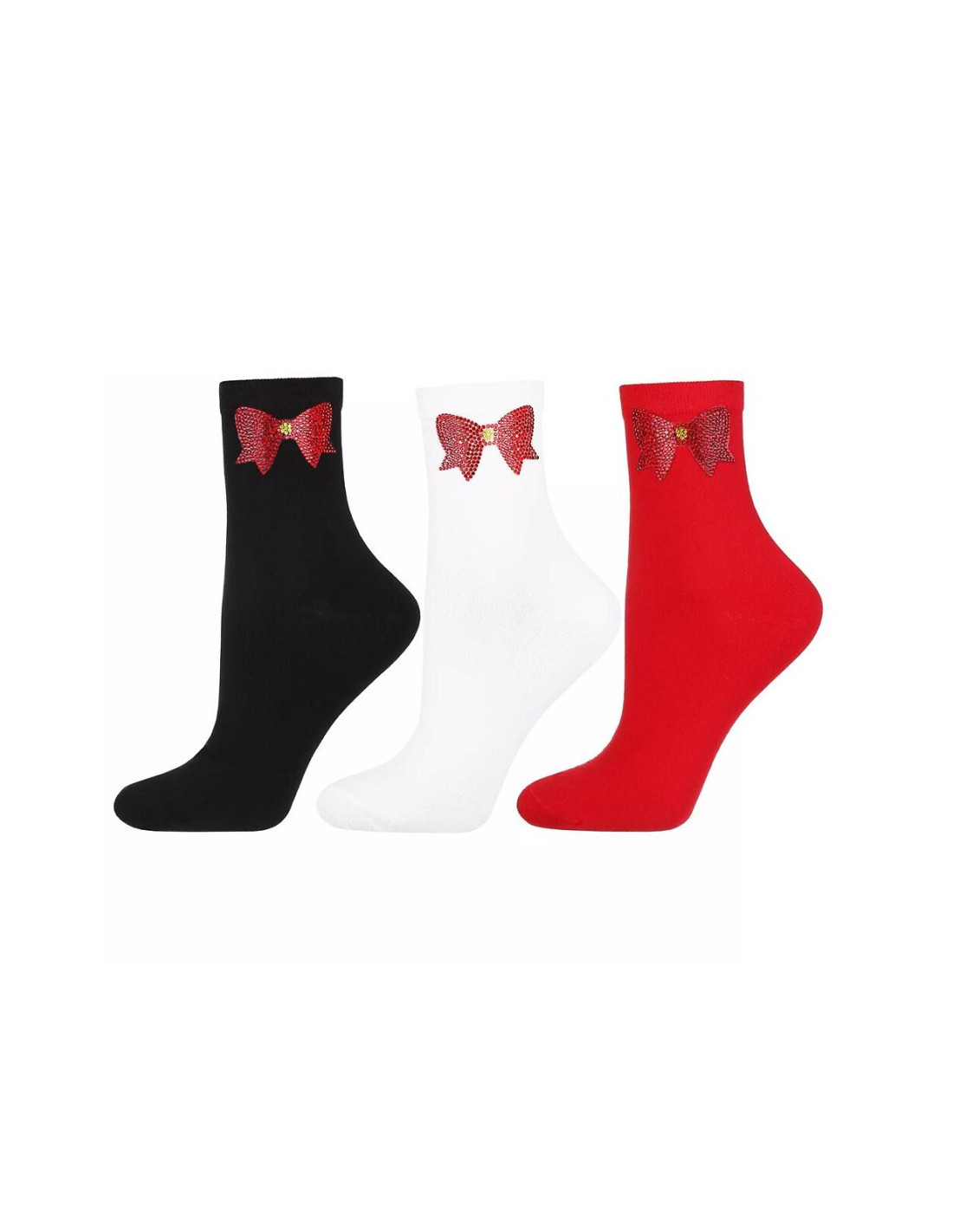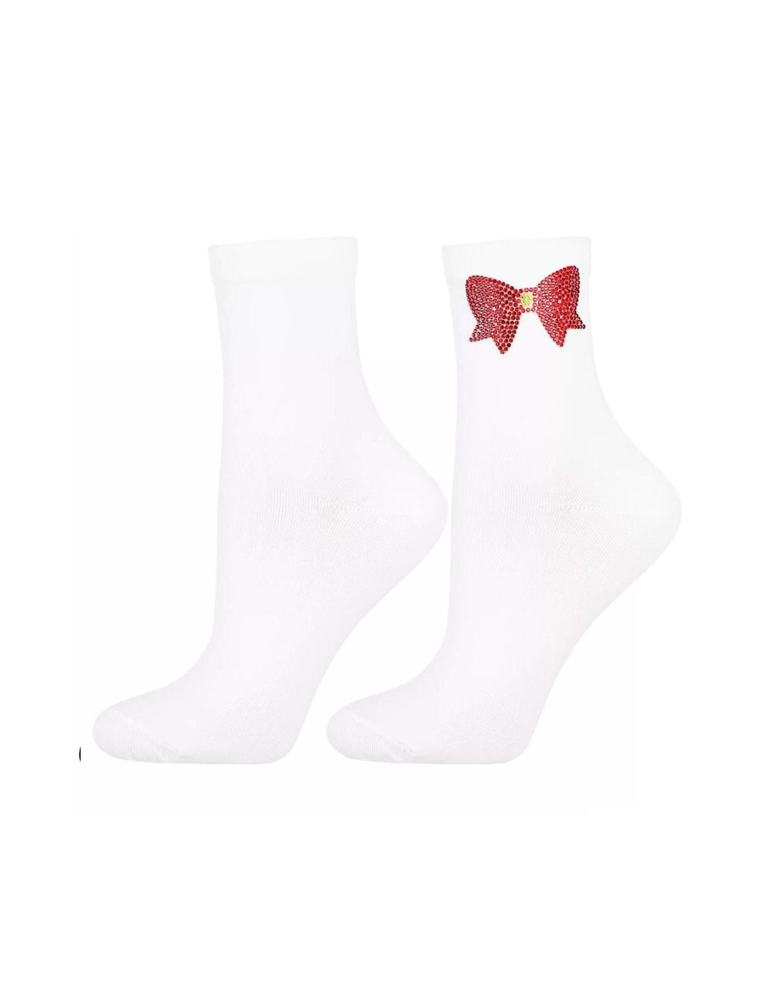 Skarpety damskie - wysokiej jakości bawełna - cholewka ozdobiona połyskującą kokardką z cyrkonii - dostępne kolory wybierane losowo; czarny, czerwony, ecru