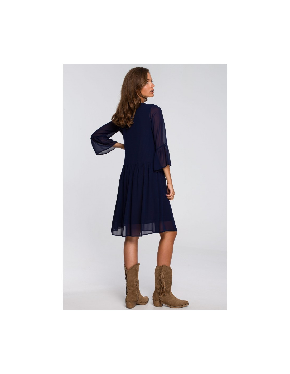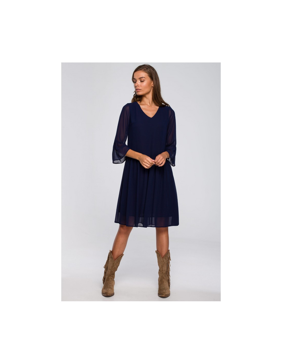 - Lengvo, šifoninio audinio, varpelio silueto suknelė su "V" formos iškirpte;