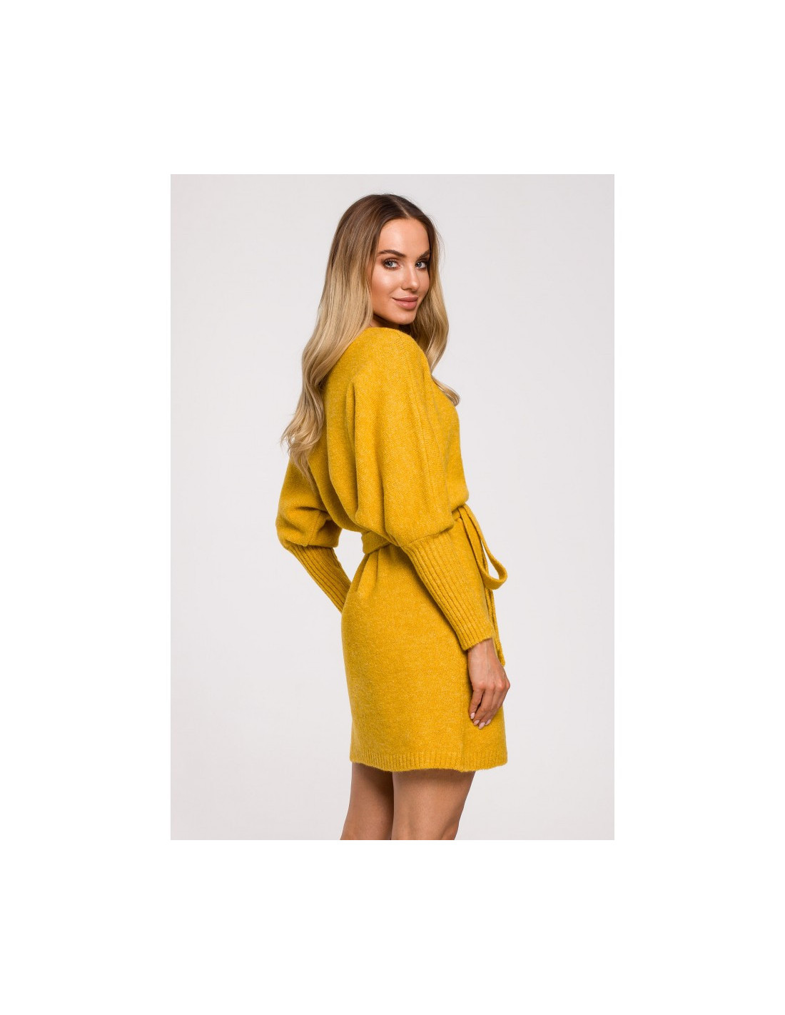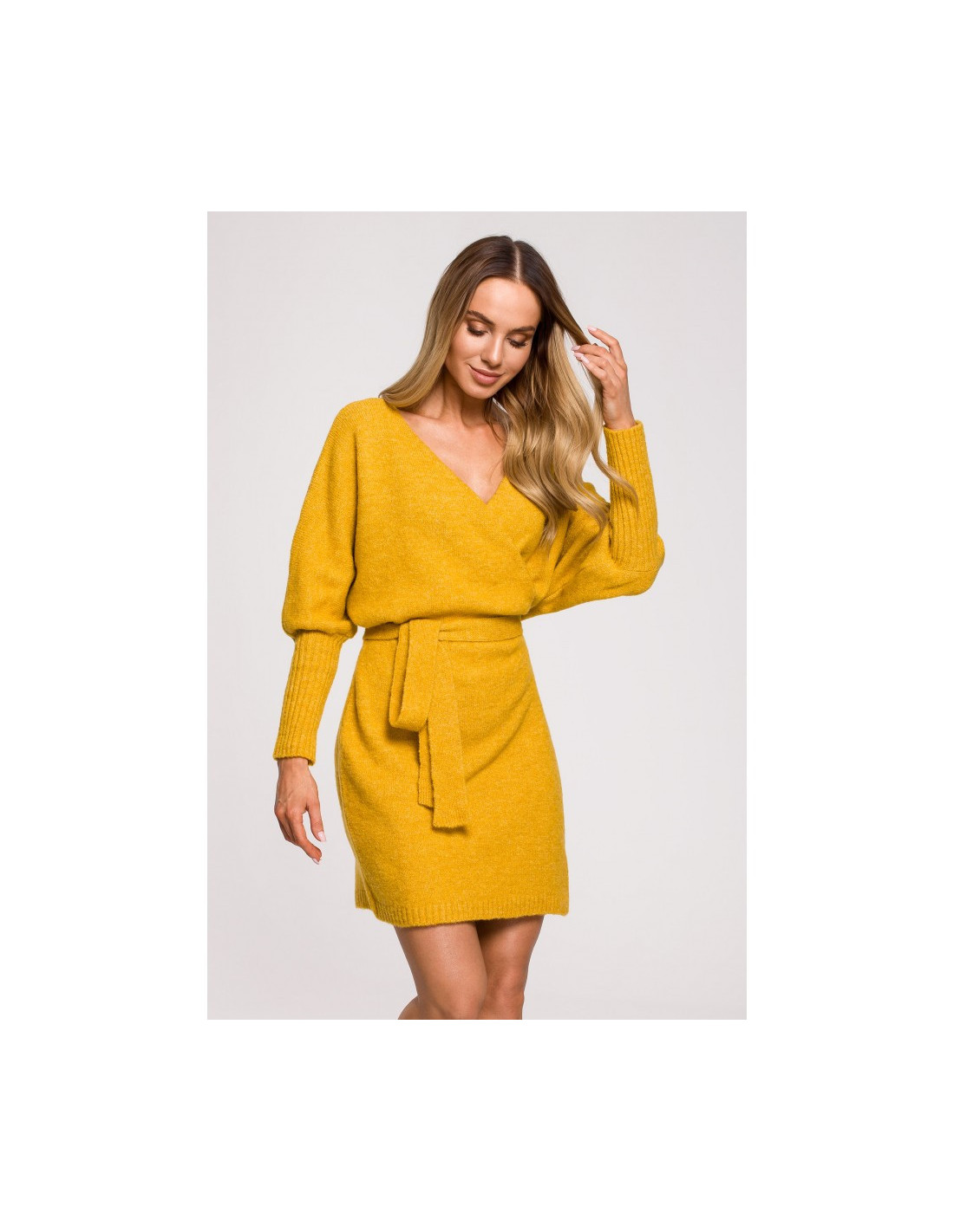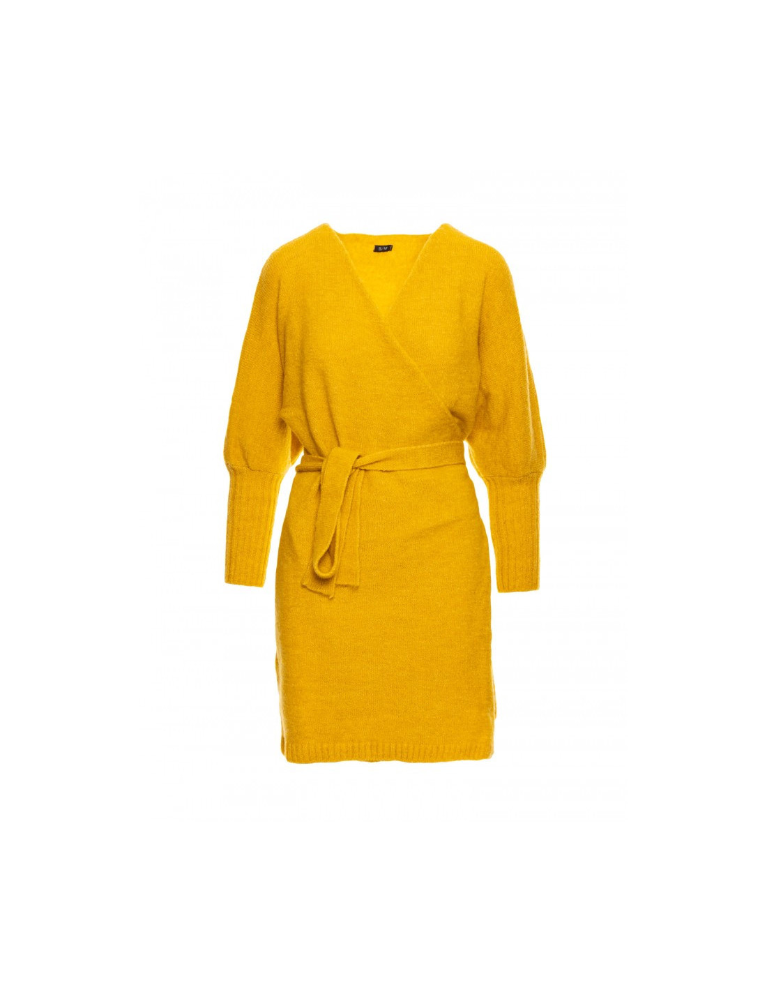 Šilta ir jauki megzta suknelė su "V" formos iškirpte, įliemenuojama dirželiu;