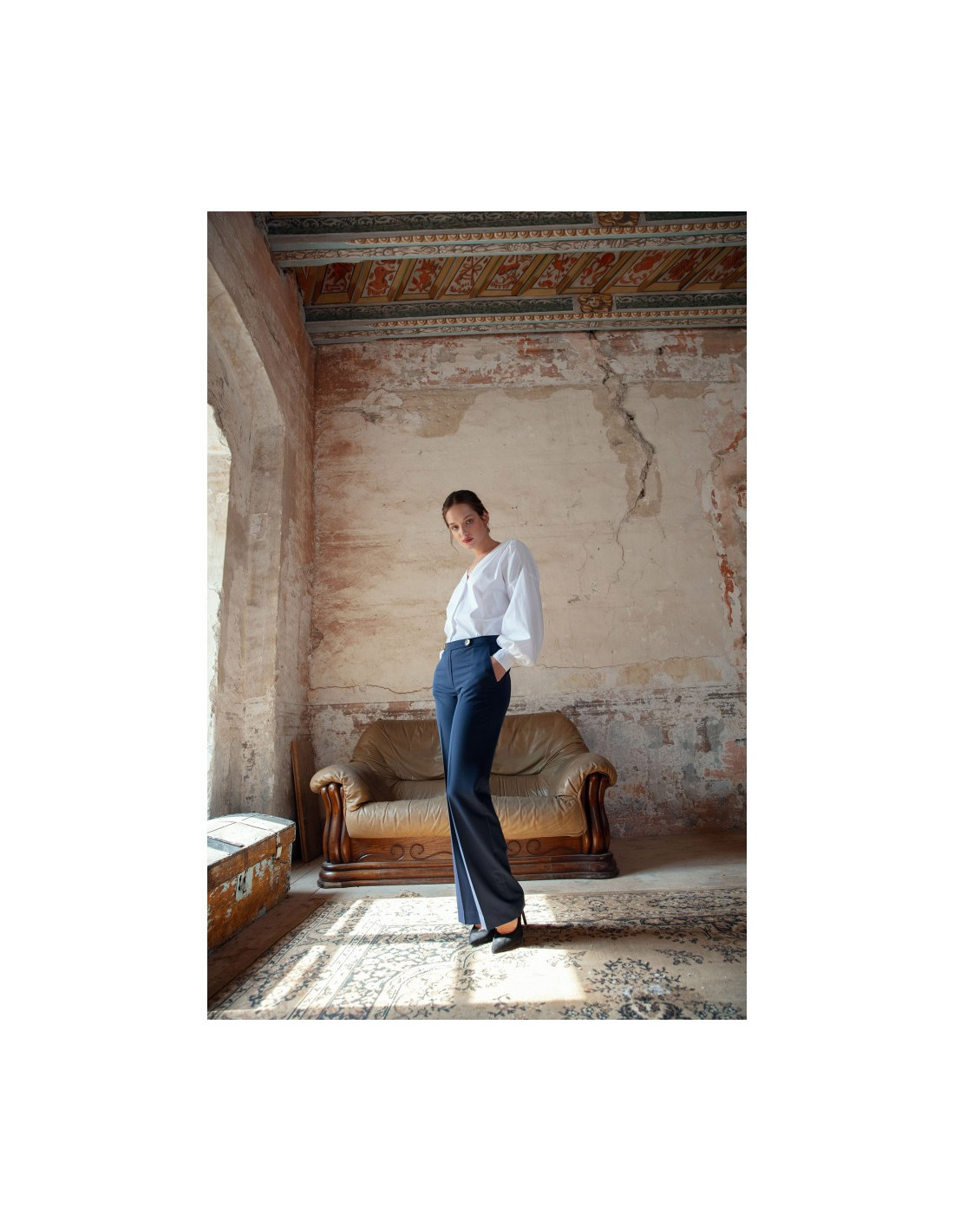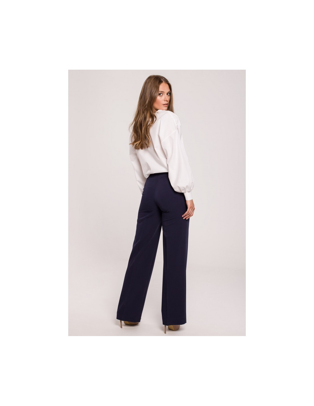 Subtilios, klasikinio stiliaus, tiesaus kirpimo kelnės ties juosmeniu dekoruotos sagomis