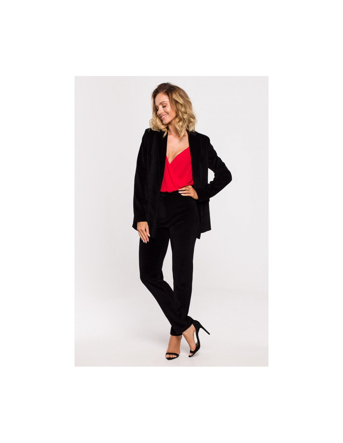 Elegantiškas, veliūrinio audinio švarkas užsegamas viena sagute;