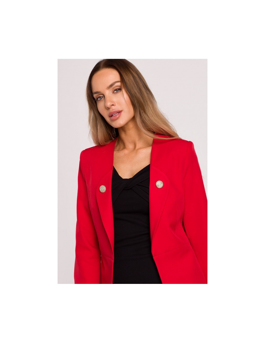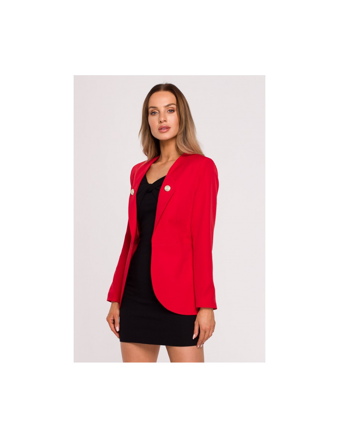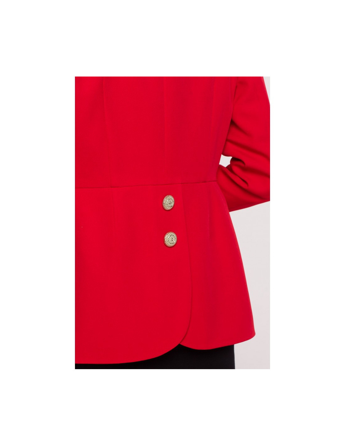 Stilingas ir prigludęs raudonas švarkelis su dekoratyvinėmis sagutėmis;