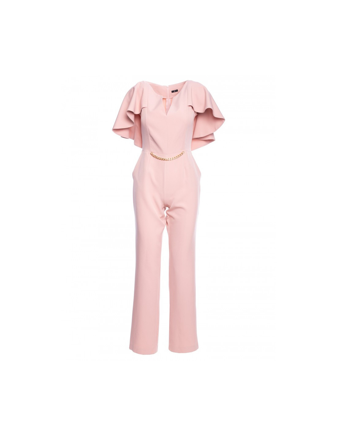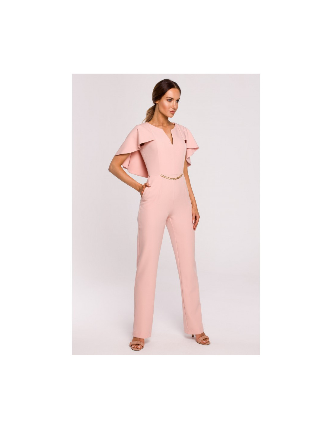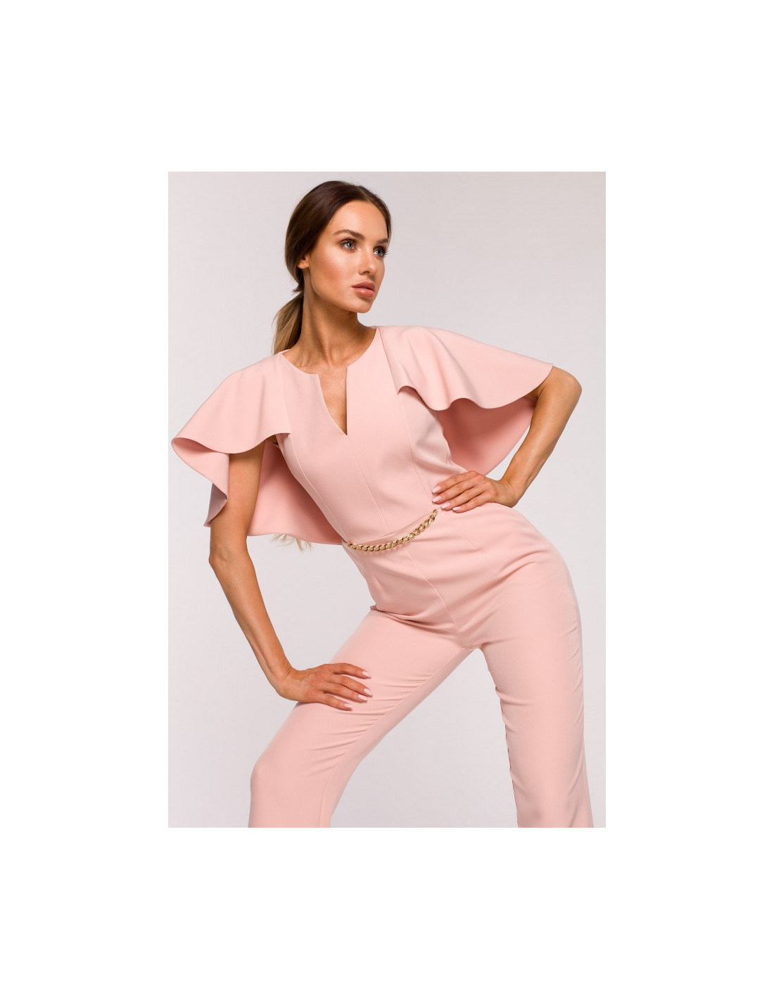 Vientisas kombinezonas su grandinėle ir pelerinos efektu nugaroje.