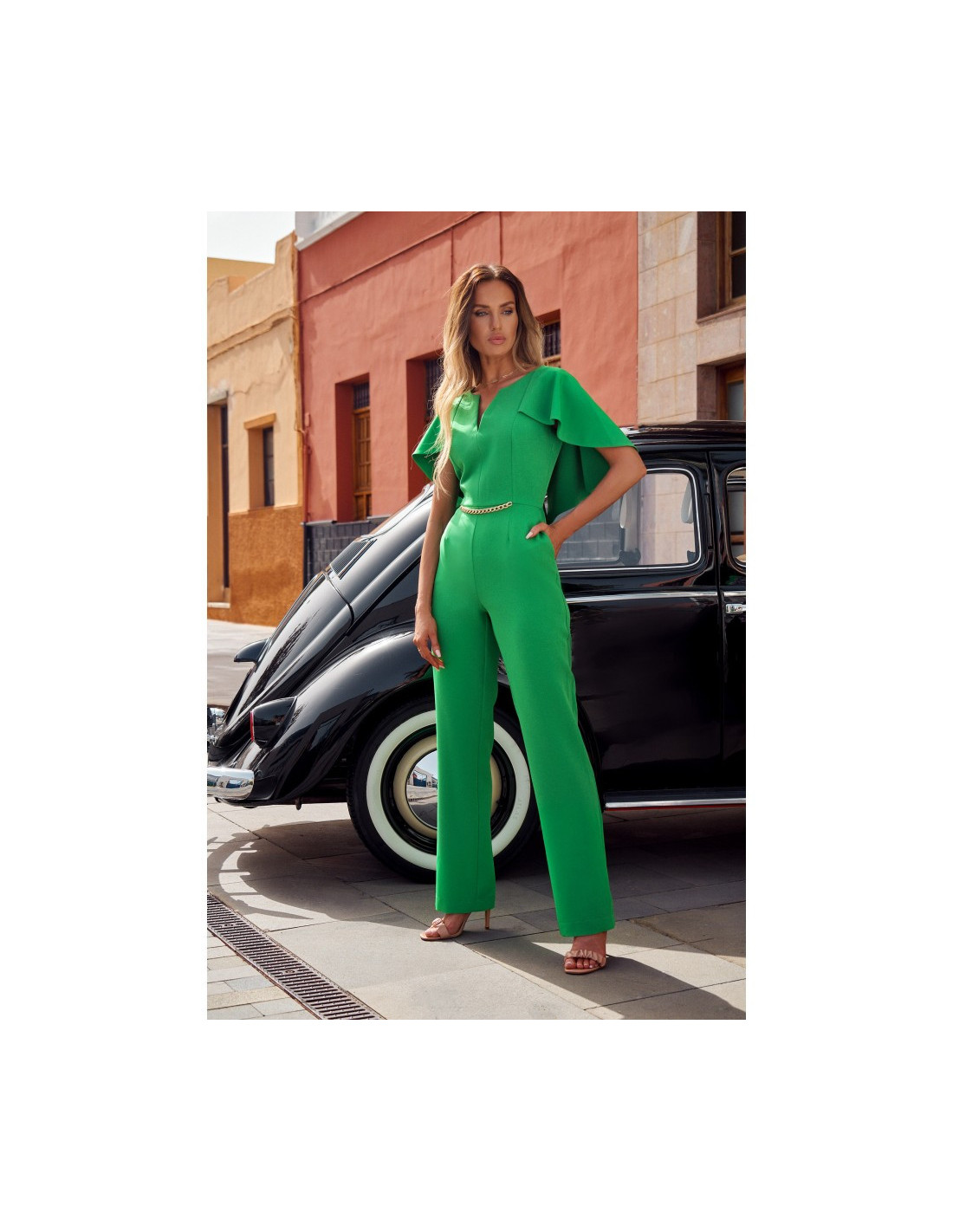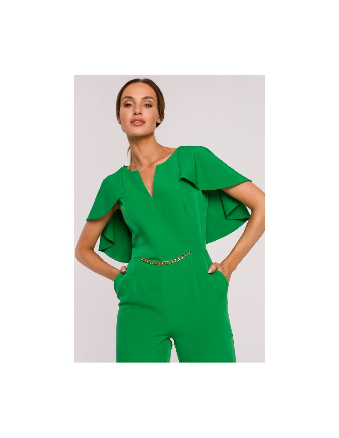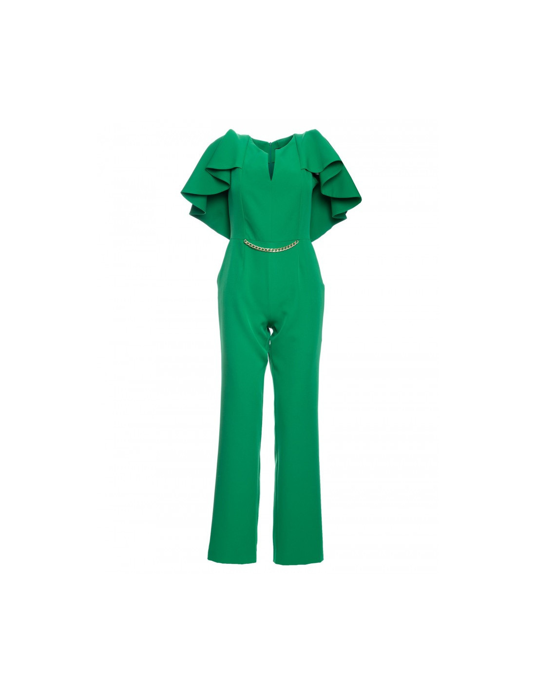 Vientisas kombinezonas su grandinėle ir pelerinos efektu nugaroje.