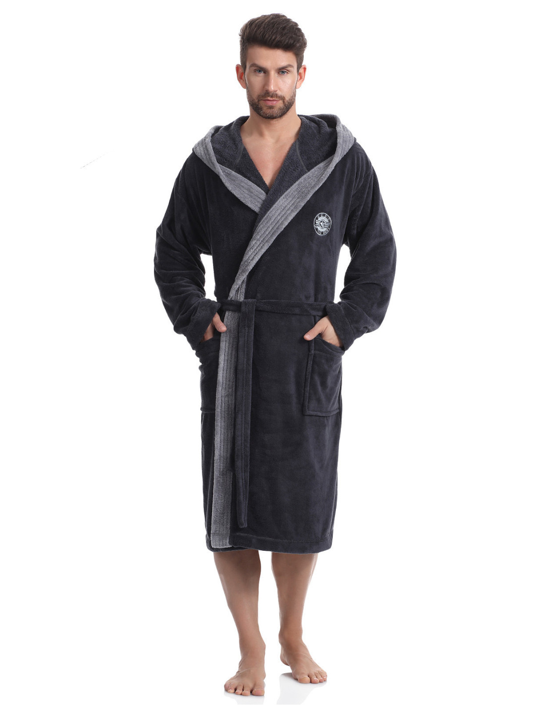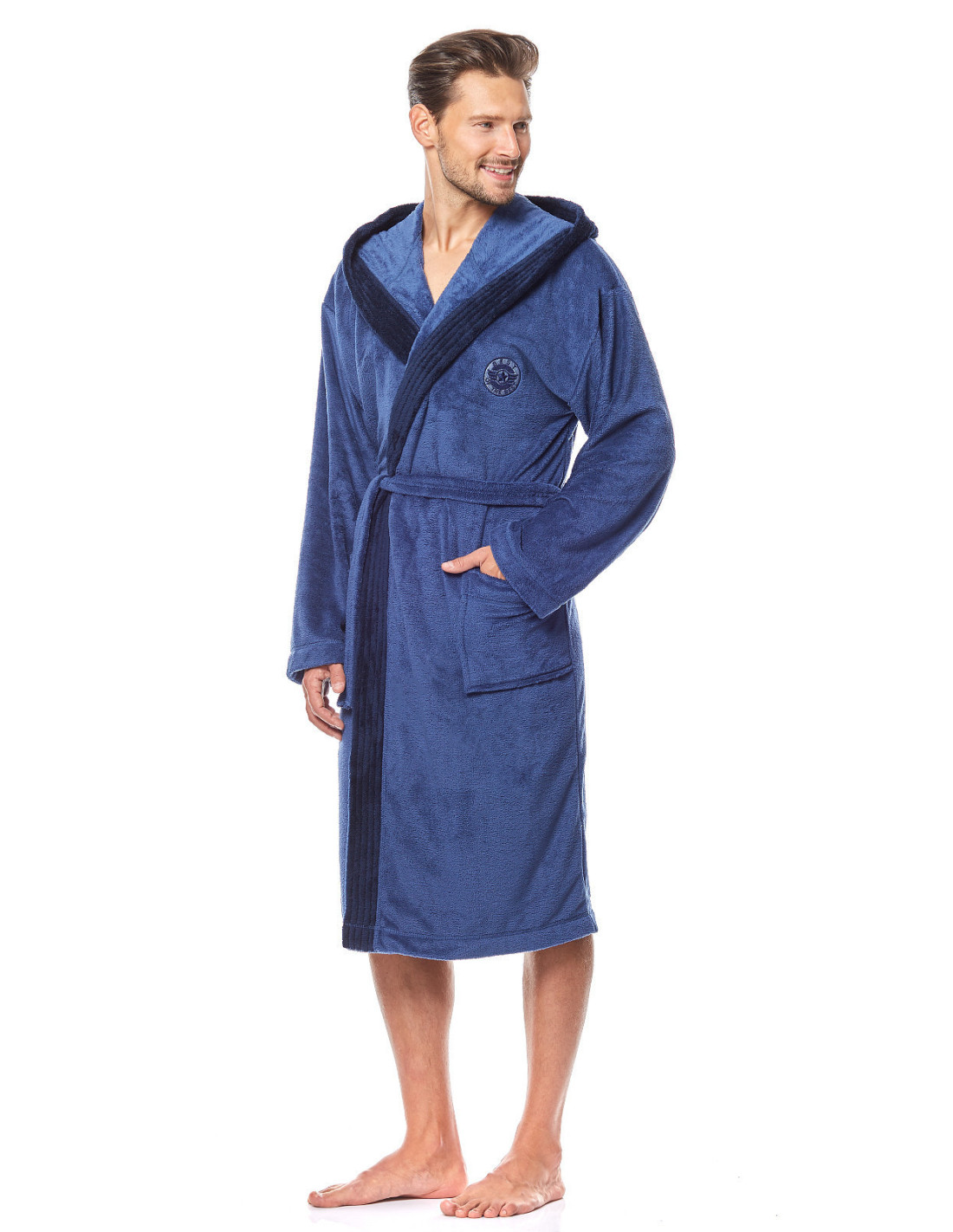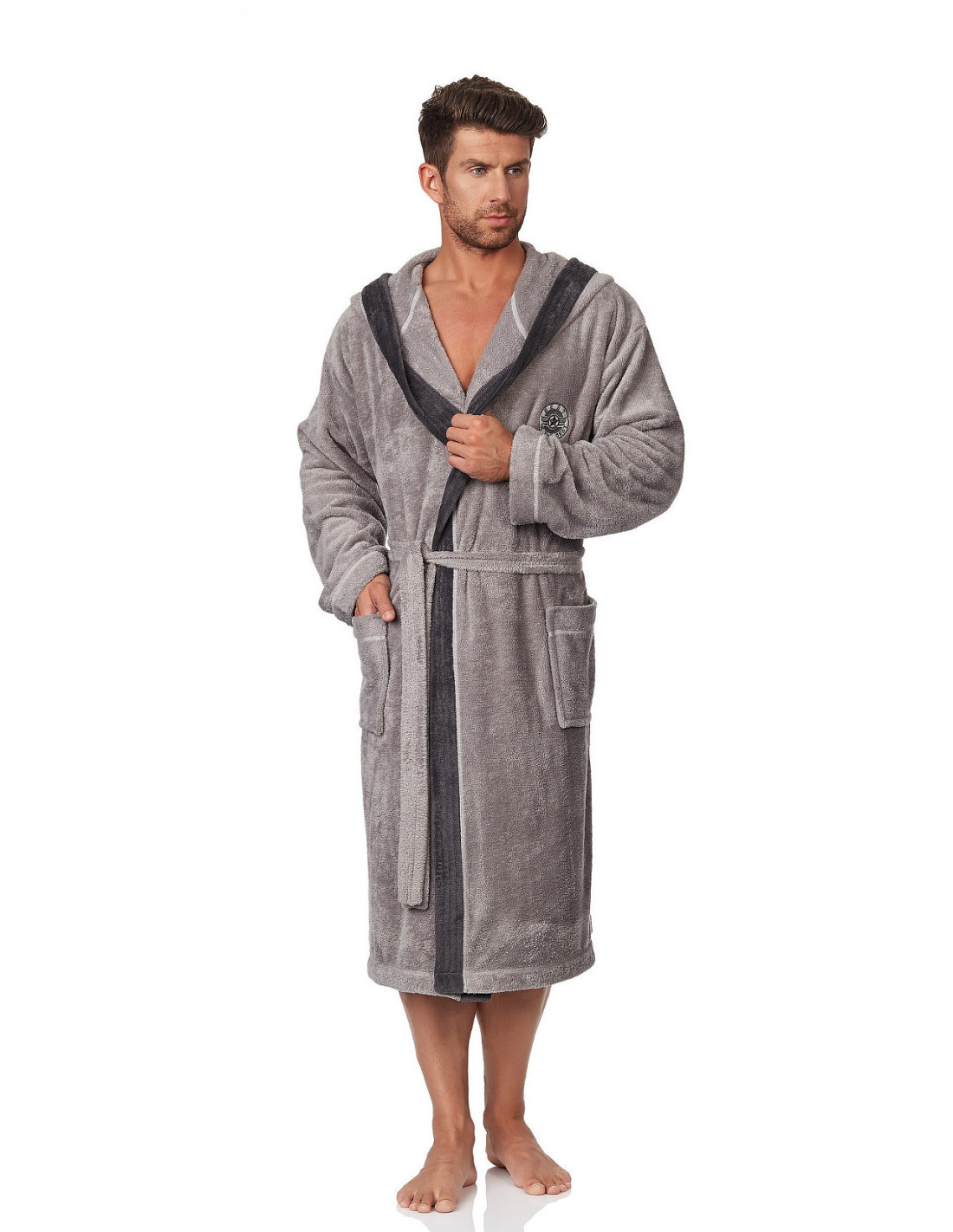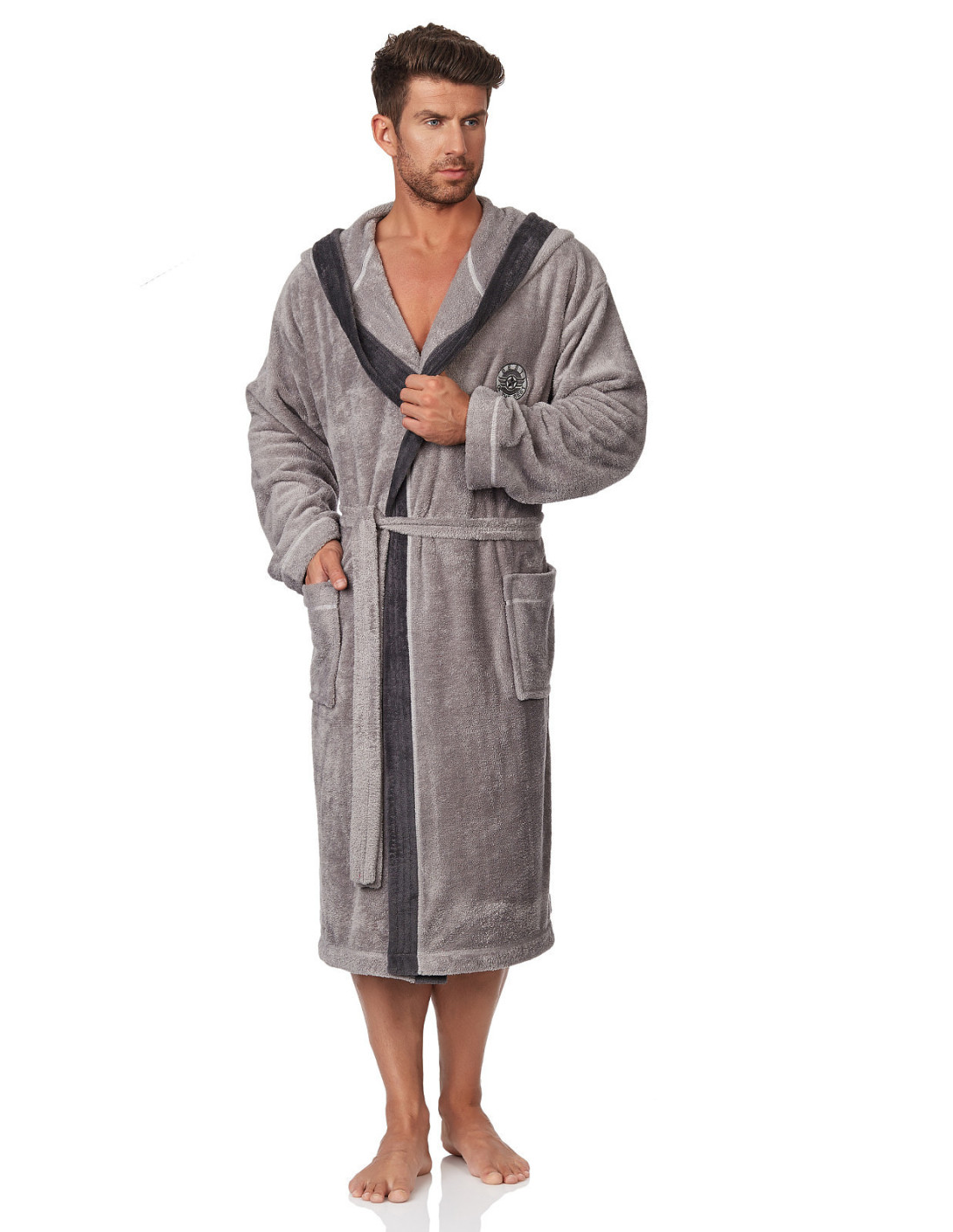Vyriškas ilgas chalatas su gobtuvu - surišamas per liemenį - iš minkšto trikotažo (minkšto) - išorinės kišenės ant klubų - lopas ant krūtinės - gražus ir malonus liesti, užtikrina dėvėjimo patogumą