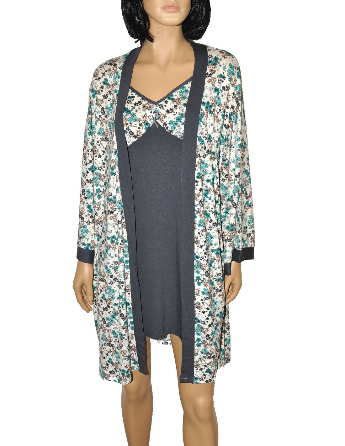 Moteriškas plonas chalatas - su kimono rankovėmis - pagamintas iš raštuotos viskozės - surišamas per liemenį