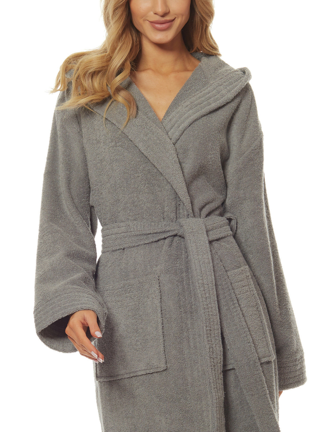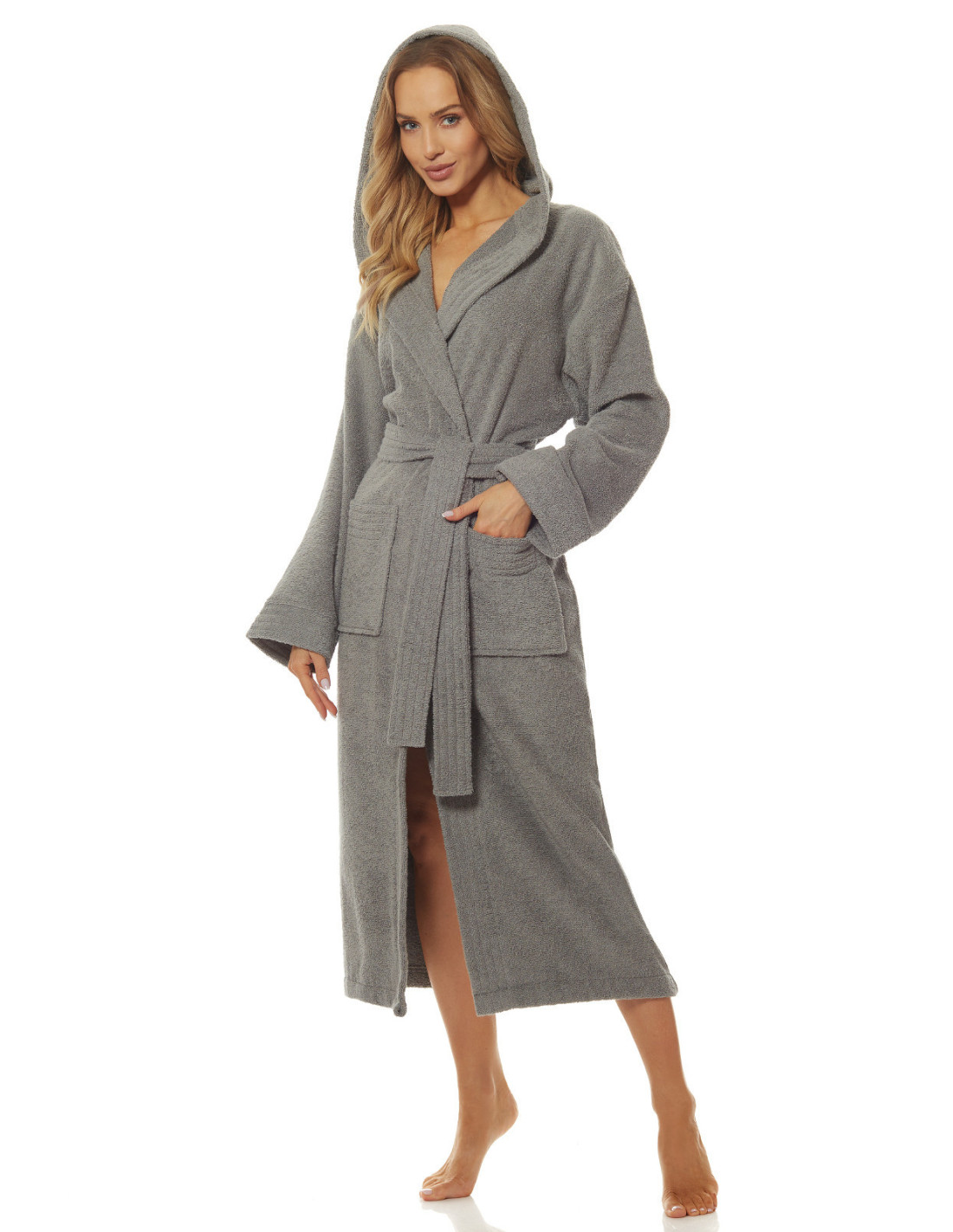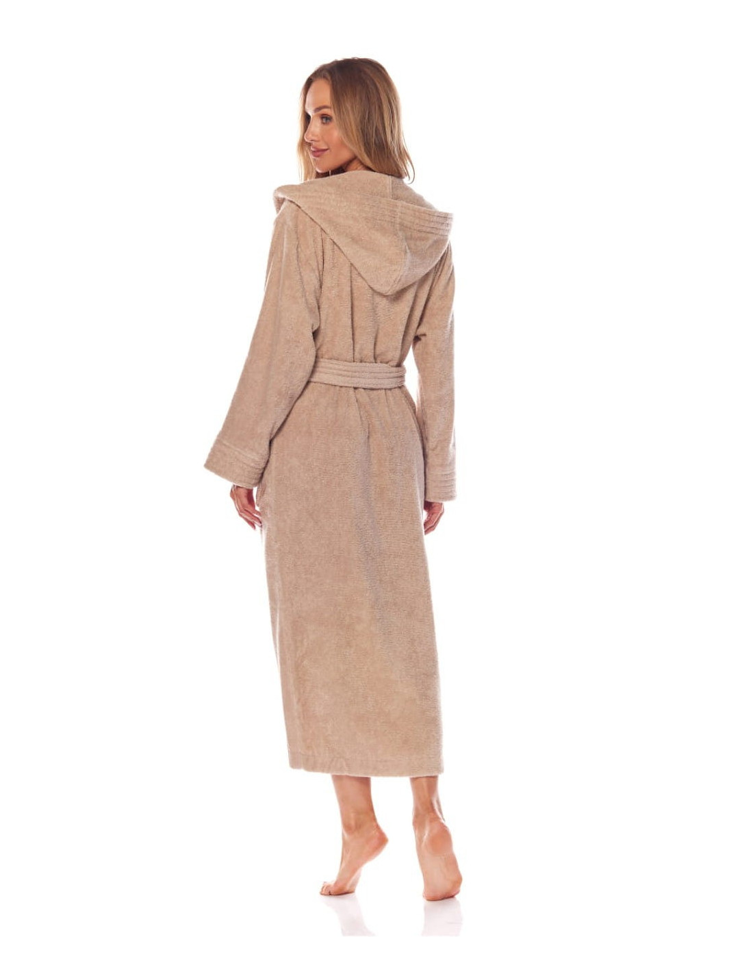 Moteriškas ilgas chalatas - pagamintas iš aukštos kokybės medvilnės - frotinio tipo - su gobtuvu - surišamas per juosmenį, kišenės ant klubų