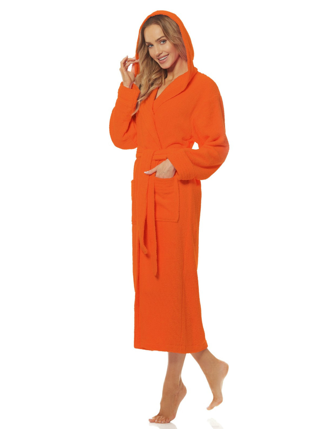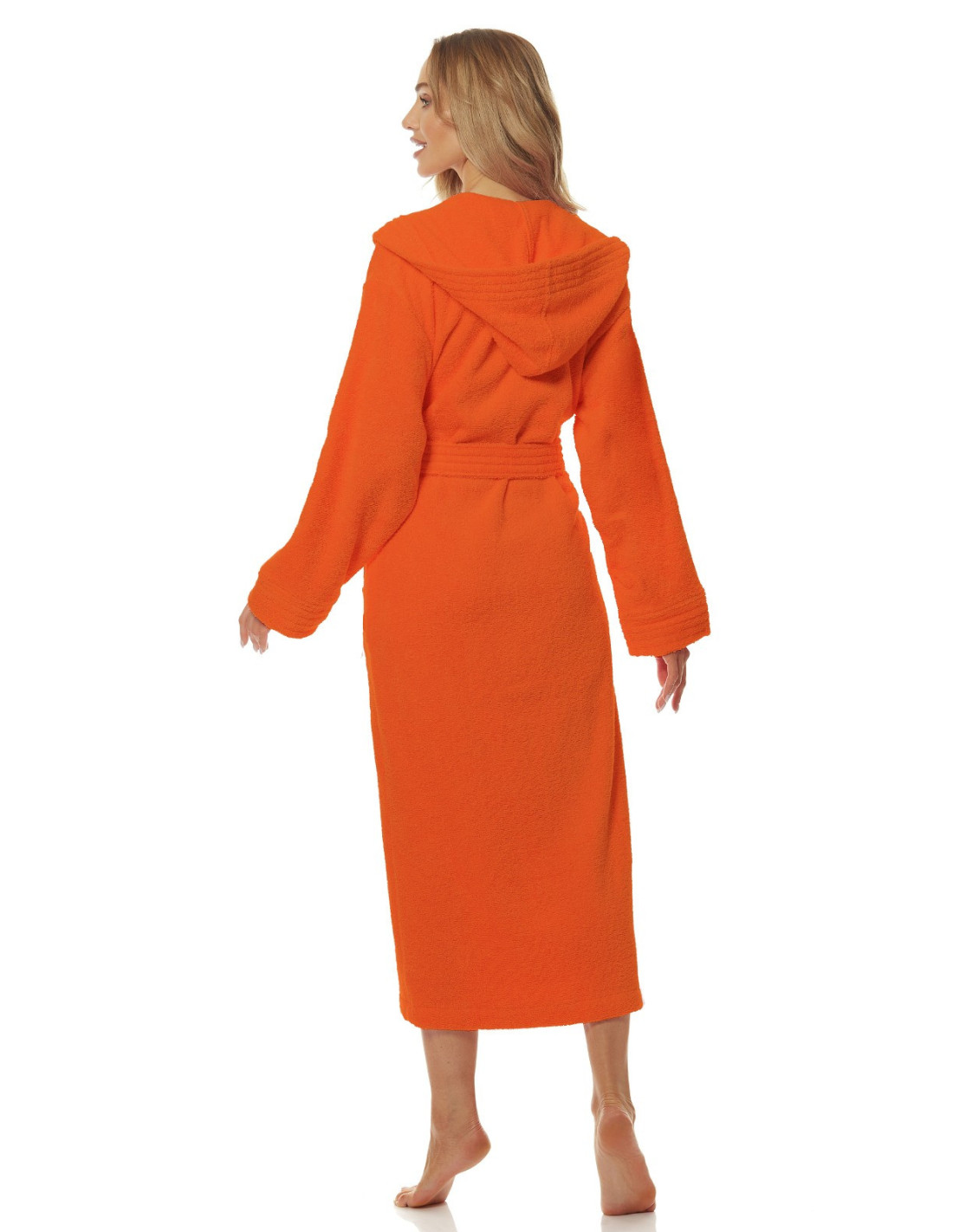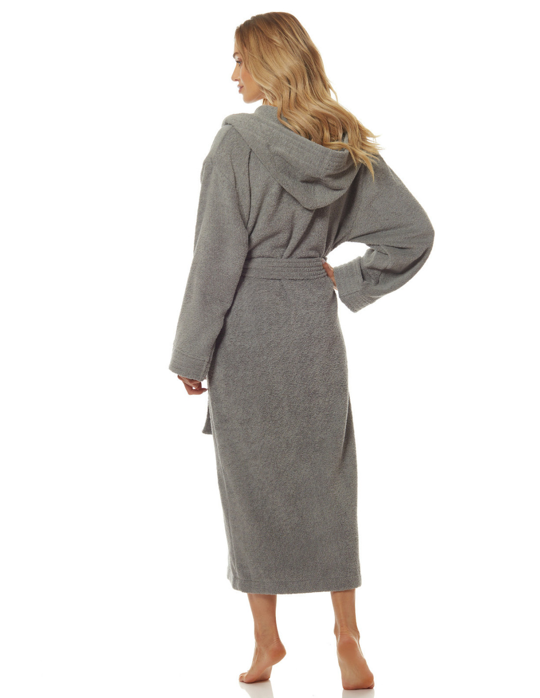 Moteriškas ilgas chalatas - pagamintas iš aukštos kokybės medvilnės - frotinio tipo - su gobtuvu - surišamas per juosmenį, kišenės ant klubų