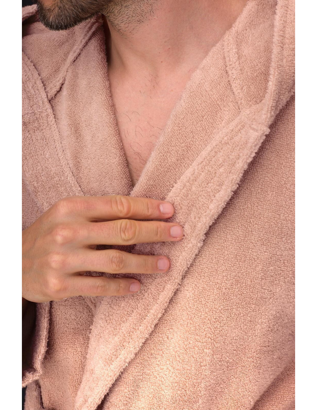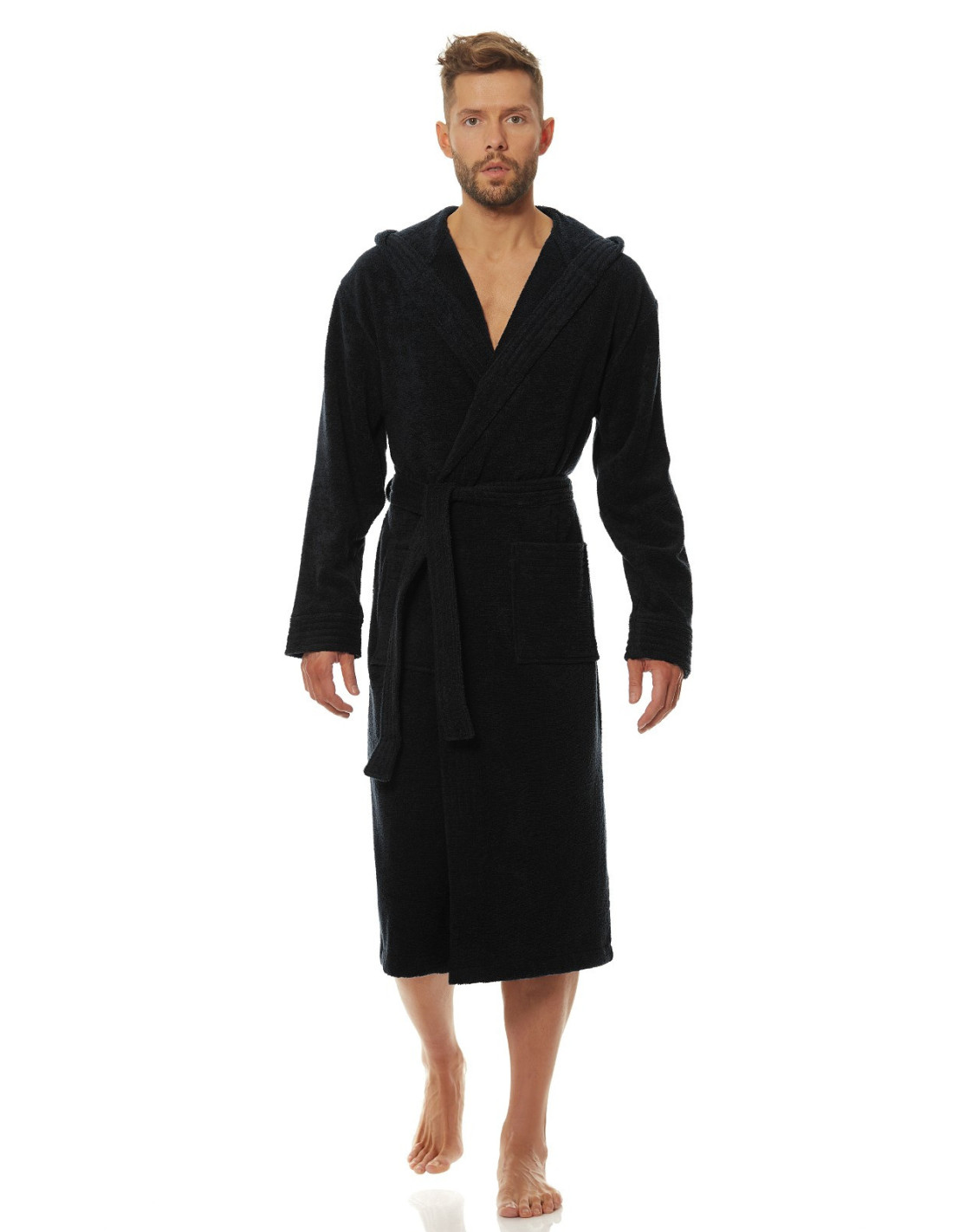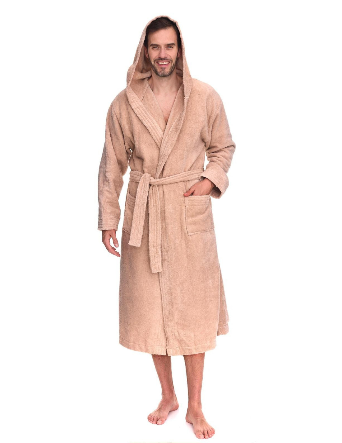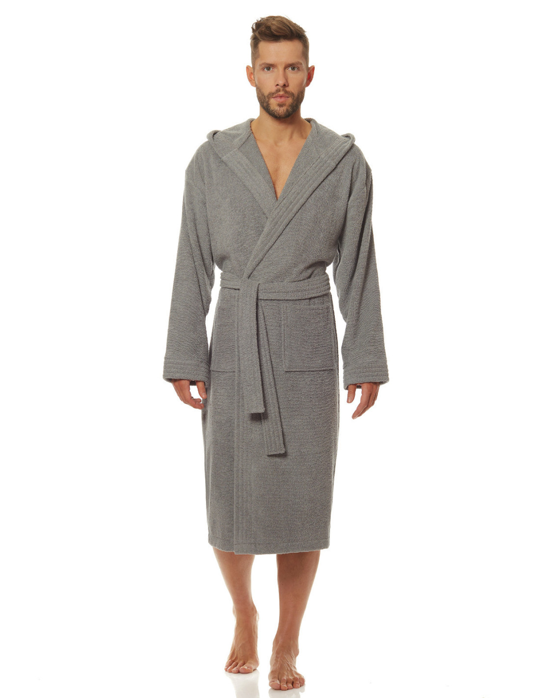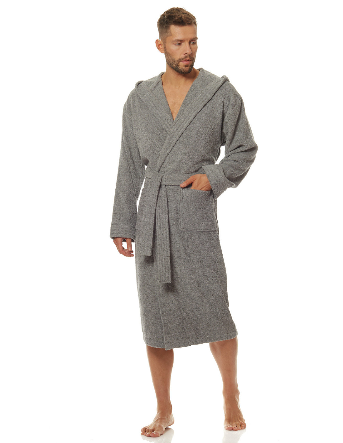 Trumpas vyriškas chalatas su gobtuvu - surišamas per juosmenį, minkšto frotinio trikotažo audinio - išorinės kišenės ant klubų - gražus ir malonus liesti, užtikrina dėvėjimo patogumą