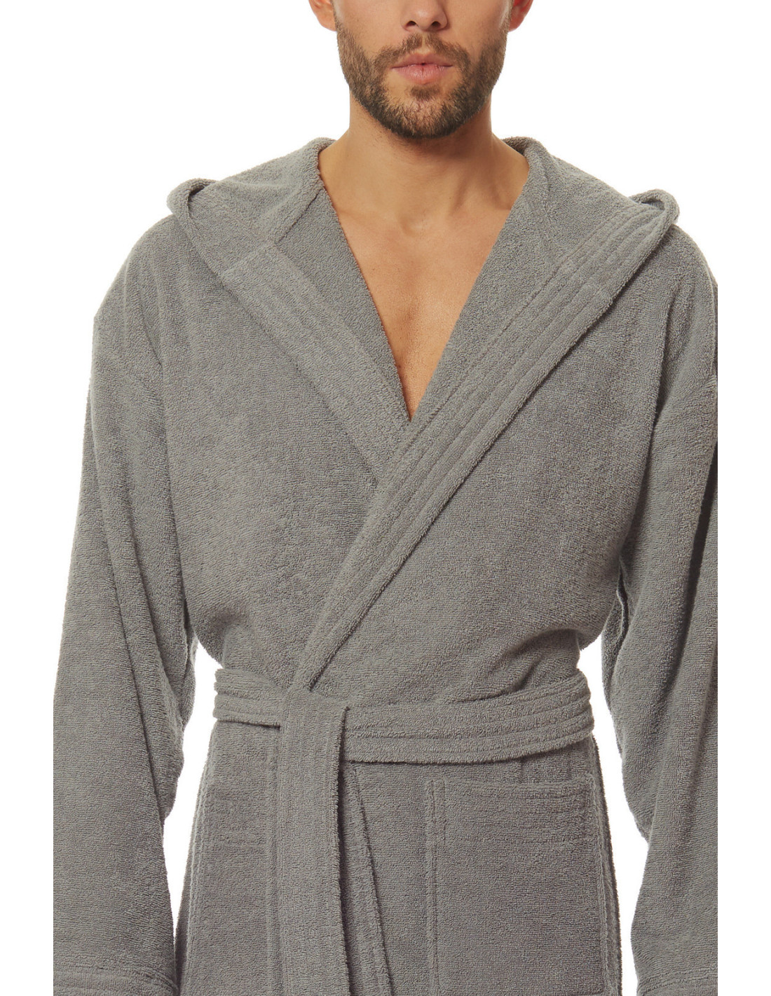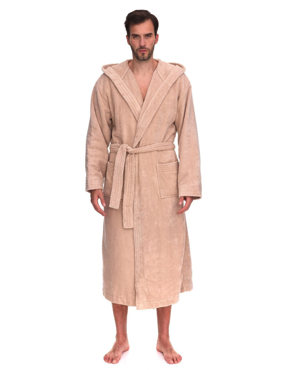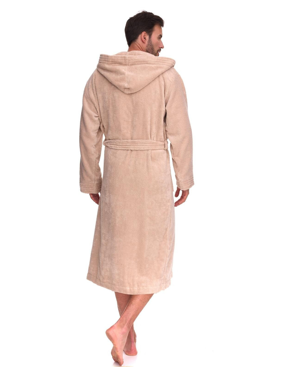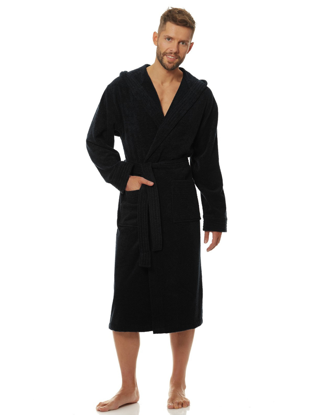 Trumpas vyriškas chalatas su gobtuvu - surišamas per juosmenį, minkšto frotinio trikotažo audinio - išorinės kišenės ant klubų - gražus ir malonus liesti, užtikrina dėvėjimo patogumą