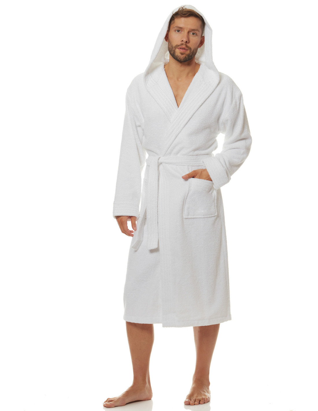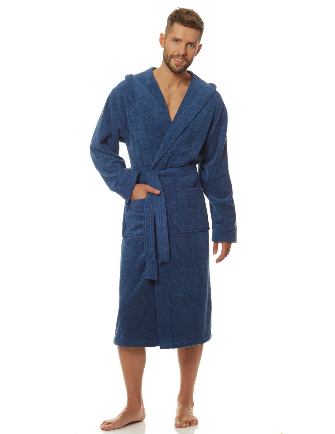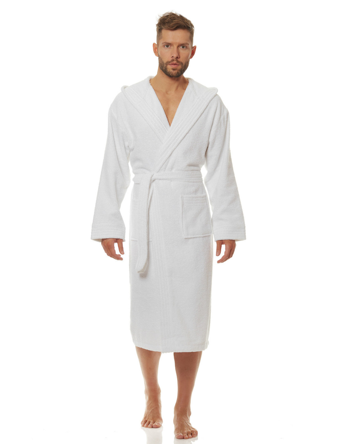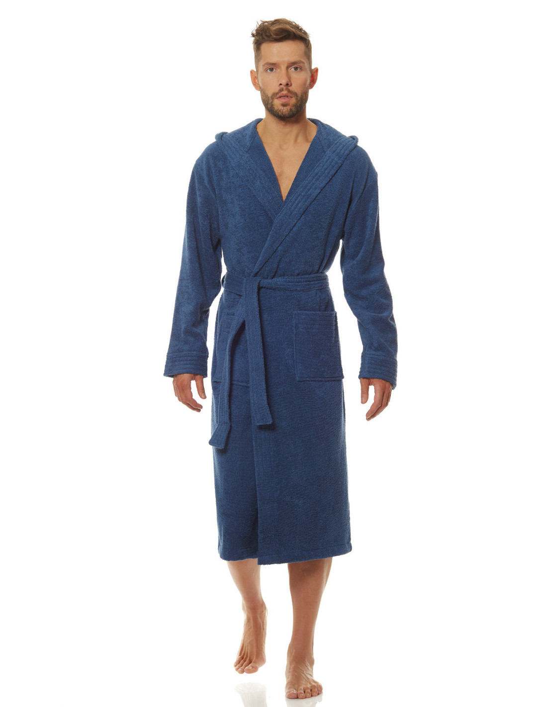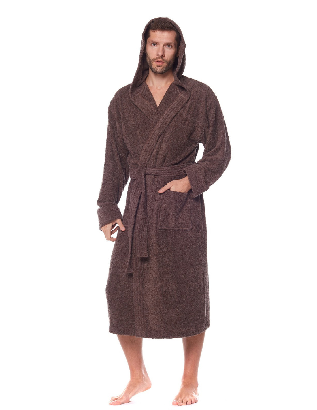 Trumpas vyriškas chalatas su gobtuvu - surišamas per juosmenį, minkšto frotinio trikotažo audinio - išorinės kišenės ant klubų - gražus ir malonus liesti, užtikrina dėvėjimo patogumą