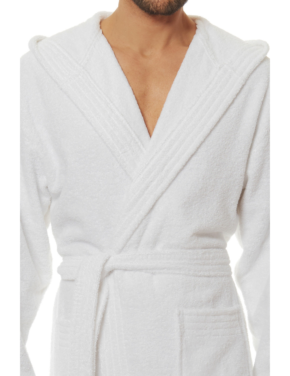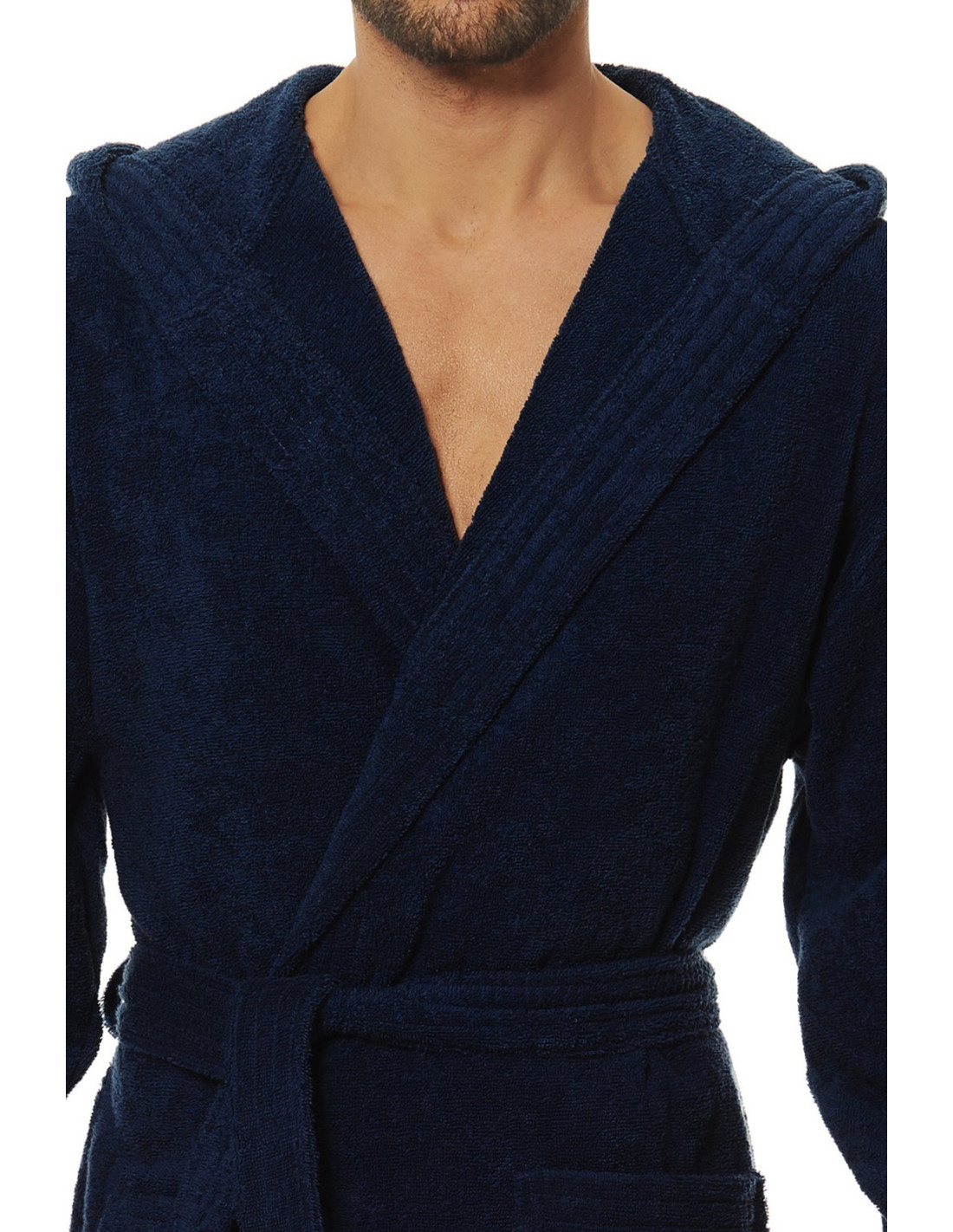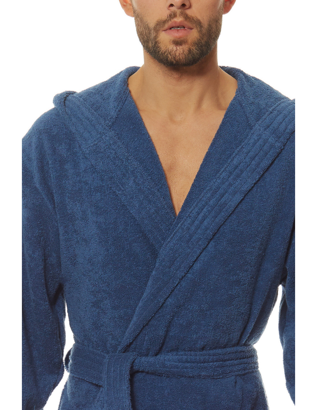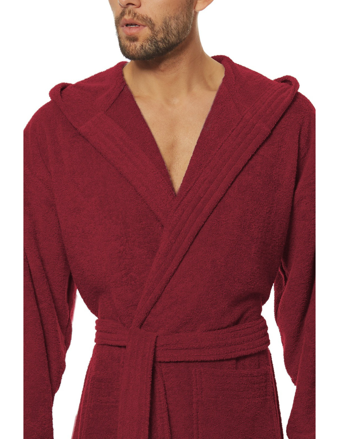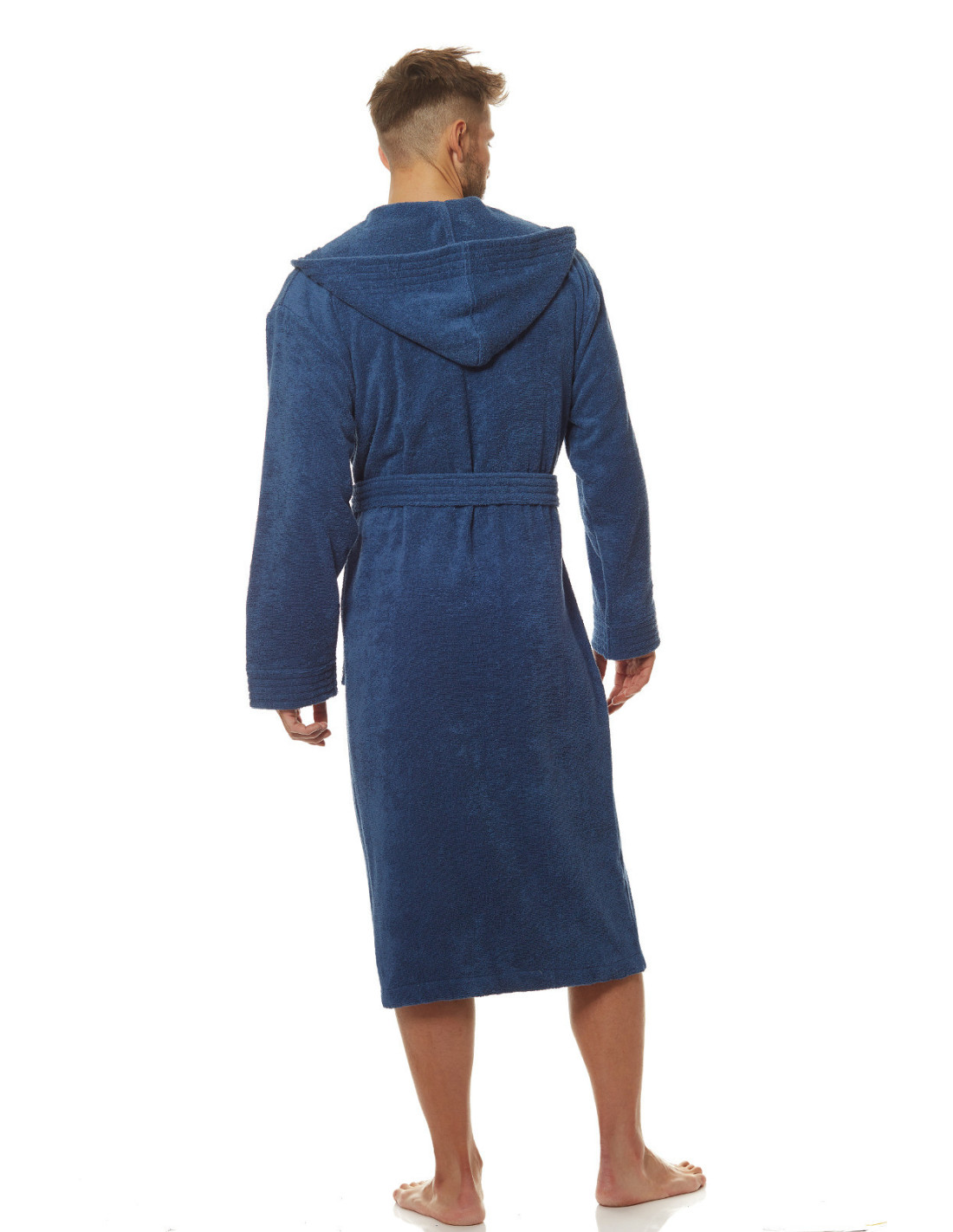 Trumpas vyriškas chalatas su gobtuvu - surišamas per juosmenį, minkšto frotinio trikotažo audinio - išorinės kišenės ant klubų - gražus ir malonus liesti, užtikrina dėvėjimo patogumą