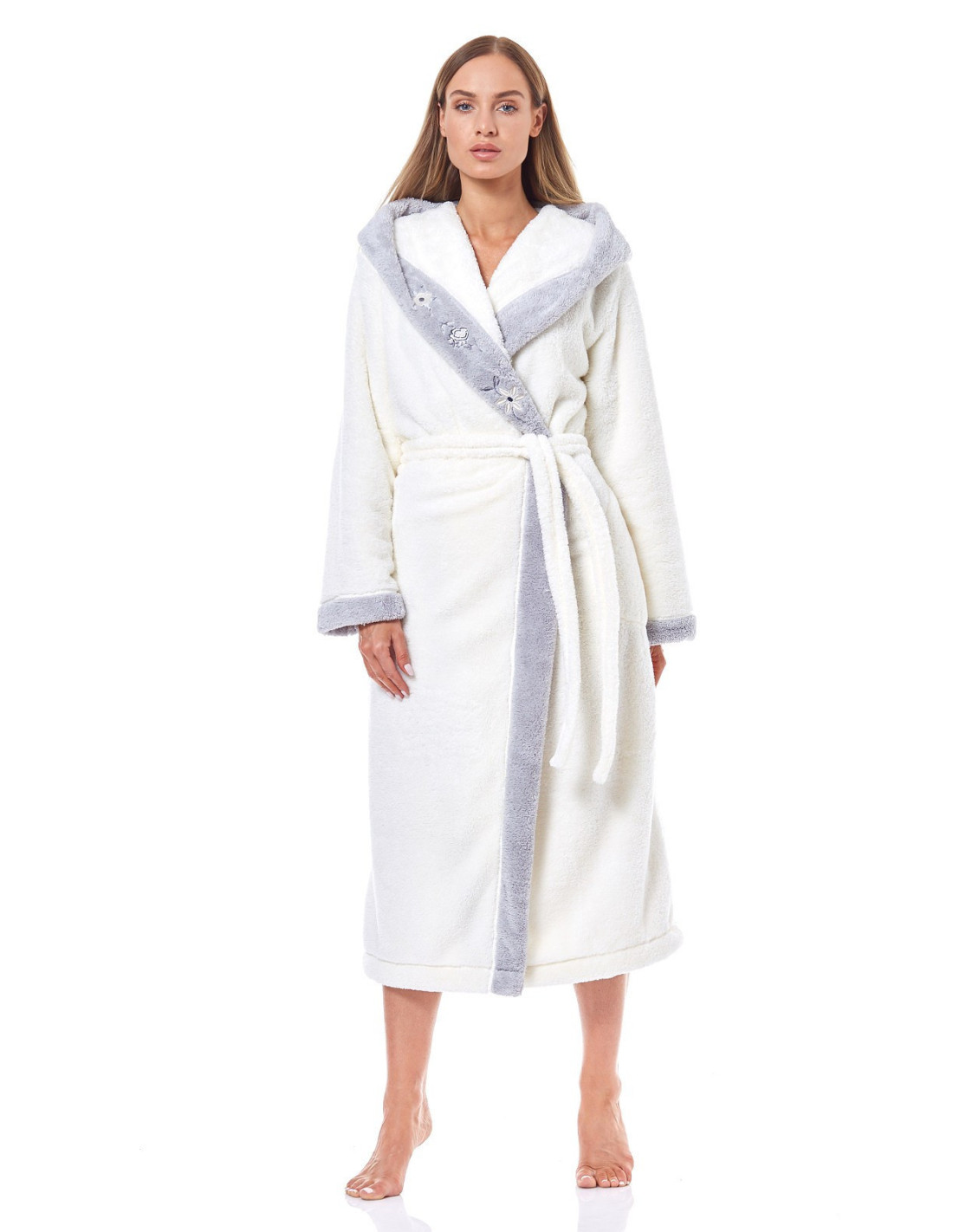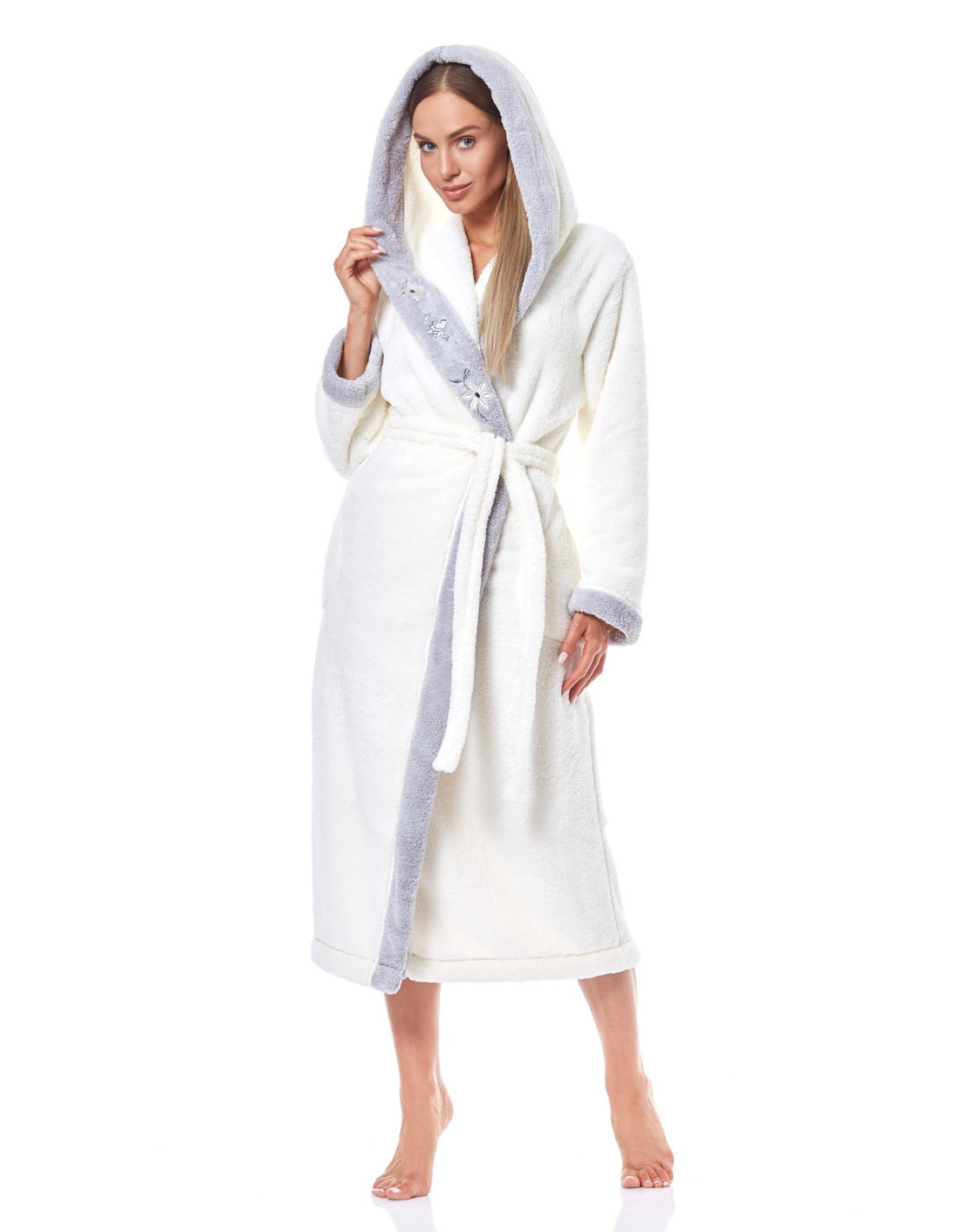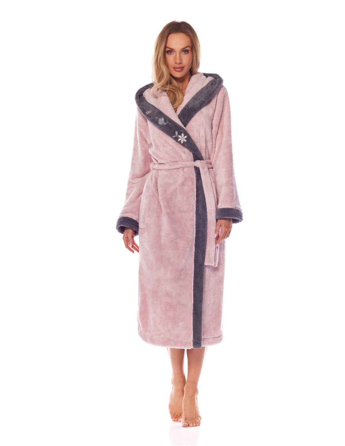 Ilgas, patogus moteriškas chalatas - iš minkšto trikotažo su gobtuvu - rankovės ir kraštai puošti kontrastingais apvadais - subtilus gėlių siuvinėjimas ant krūtinės - juosmens užrišimas - šoninės kišenės