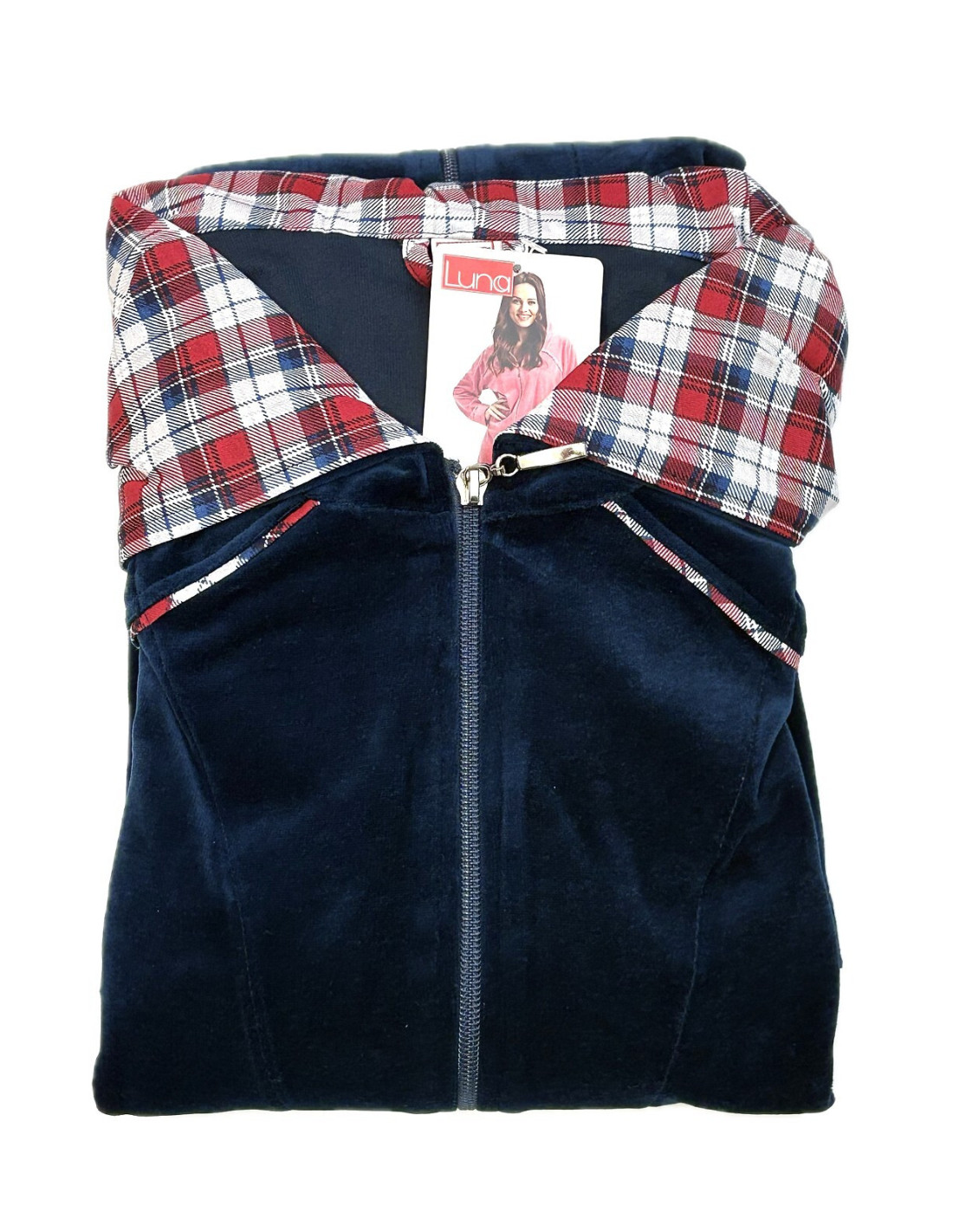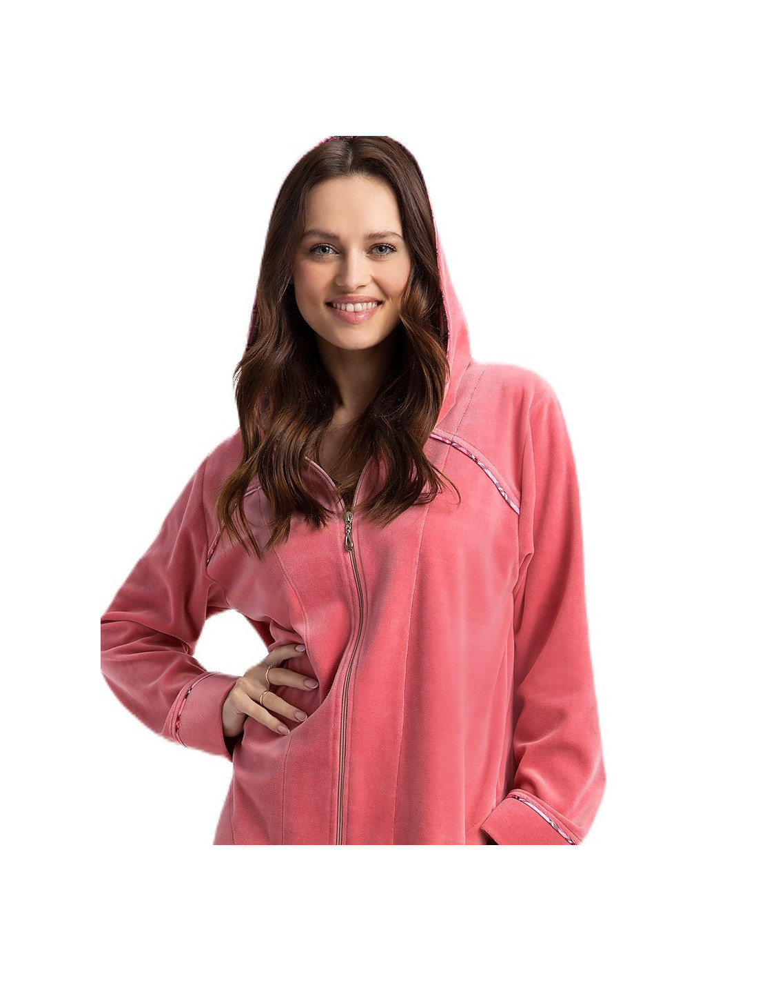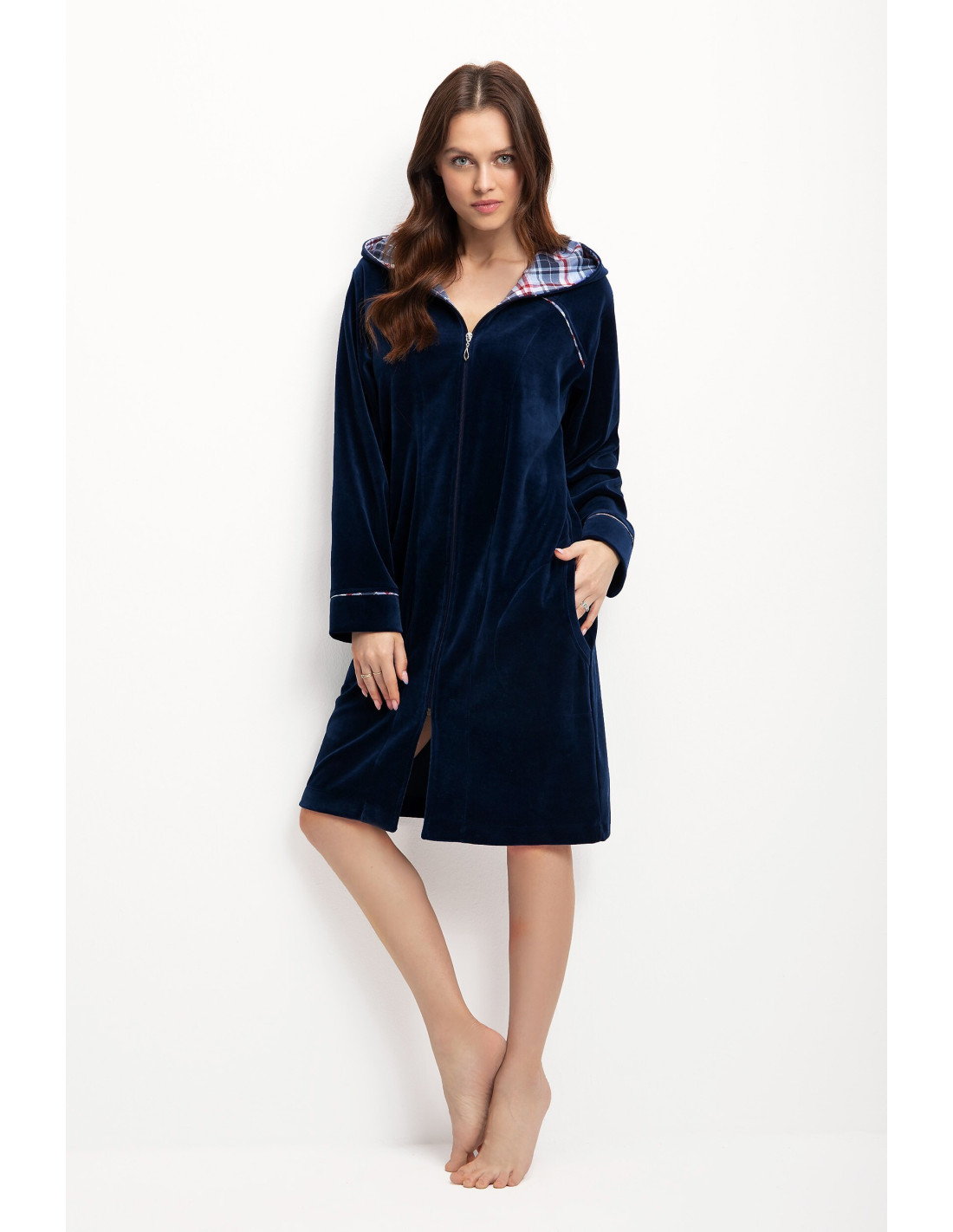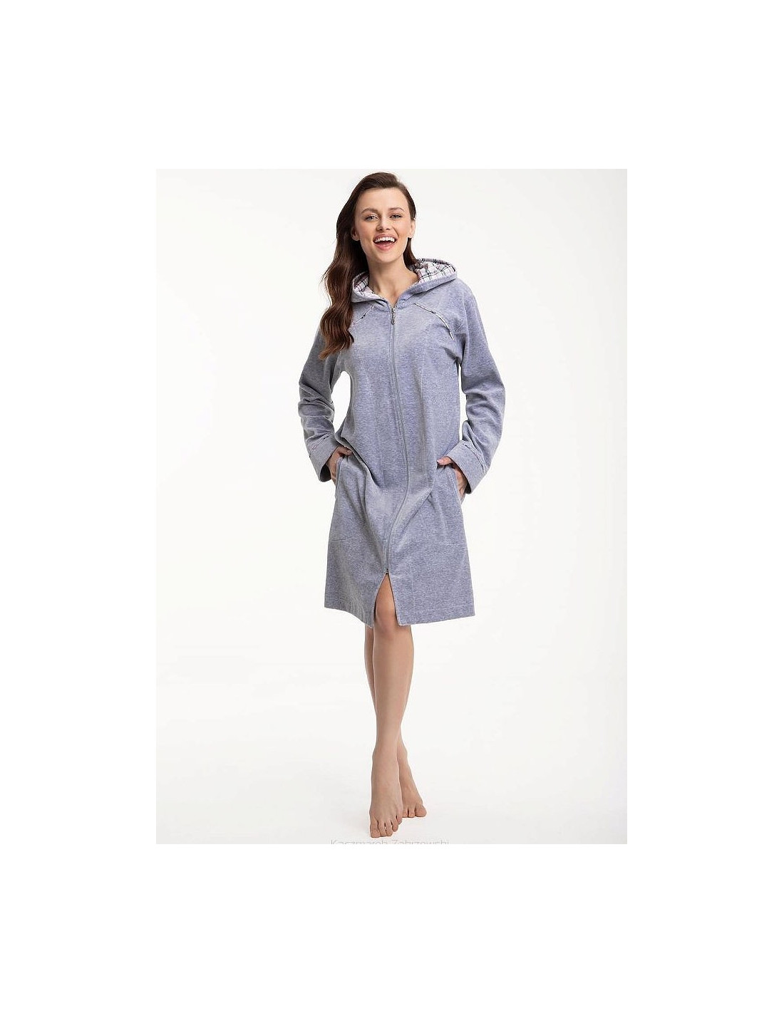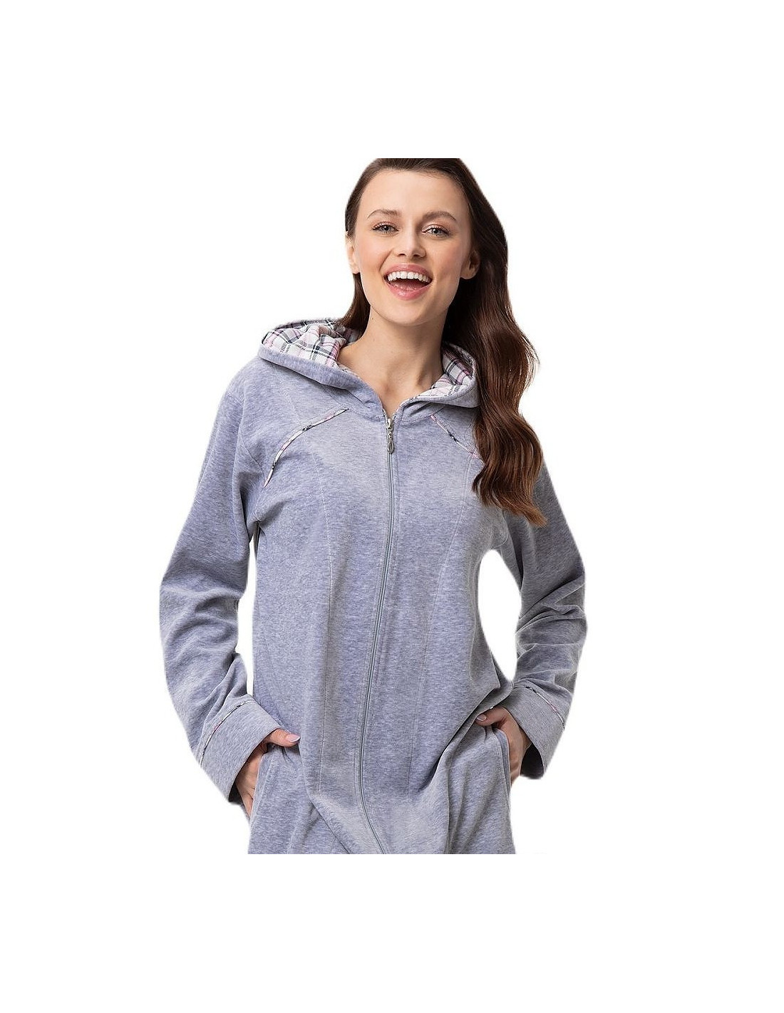 Moteriškas chalatas su gobtuvu - malonus ir švelnus liesti - užsegamas užtrauktuku - patogios kišenės ant klubų - rankogaliai, kišenės ir gobtuvas apsiūti languotu audiniu