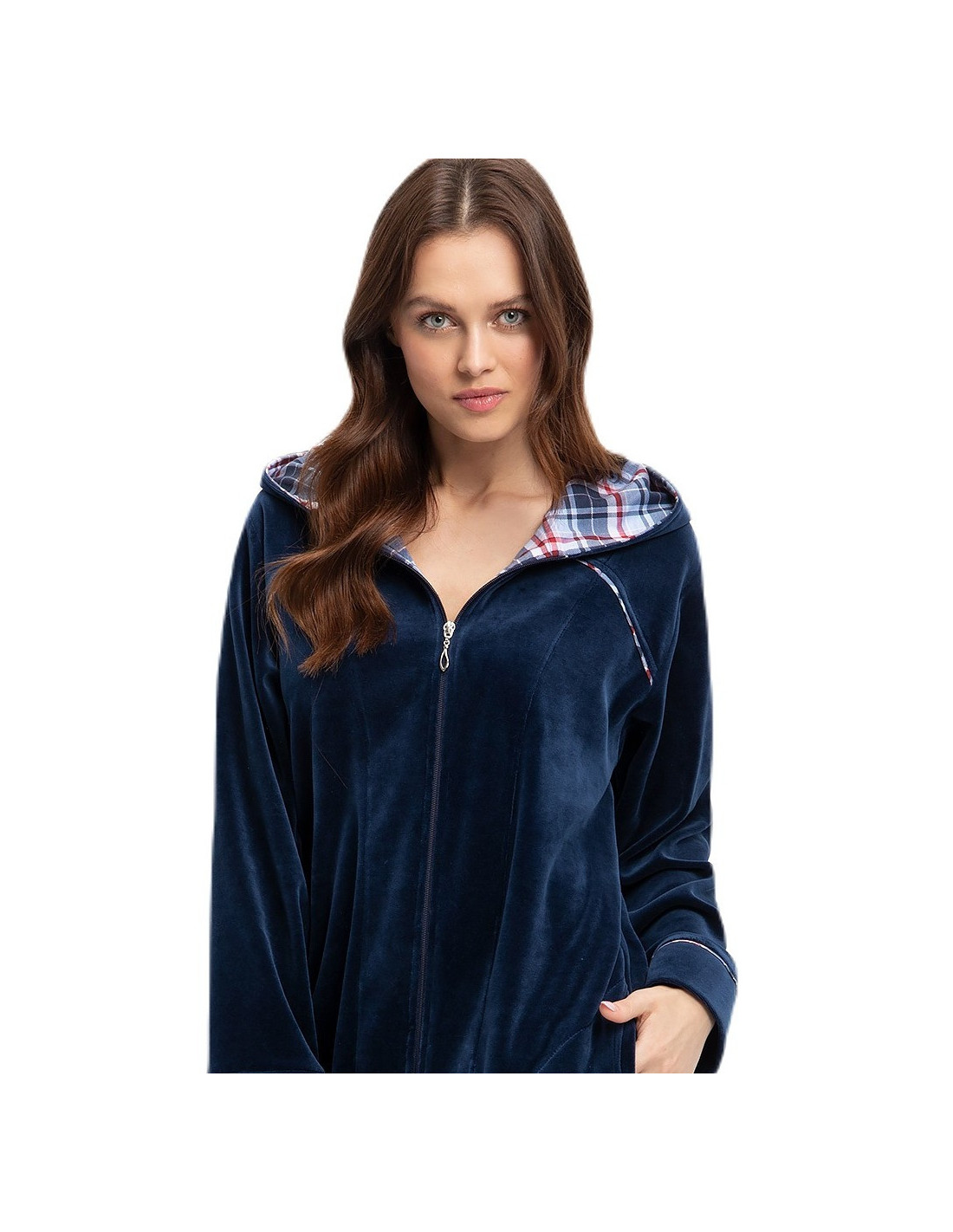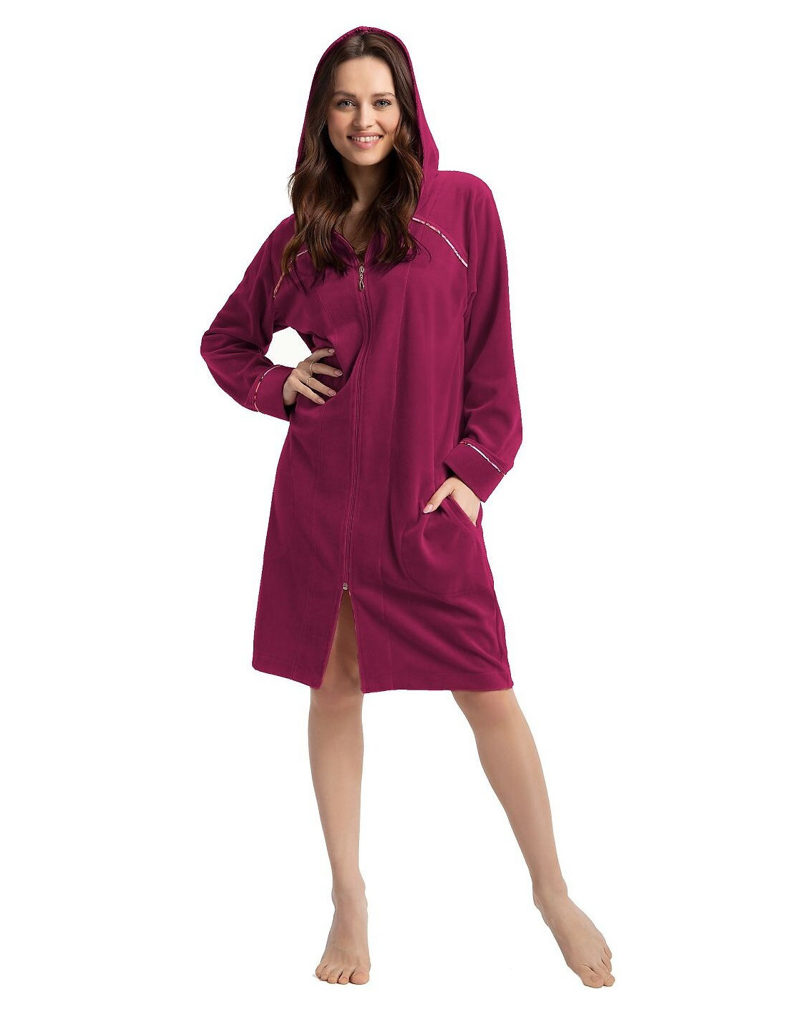 Moteriškas chalatas su gobtuvu - malonus ir švelnus liesti - užsegamas užtrauktuku - patogios kišenės ant klubų - rankogaliai, kišenės ir gobtuvas apsiūti languotu audiniu