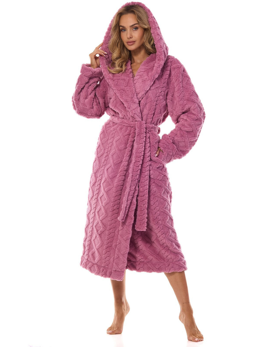 Moteriškas ilgas chalatas su gobtuvu - minkštas trikotažinis audinys su reljefiniu iškiliu raštu - ilgomis rankovėmis - surišamas per juosmenį - patogios kišenės ant klubų