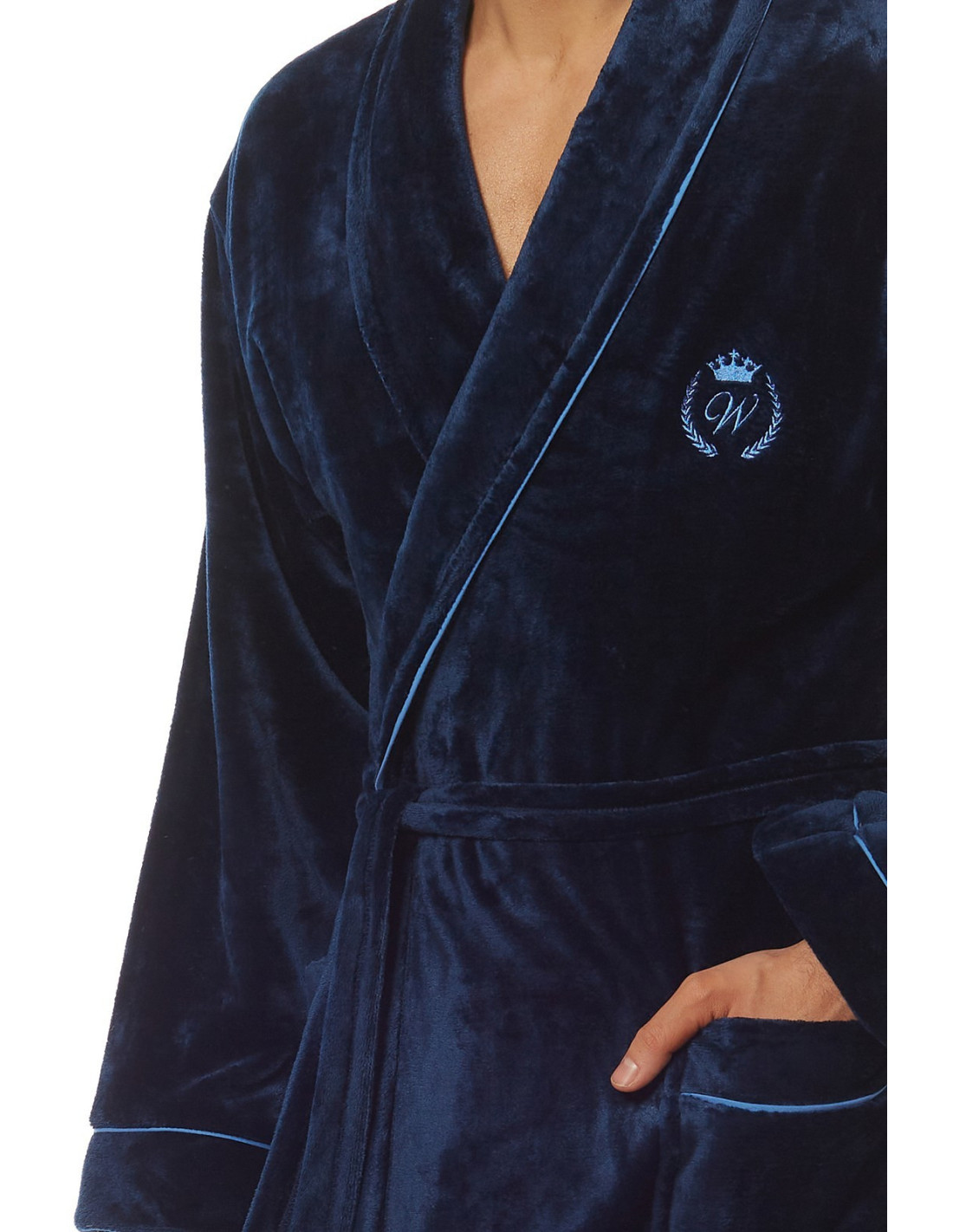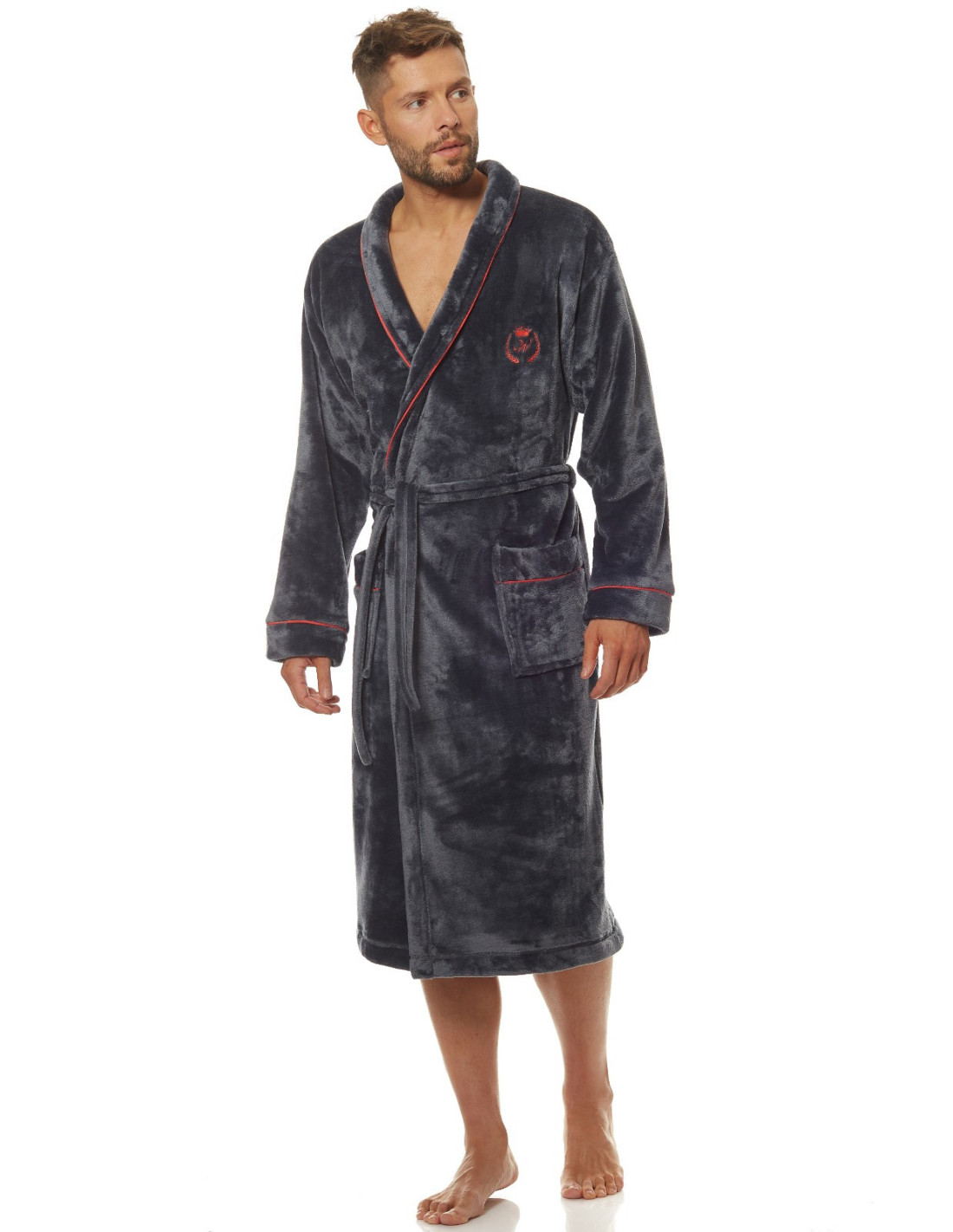 Klasikinis vyriškas chalatas - malonus, minkštas trikotažas - šaliko apykaklė - apsiūtas kontrastingomis juostelėmis - dekoratyvinis siuvinėjimas ant krūtinės - juosmens raištis - patogios kišenės ant klubų