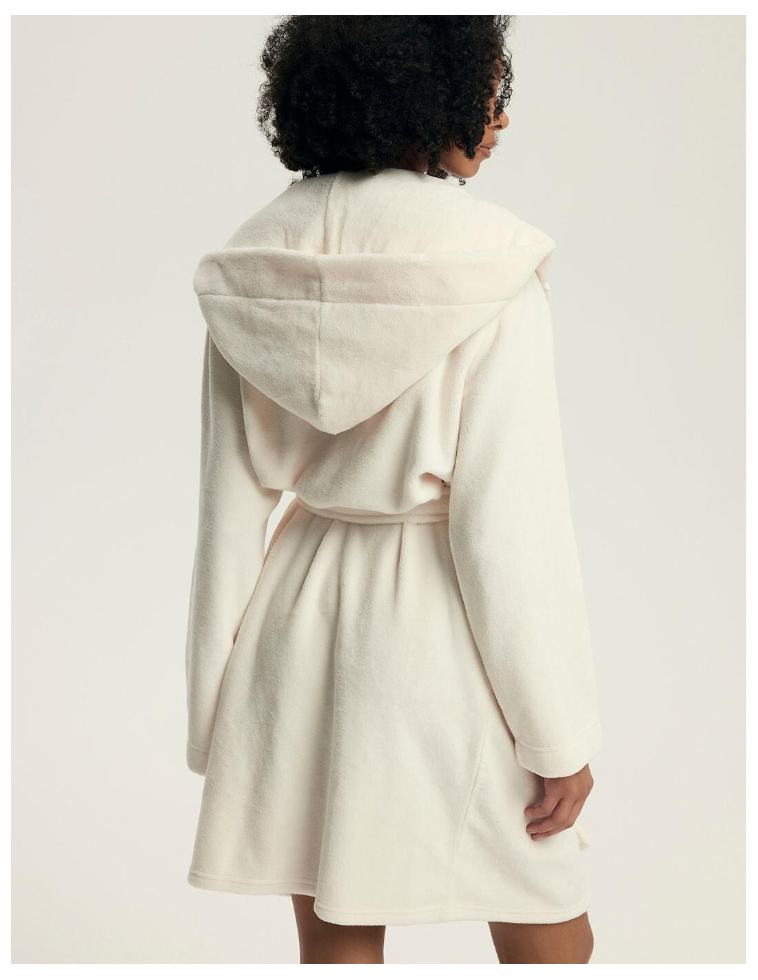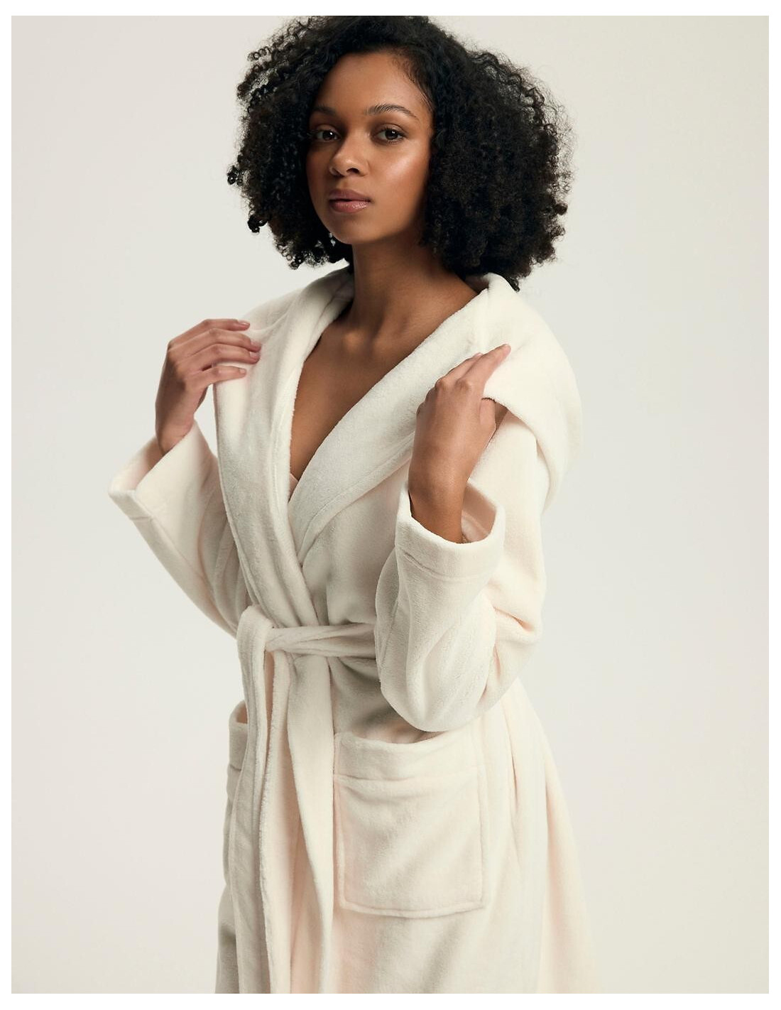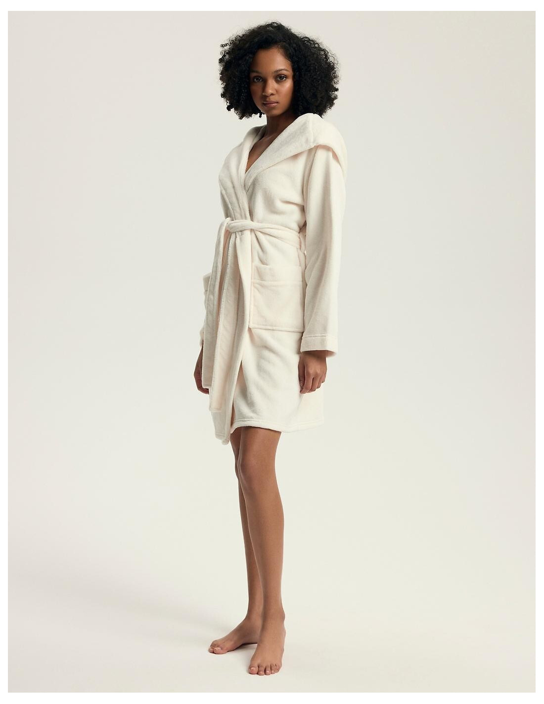 Moteriškas chalatas su gobtuvu - minkštas, plonesnis minkšto trikotažo audinys - ilgomis rankovėmis - surišamos per juosmenį, su kišenėmis - ilgis iki kelių