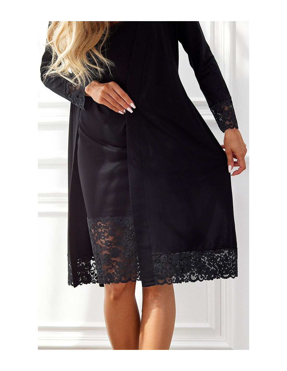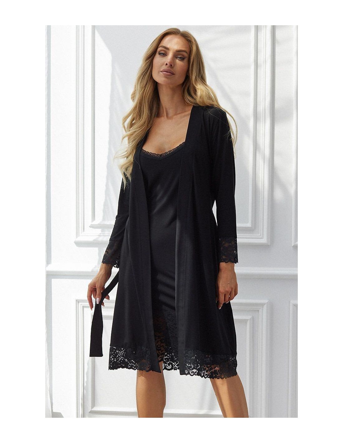 Moteriškas chalatas- pagamintas iš aukštos kokybės viskozės- 7/8 ilgio rankovės- surišamas ties juosmeniu- rankogaliai ir apačia užbaigti ažūriniais nėriniais