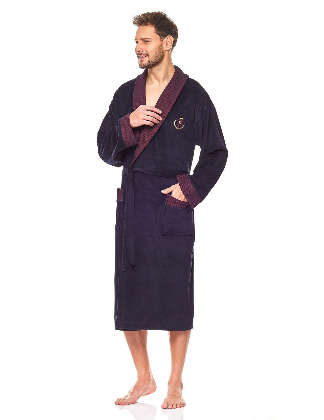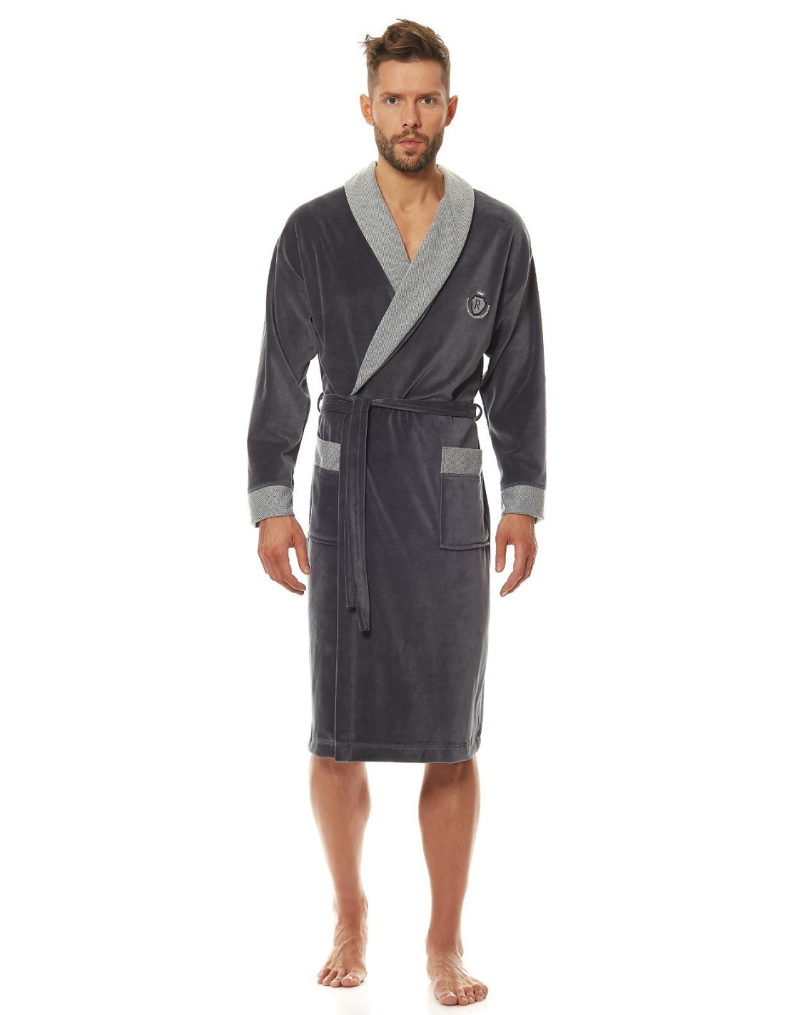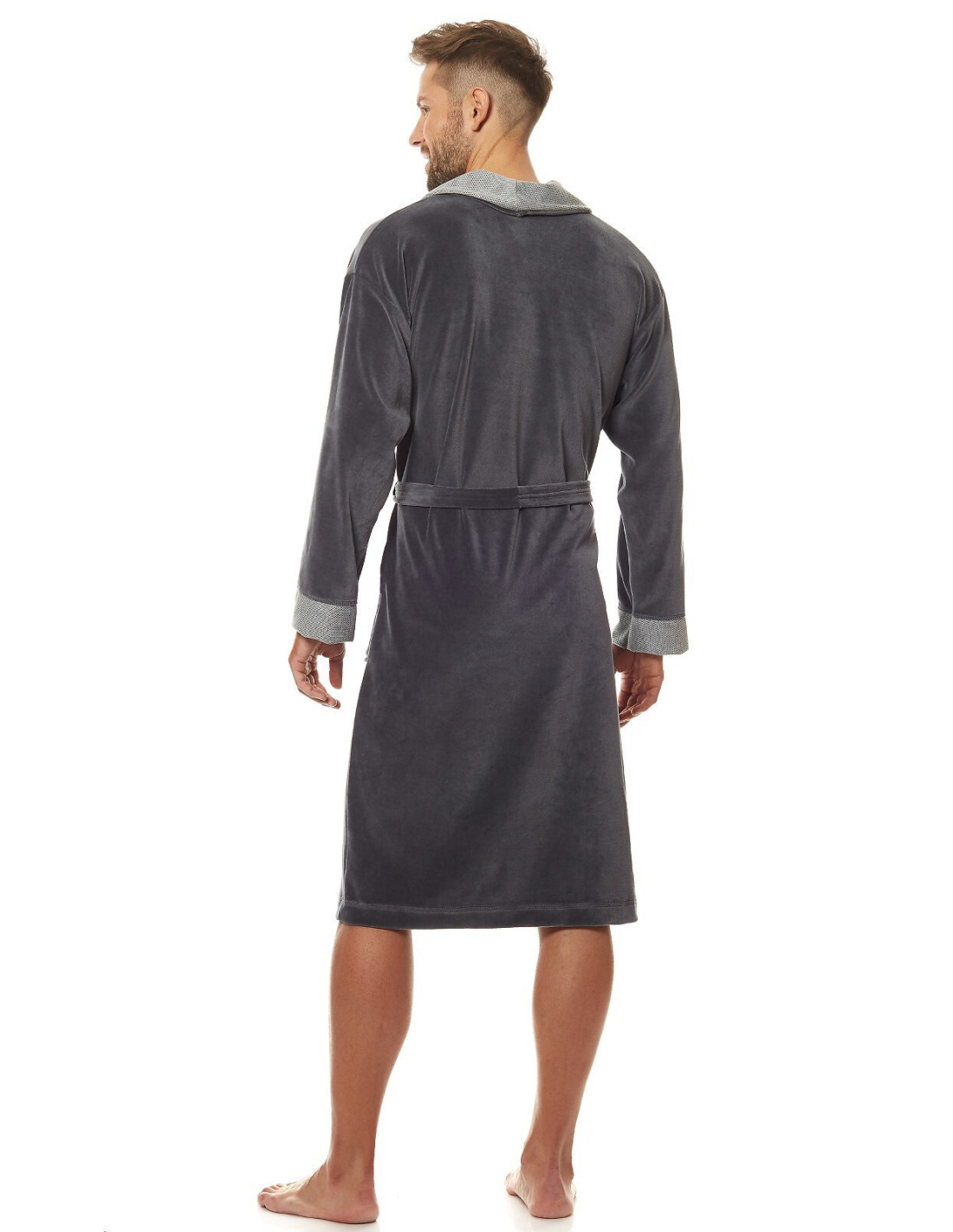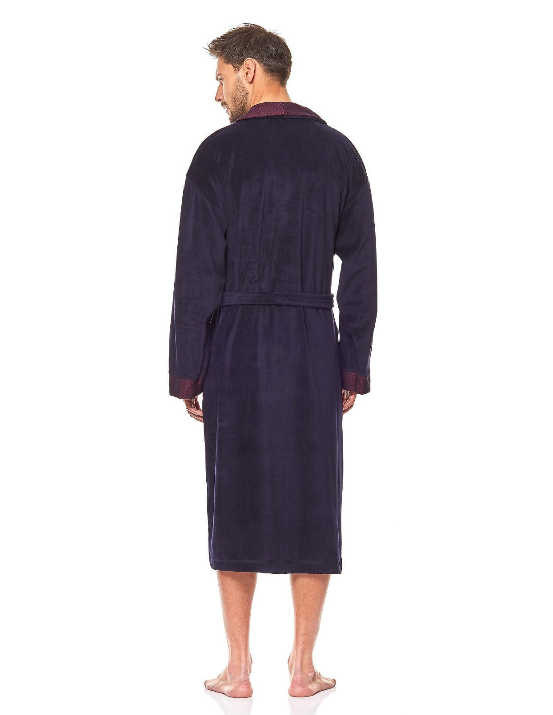 Welurowy szlafrok męski - długi z szalowym kołnierzem - wiązany w pasie - na wysokości bioder dwie kieszenie - mankiety, kołnierz i kieszenie wykończone wzorzystą dzianiną - na wysokości klatki piersiowej ozdobna aplikacja
