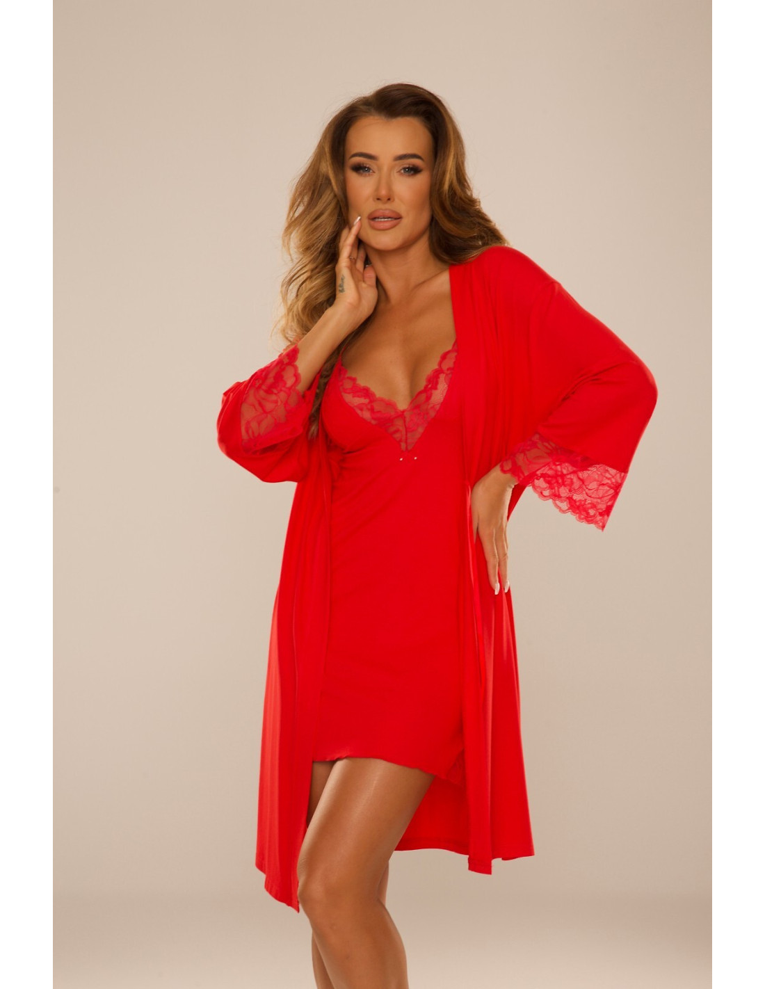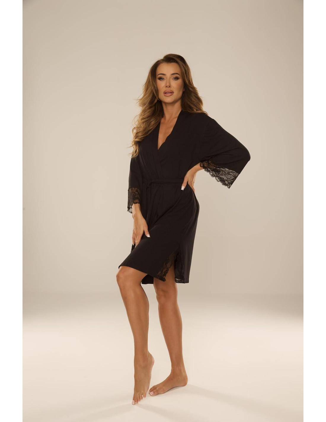 Szlafrok damski- z wysokiej jakości wiskozy- rękaw o długości 7/8- wiązany w pasie- mankiety i rozcięcia u dołu wykończone ażurowa koronką