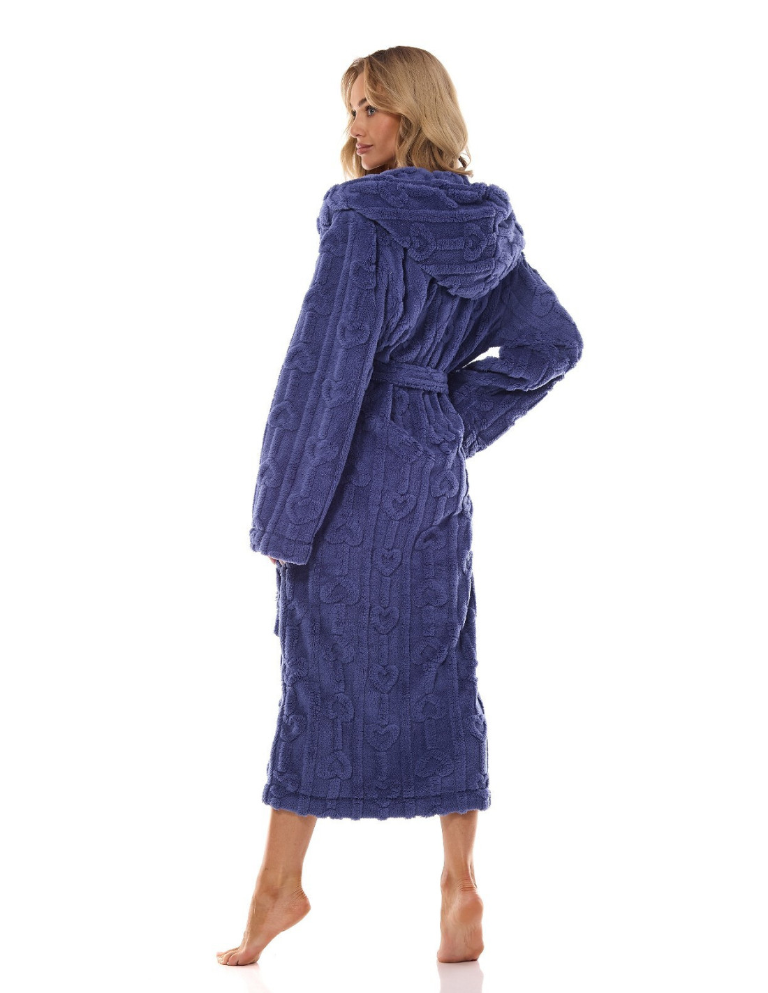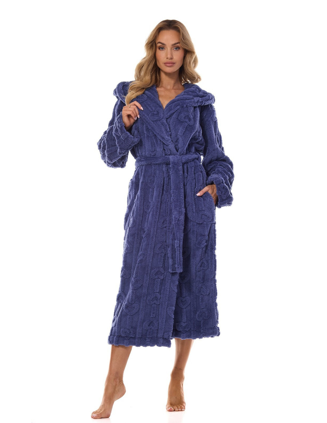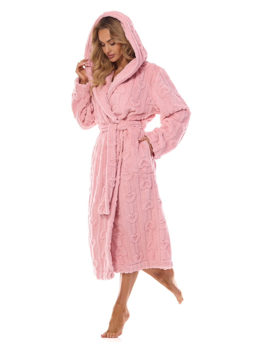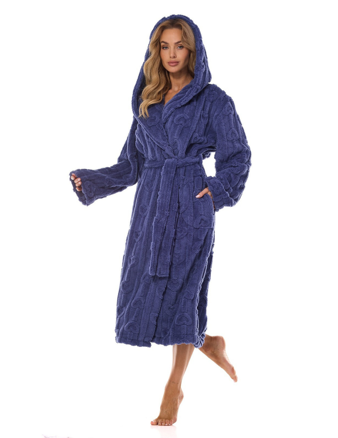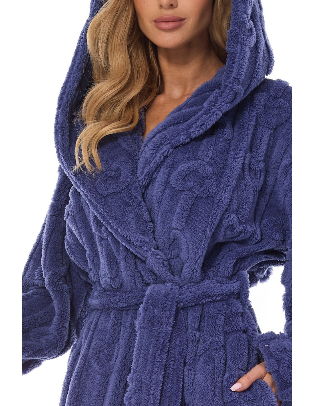Długii szlafrok damski z kapturem - miękka dzianina z wytłaczanym, wypukłym wzorem - długi rękaw - wiązany w pasie - dwie zewnętrzne kieszenie