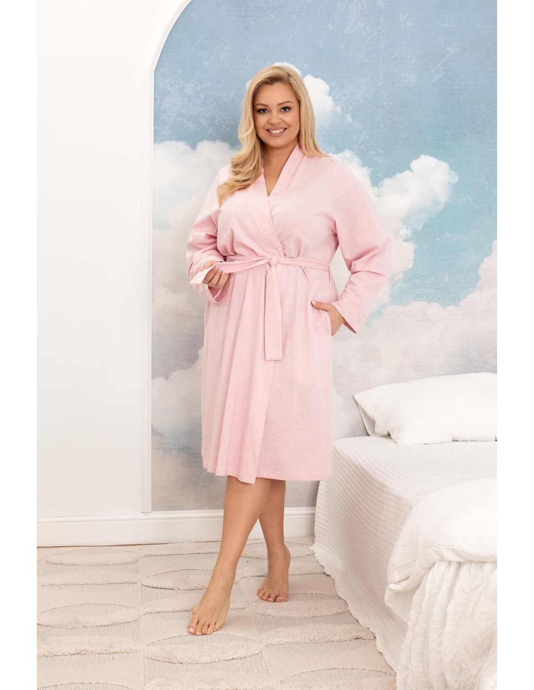 Szlafrok damski - z wysokiej kokybės melanžinės dzianiny - długi rękaw - wiązany w pasie - na wysokości bioder kieszenie