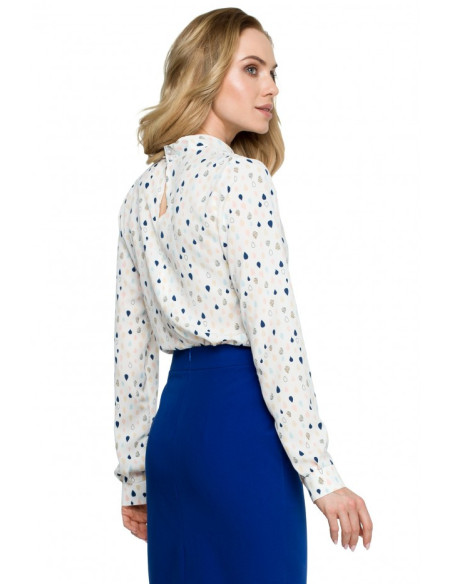 - 95% poliesteris - 5% elastanas Elegantiška, erdvi palaidinė su neįprastu raštu ir viduryje susipynusia stovinčia apykakle, derinama su kelnėmis arba sijonu, papildys biuro įvaizdį ir puikiai tiks ne tik darbe. INFORMACIJA APIE GAMINĮ: šilkinis liesti margintas audinys nesukirptas pagal užsakymą su mazgu apykaklės viduryje nugaroje užsegama dviem sagomis ilgos rankovės su dviem sagomis tiesus apačios kraštas mūsų modelis yra 171 cm ūgio ir dėvi S dydžio drabužius