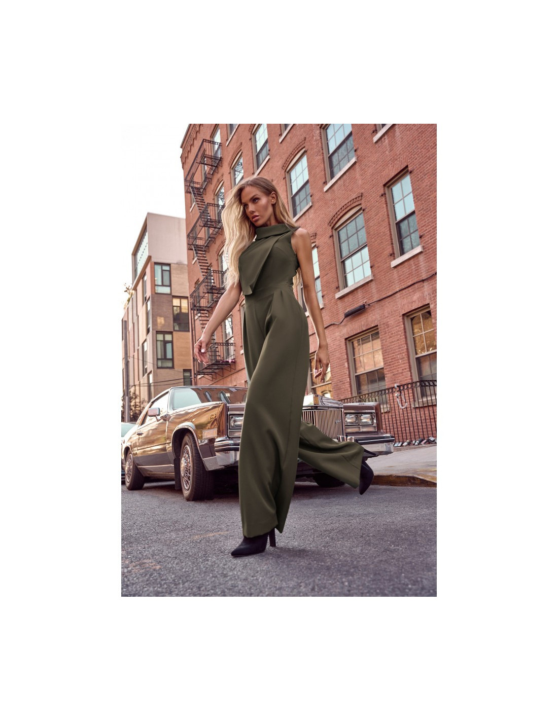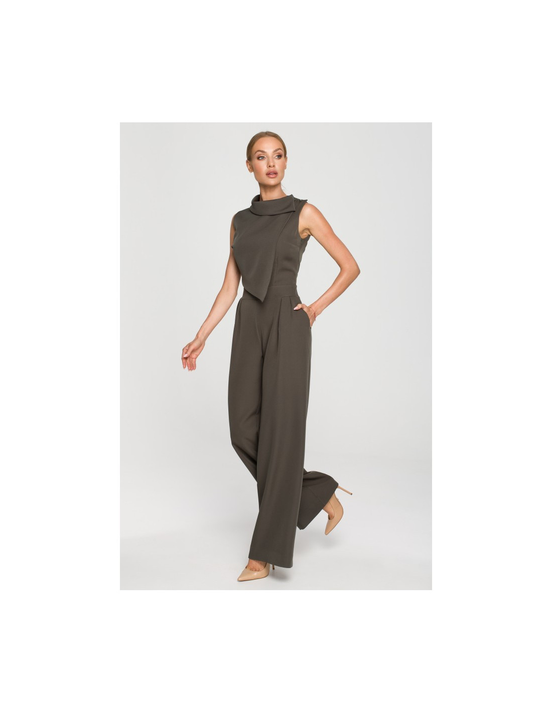 Be one of a kind choosing this original jumpsuit with wide leg design and decorative double layer front sleeveless top featuring high collar and lovely fastening on the shoulder.
