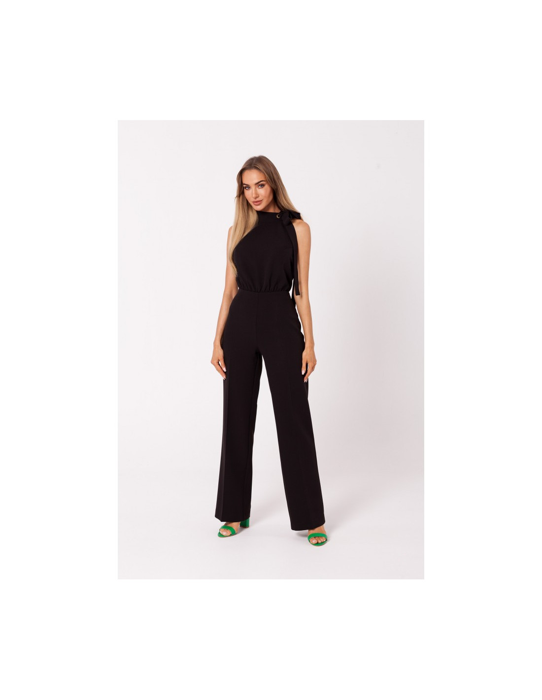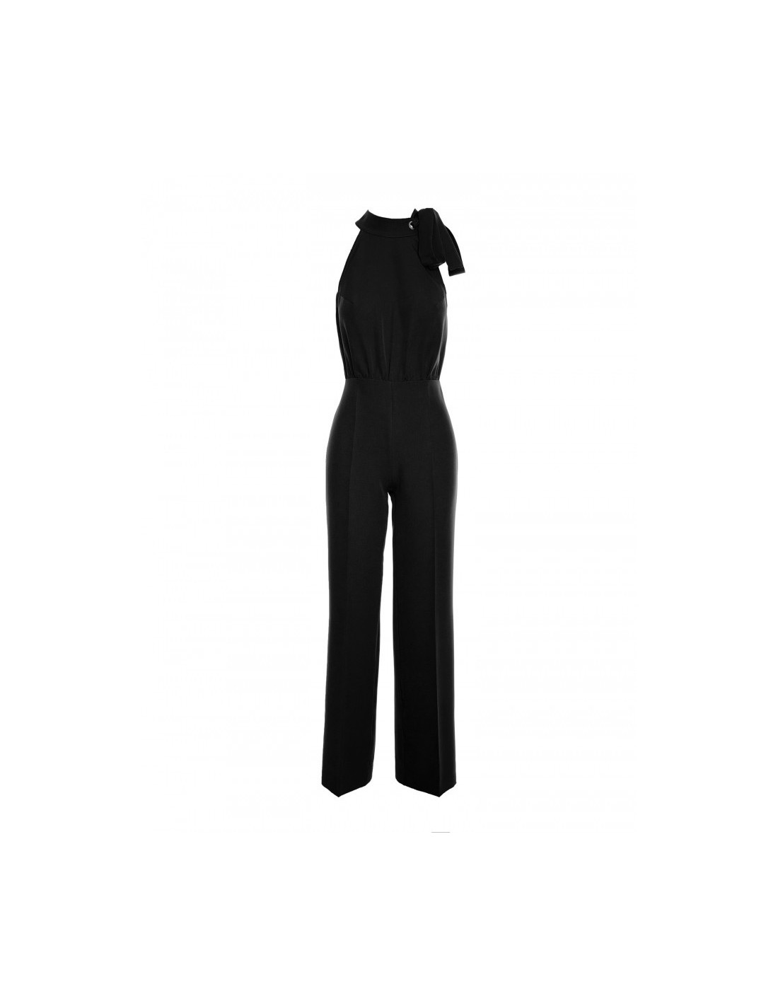 95% polyester 5% elastanase This flattering jumpsuit features a halter neckline with a tie detail finishing. PRODUCT INFORMATION: woven fabric  one-piece jumpsuit with halter neck and a tie detail gathered waistline wide legs with side pockets hidden back zip our model is 171 cm tall and wears size S