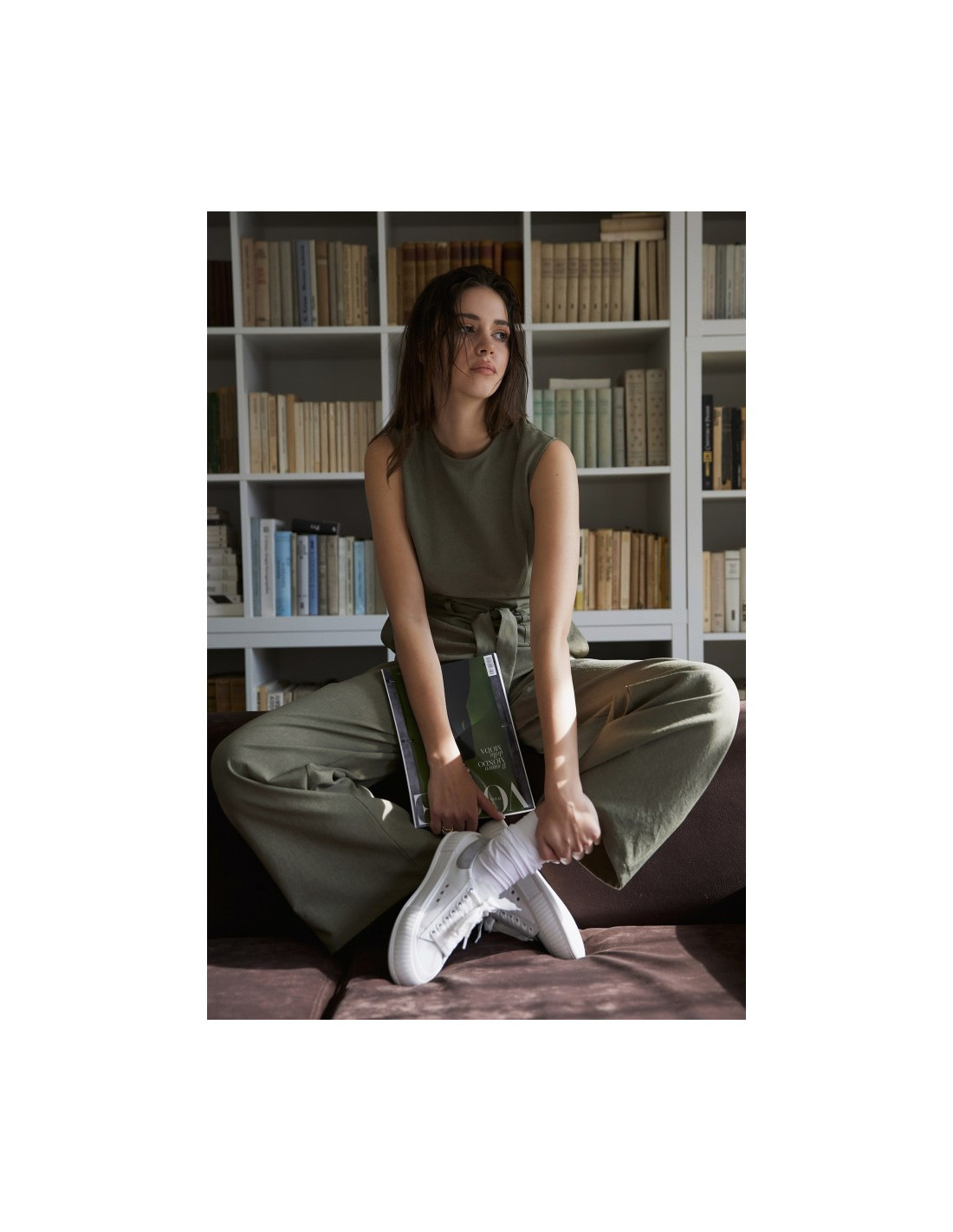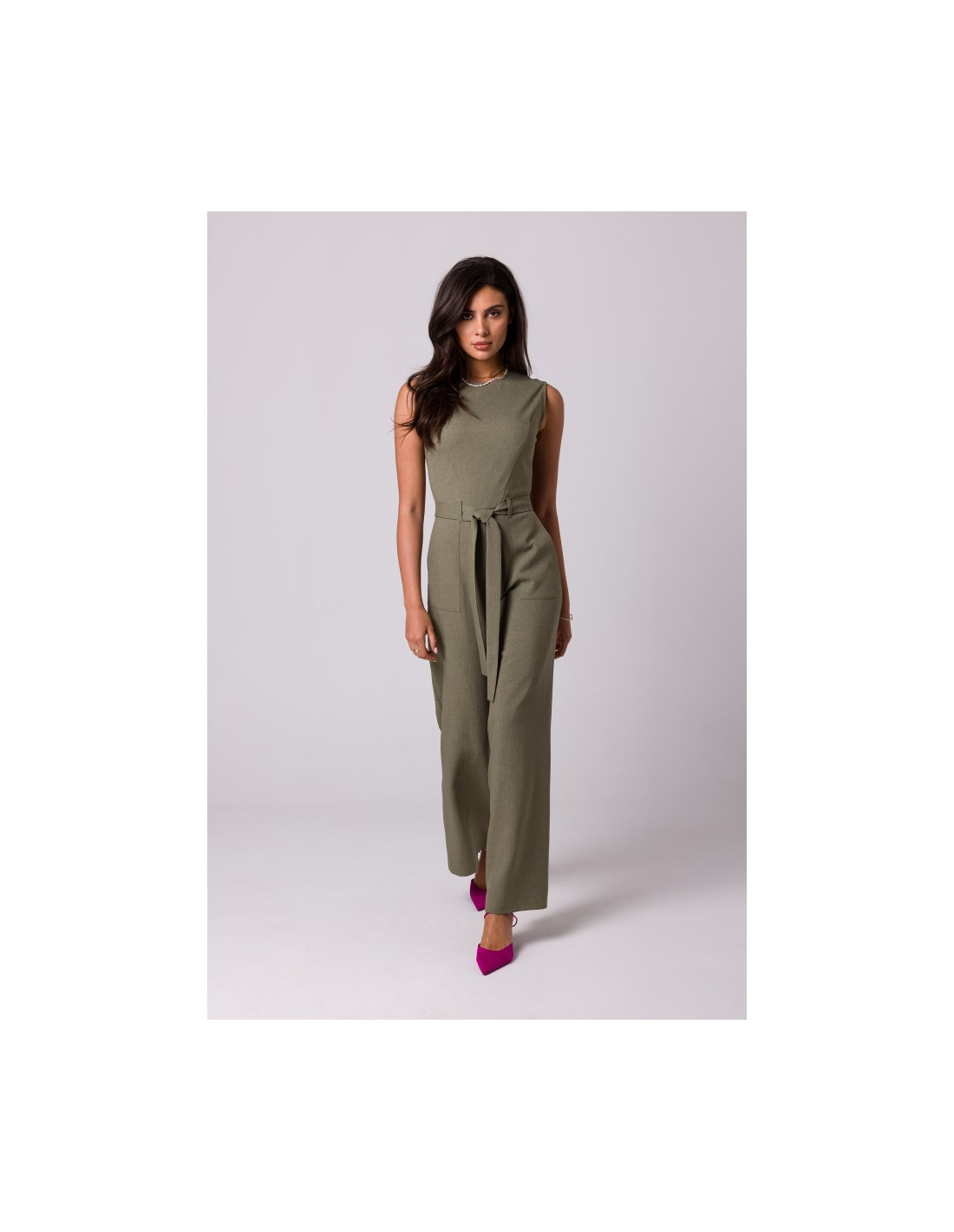 This sleeveless jumpsuit featuring a tie belt and patch pockets can be a versatile and trendy summer piece.