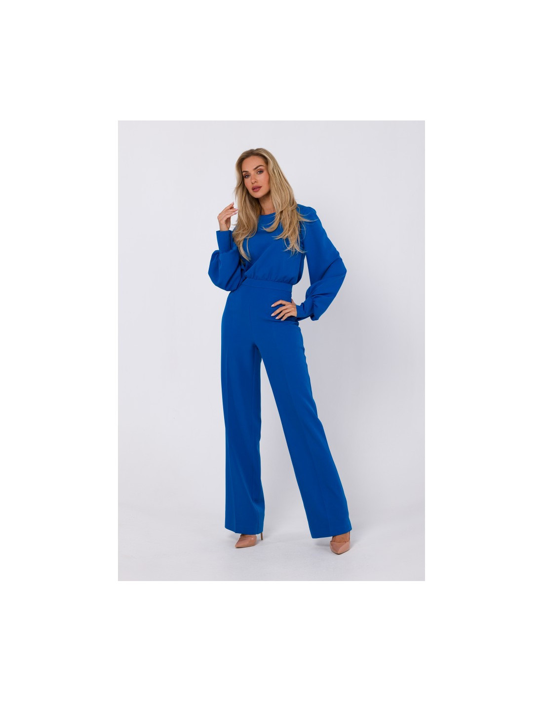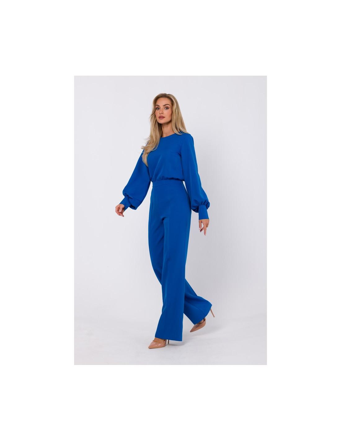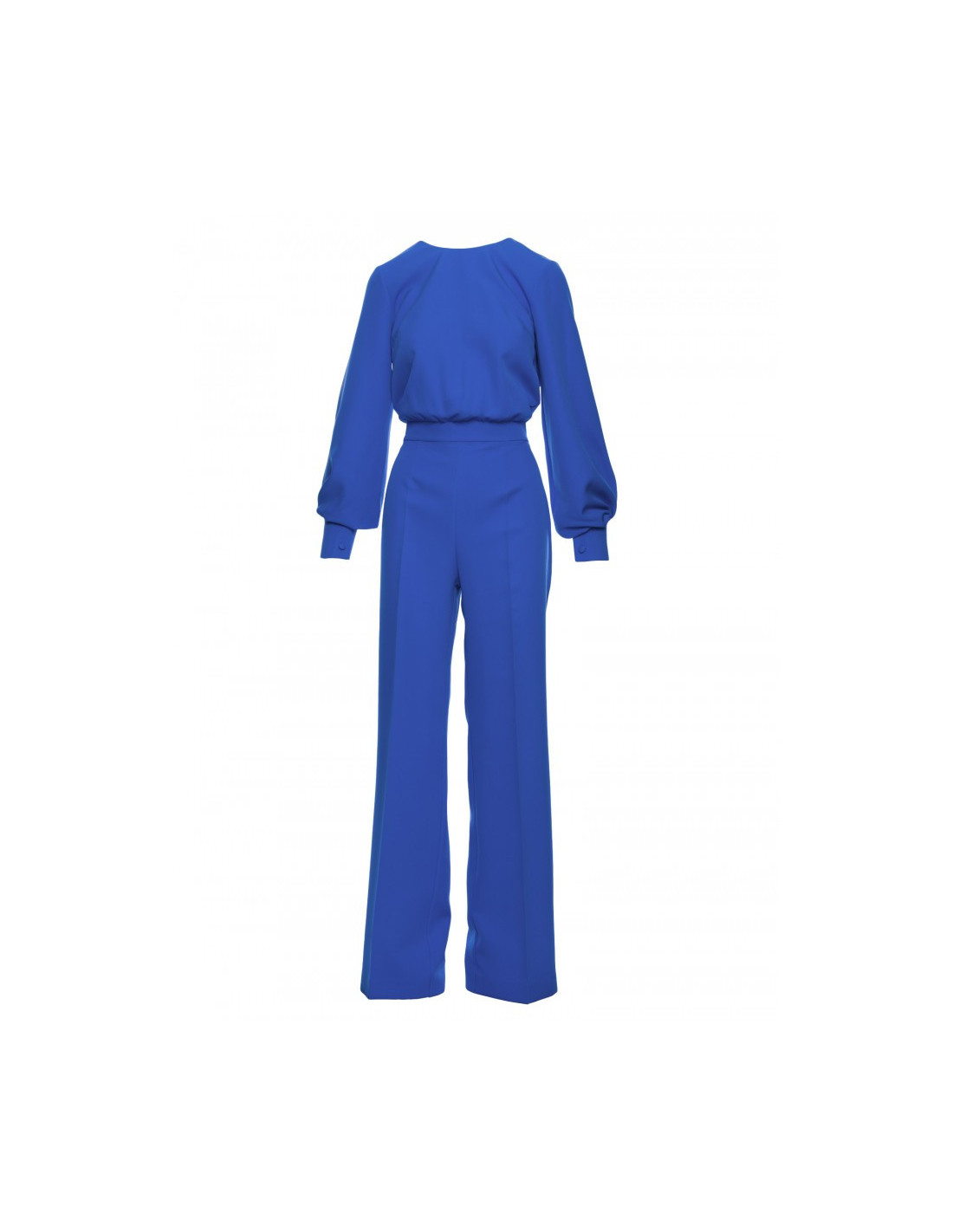95% polyester 5% elastanase PRODUCT INFORMATION: woven fabric one-piece jumpsuit with long bishop sleeves and buttonned cuffs crew neck  decorative button fastening in the back and hidden zip wide creased legs with  unlined our model is 171 cm tall and wears size S Designed and made in Poland