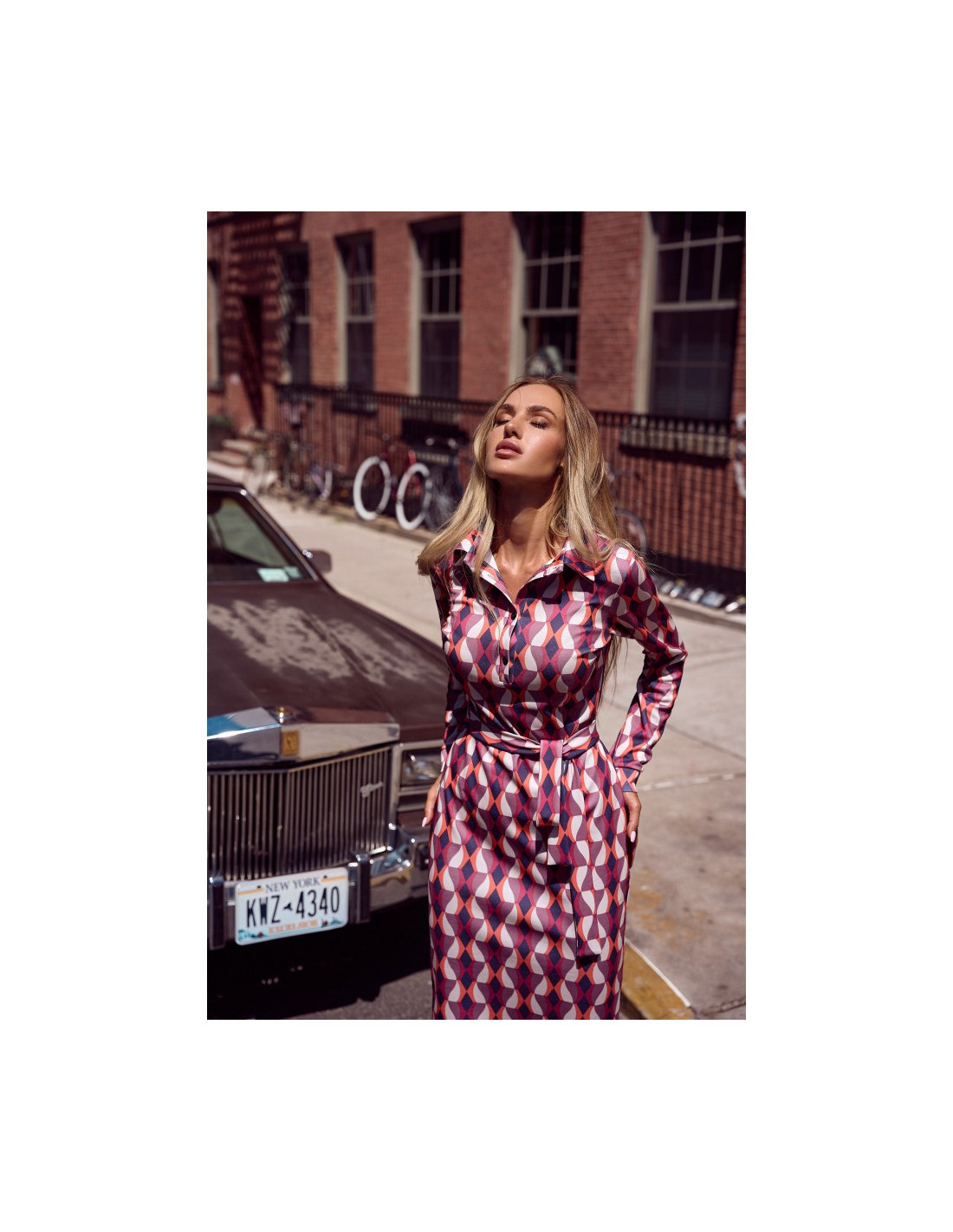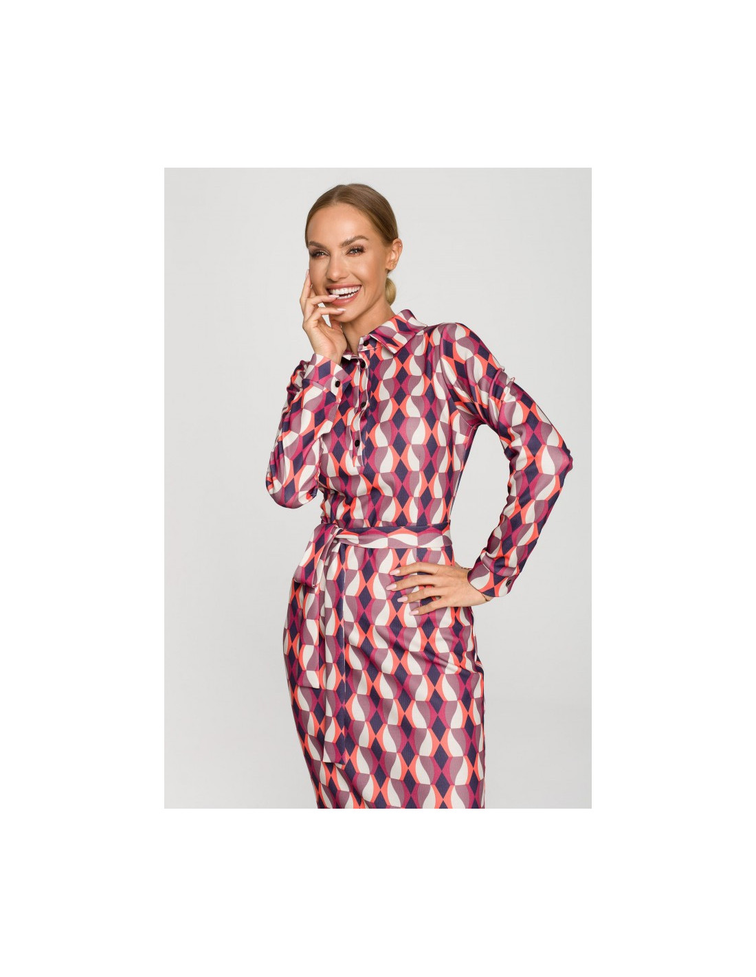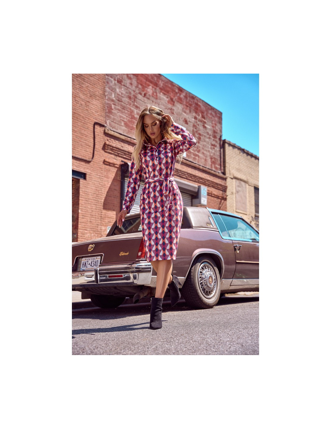 Pencil dress doesn’t need to be boring. If it is cut in knit fabric with original print and details such as a collar, buttoned neckline and a tie belt, it is bound to impress.