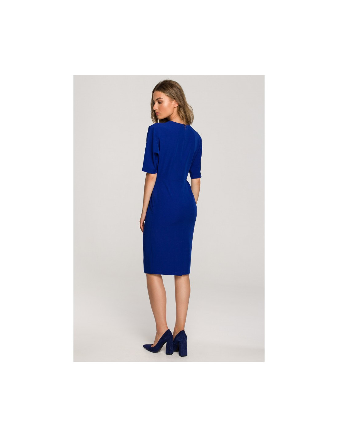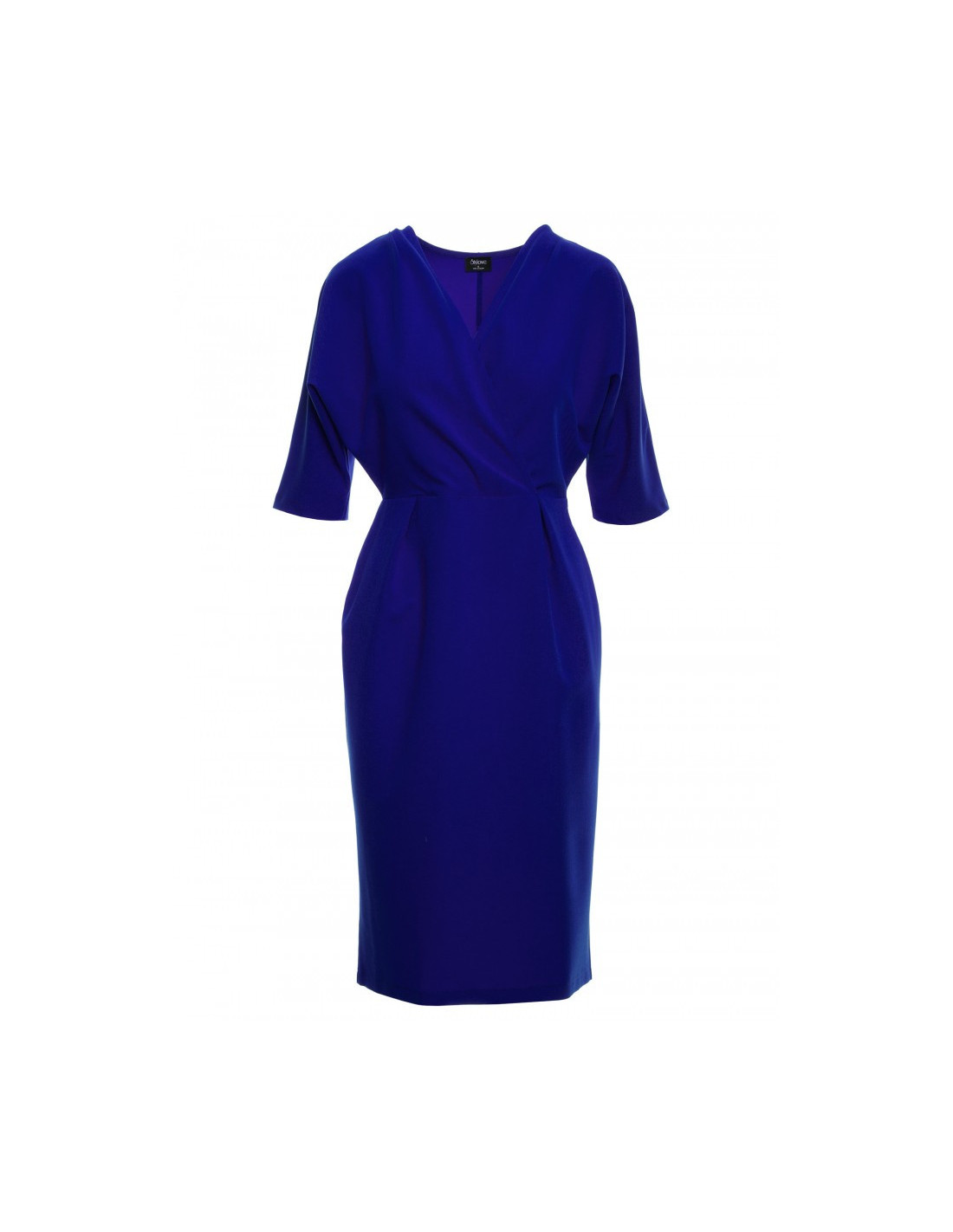 65% polyester 30% viscose 5% elastanase We love everything about this figure flattering sheath - the wrap top with batwing sleeves and pencil cut skirt. PRODUCT DETAILS:      woven fabric wrap dress short sleeves below knee length hidden back zip unlined our model is 174 cm tall and wears size S