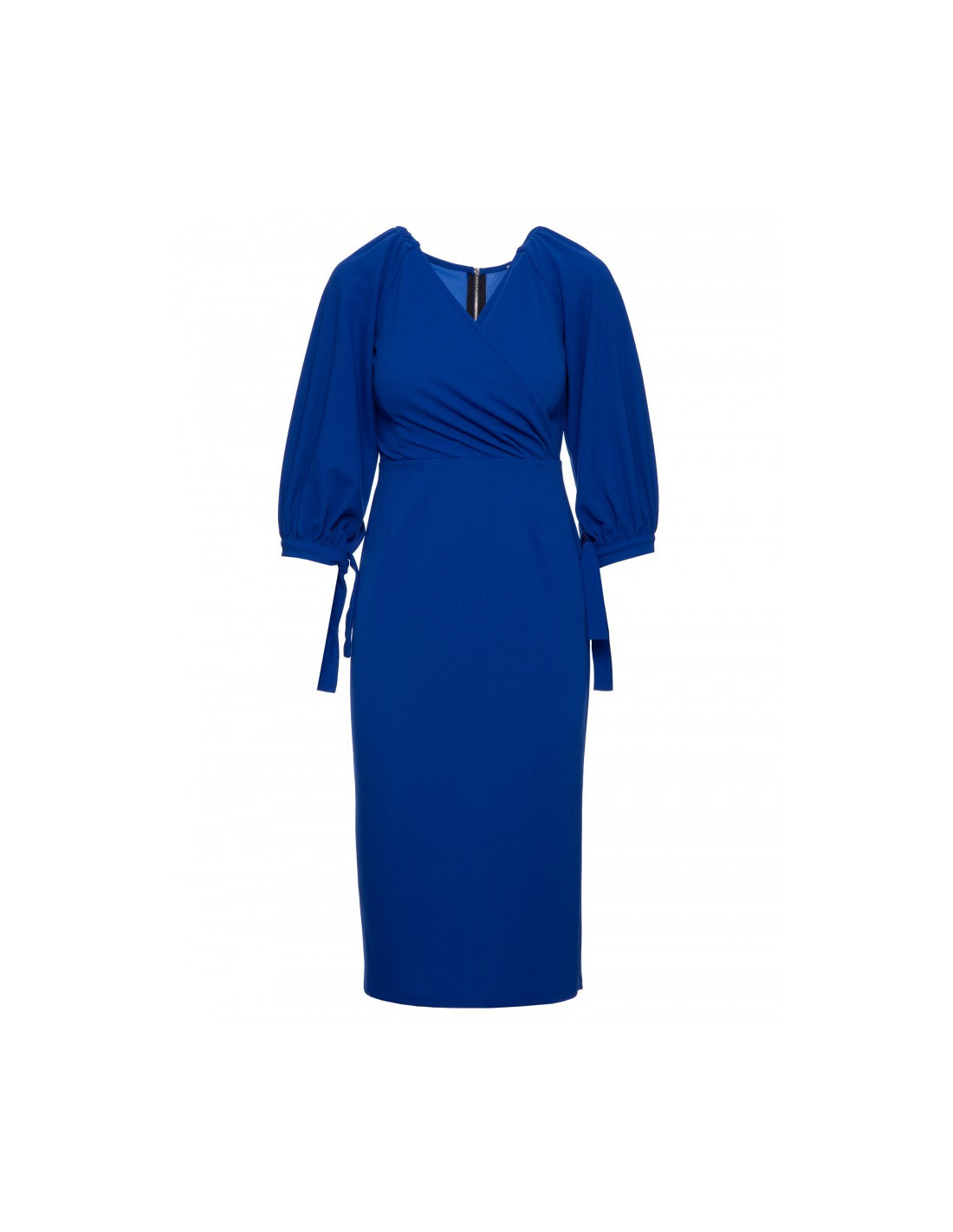 96% polyester 4% lycra Wrap top with the possibility to slide it off shoulder and decorative tie detail sleeves - it’s a dress to fall in love with. PRODUCT DETAILS:      knit fabric pencil dress with wrap top V-neck with the possibilty to drop it off the shoulders below knee length decorative back zip unlined our model is 175 cm tall and wears size S