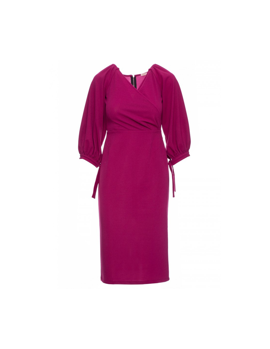 96% polyester 4% lycra Wrap top with the possibility to slide it off shoulder and decorative tie detail sleeves - it’s a dress to fall in love with. PRODUCT DETAILS:      knit fabric pencil dress with wrap top V-neck with the possibilty to drop it off the shoulders below knee length decorative back zip unlined our model is 175 cm tall and wears size S