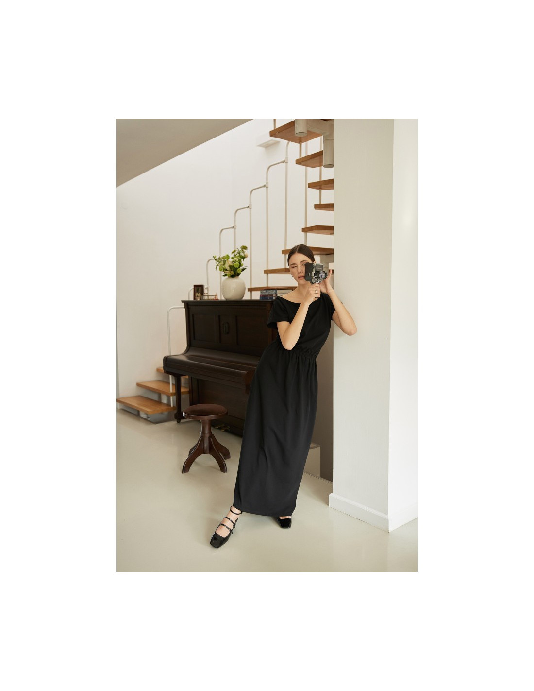 maxi length dress with an off-shoulder neckline