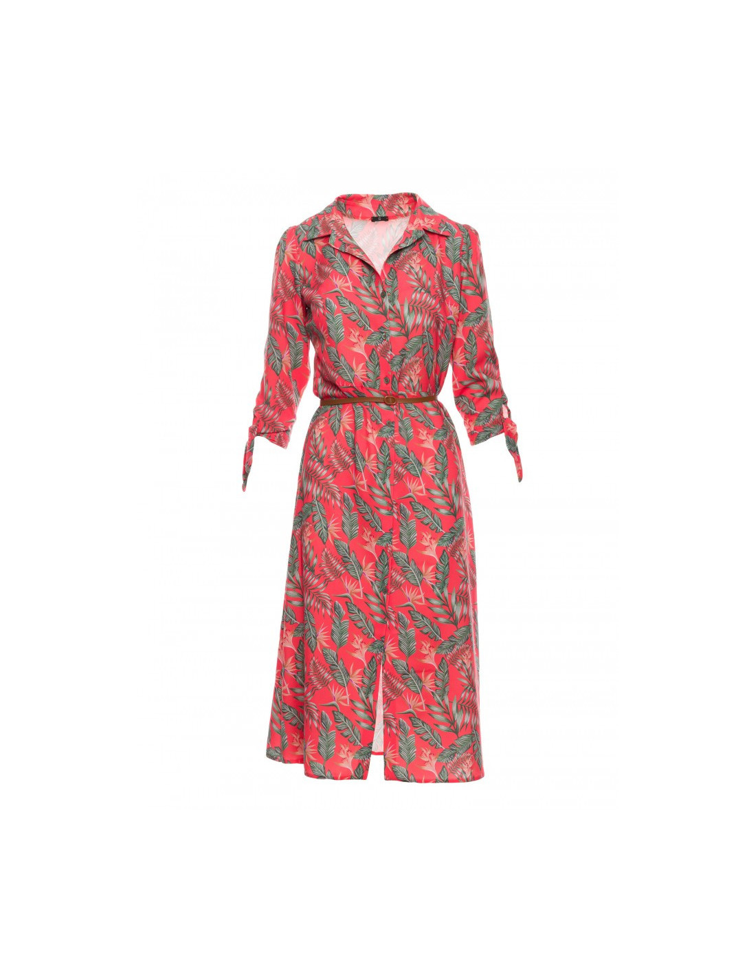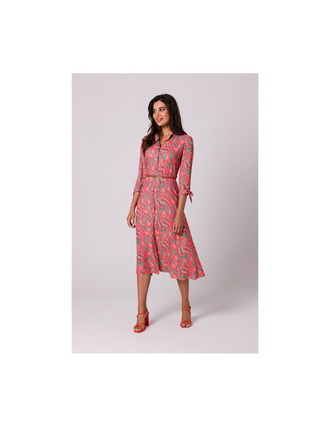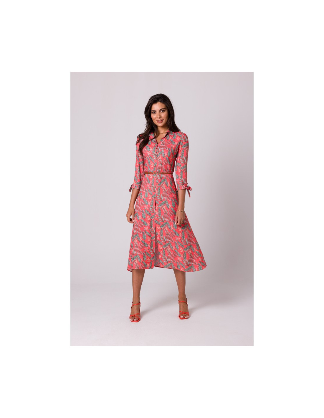 100% polyester Soft fabric with print, classic shirt design with a collar, button down front and a buckle belt - it’s a dress that will make an outfit! PRODUCT DETAILS:      woven fabric  button down shirt dress with a collar 7/8 sleeves with tied cuffs midi length buckle belt attached our model is 177 cm tall and wears size S