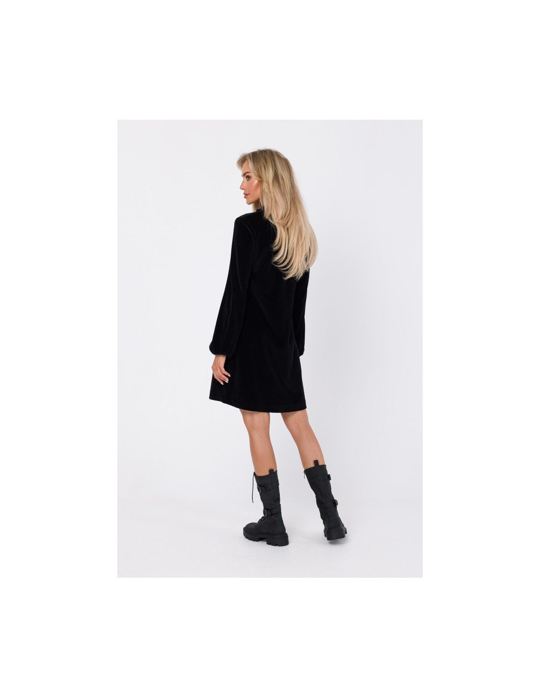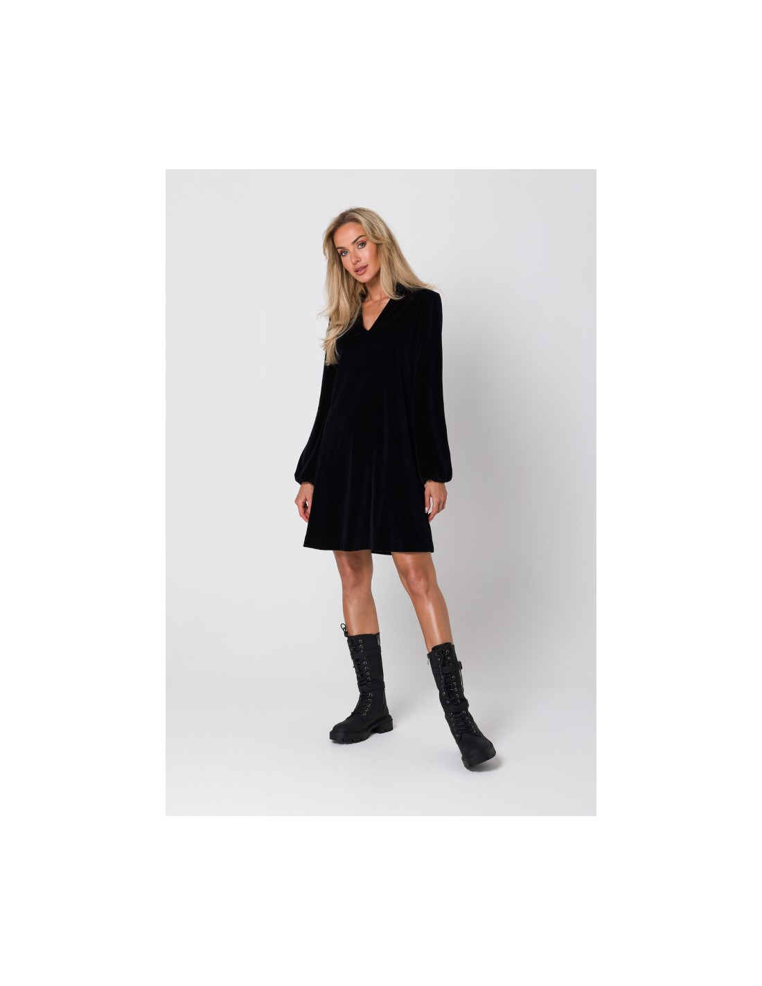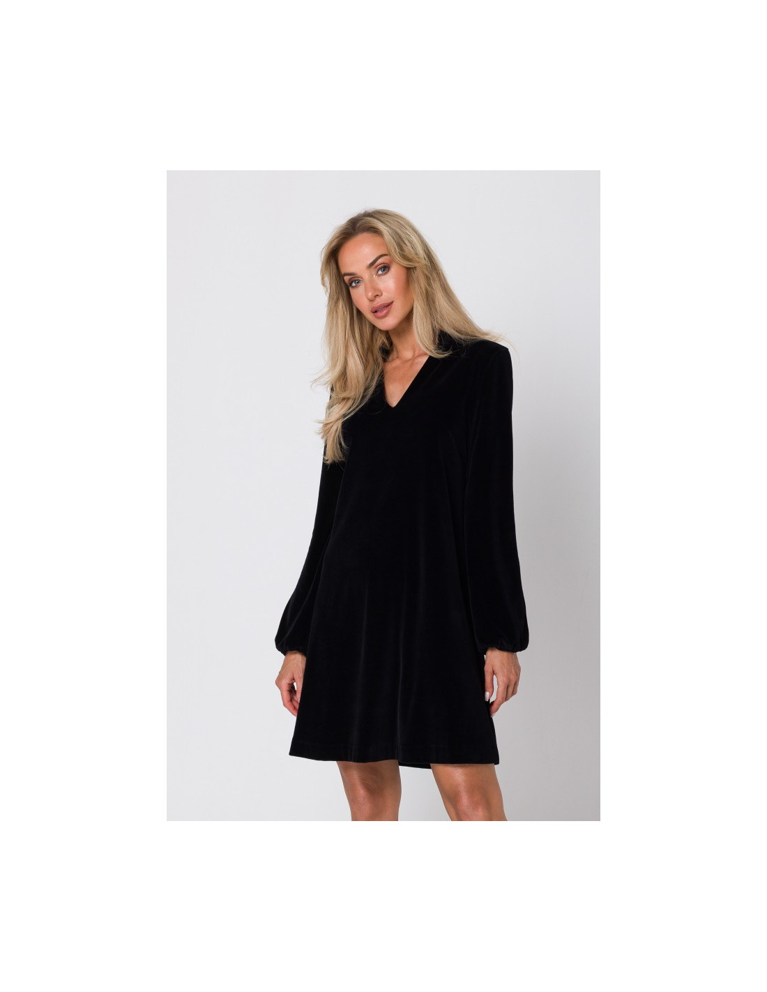 80% cotton 20% polyester PRODUCT INFORMATION: knit fabric - velvet relaxed fit A line dress pulled over the head V-neckline long sleeves finished with elastic hems above knee lenght unlined our model is 171 cm tall and wears size S Designed and made in Poland