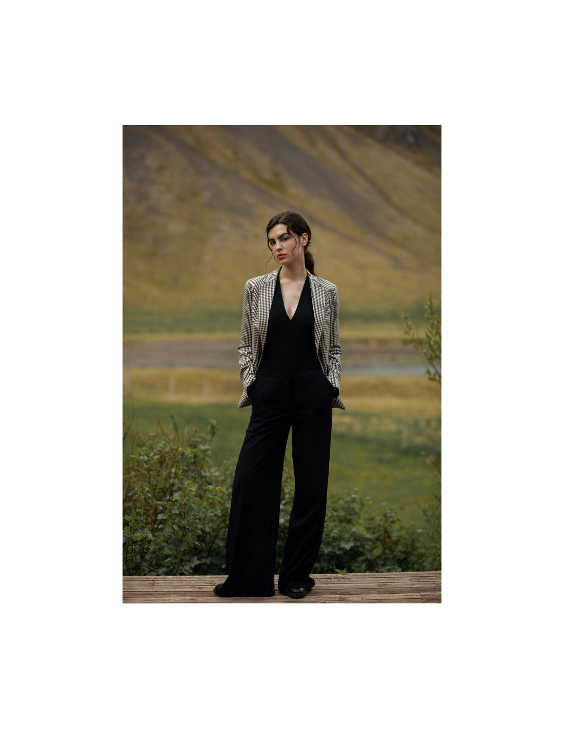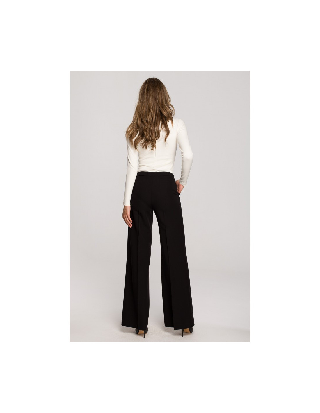 65% polyester 30% viscose 5% elastanase Can women trousers be more feminine? With the wide creased legs touching the floor and fitted low waist design, they will accentuate the best of your figure. PRODUCT DETAILS:      woven fabric  crease wide leg design trousers button and zip fastening in the front slant pockets our model is 174 cm tall and wears size S