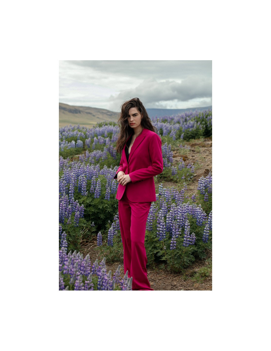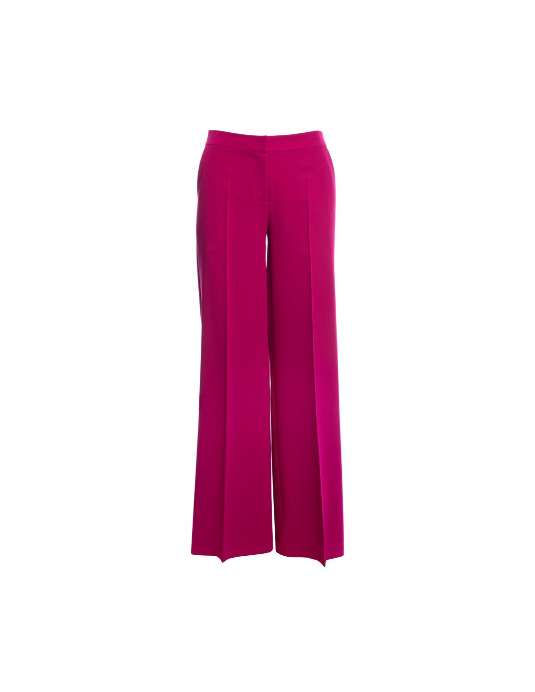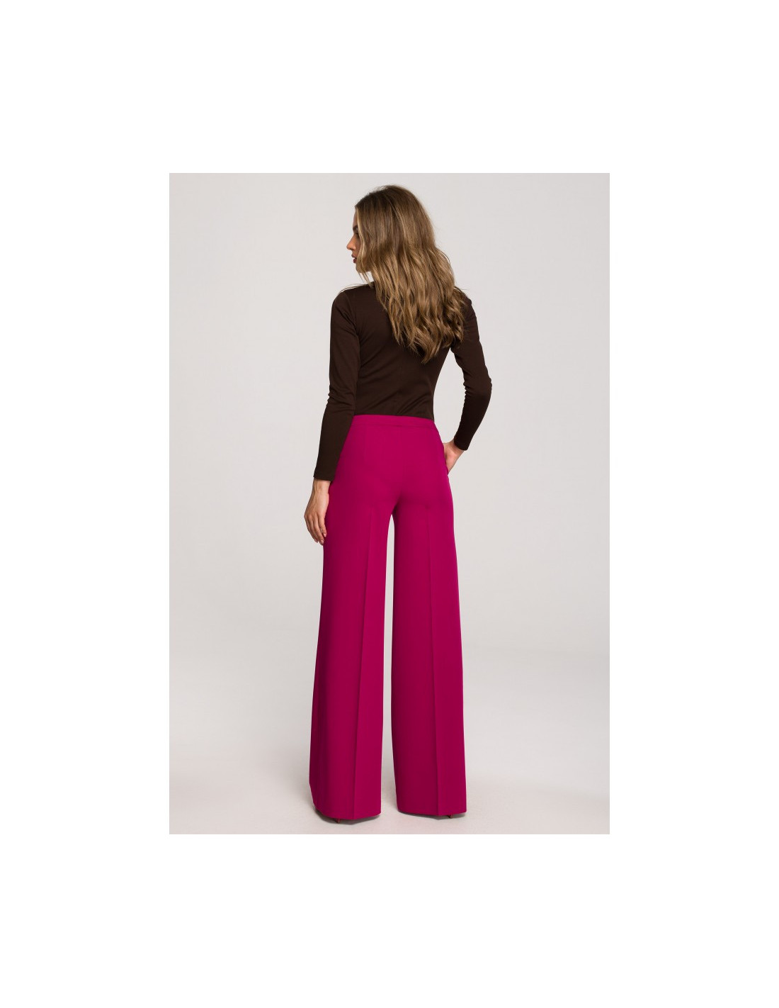 65% polyester 30% viscose 5% elastanase Can women trousers be more feminine? With the wide creased legs touching the floor and fitted low waist design, they will accentuate the best of your figure. PRODUCT DETAILS:      woven fabric  crease wide leg design trousers button and zip fastening in the front slant pockets our model is 174 cm tall and wears size S