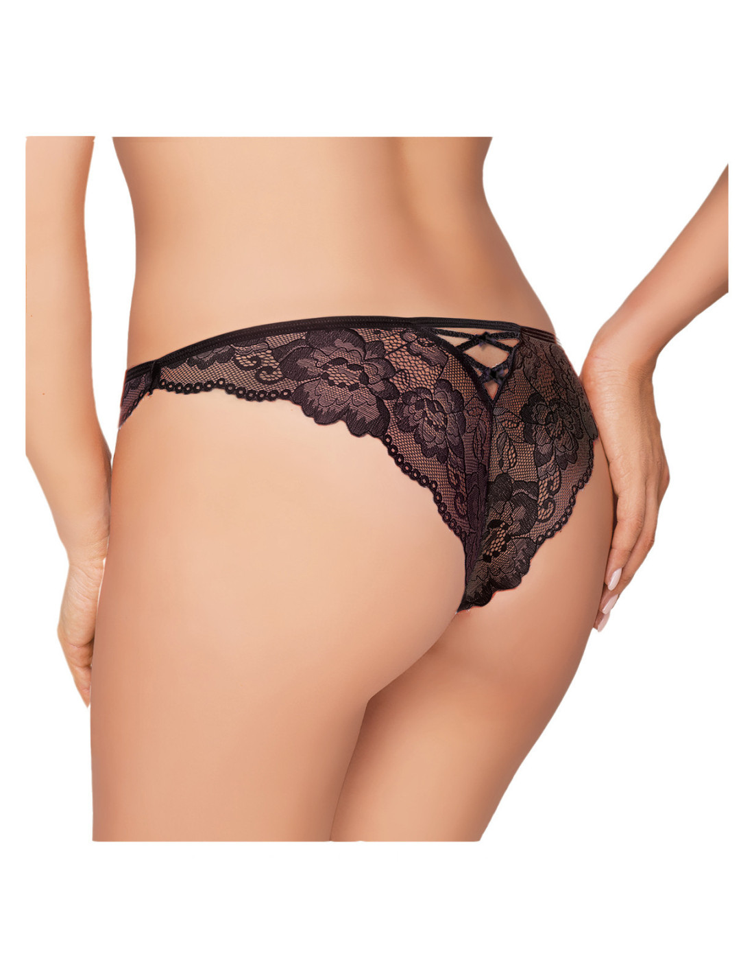 Moteriški stringai - pagaminti iš švelnių nėrinių - papuoštos viržių spalvos lankeliais