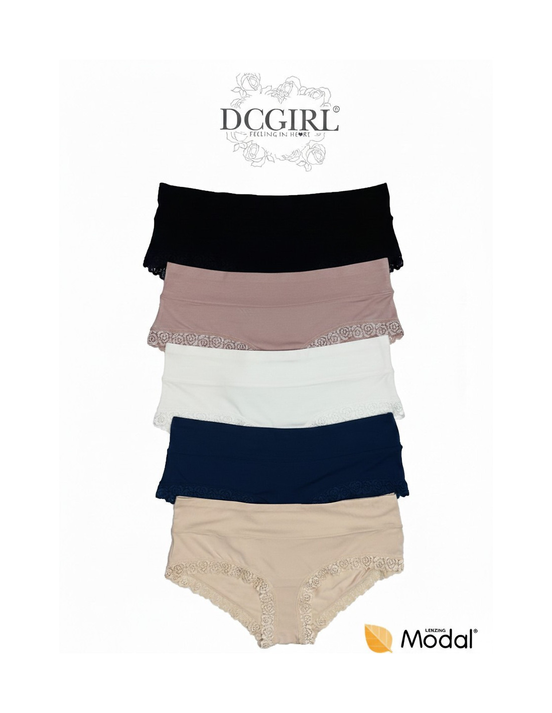 Moteriškos kelnaitės, vientisos - su kaupu ant klubų - liemuo užbaigtas plačiu raišteliu - gražios ir malonios liesti - supakuotos į plastikinį maišelį poromis, šių spalvų: ecru-juoda, mėlyna-ecru, smėlio-mėlyna