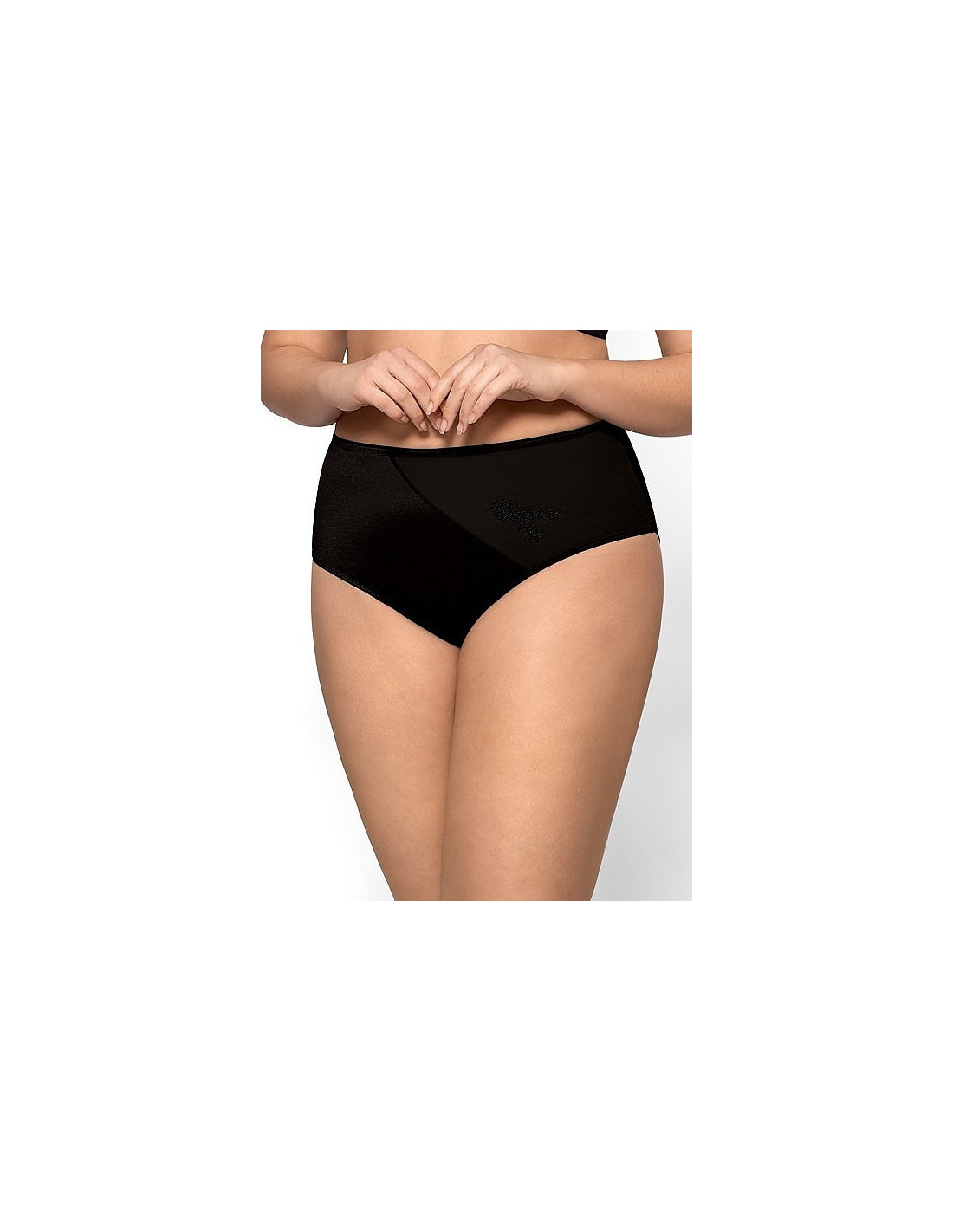 Aukšto kilimo kelnaitės moterims - padidintos ant klubų - malonus kūnui mikropluoštas su tiuliu - šiek tiek prigludęs trikotažinis kūną formuojantis audinys - priekyje ir nugaroje - dvigubi tiulio tinklelio intarpai