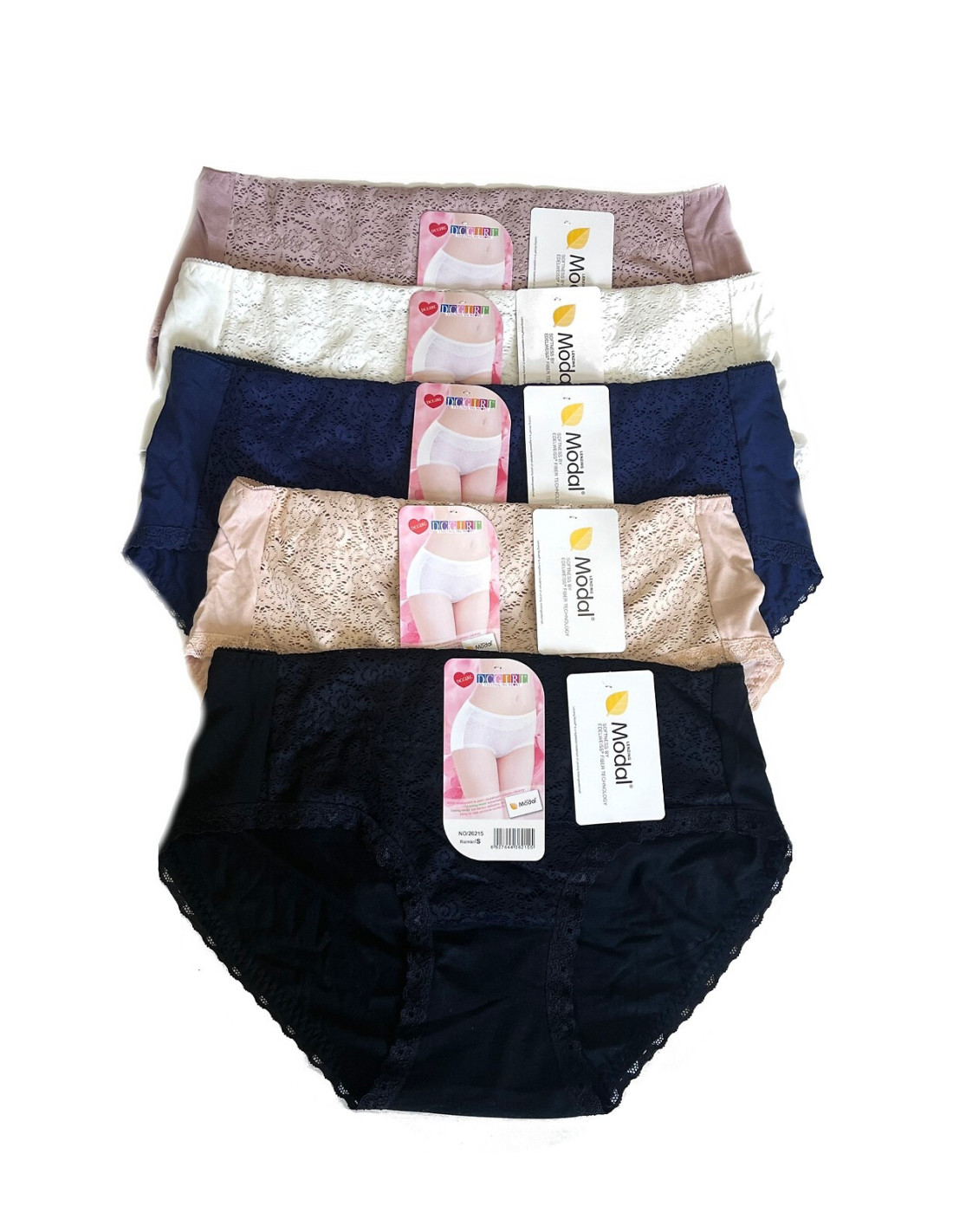Vienspalvės moteriškos kelnaitės - malonus kūnui modalinis audinys - šiek tiek padidintos ties klubais - priekyje - subtilūs nėriniai - supakuotos į folijos maišelį po 12 vienetų - galimi dydžiai pakuotėje: S, M, L, XL
