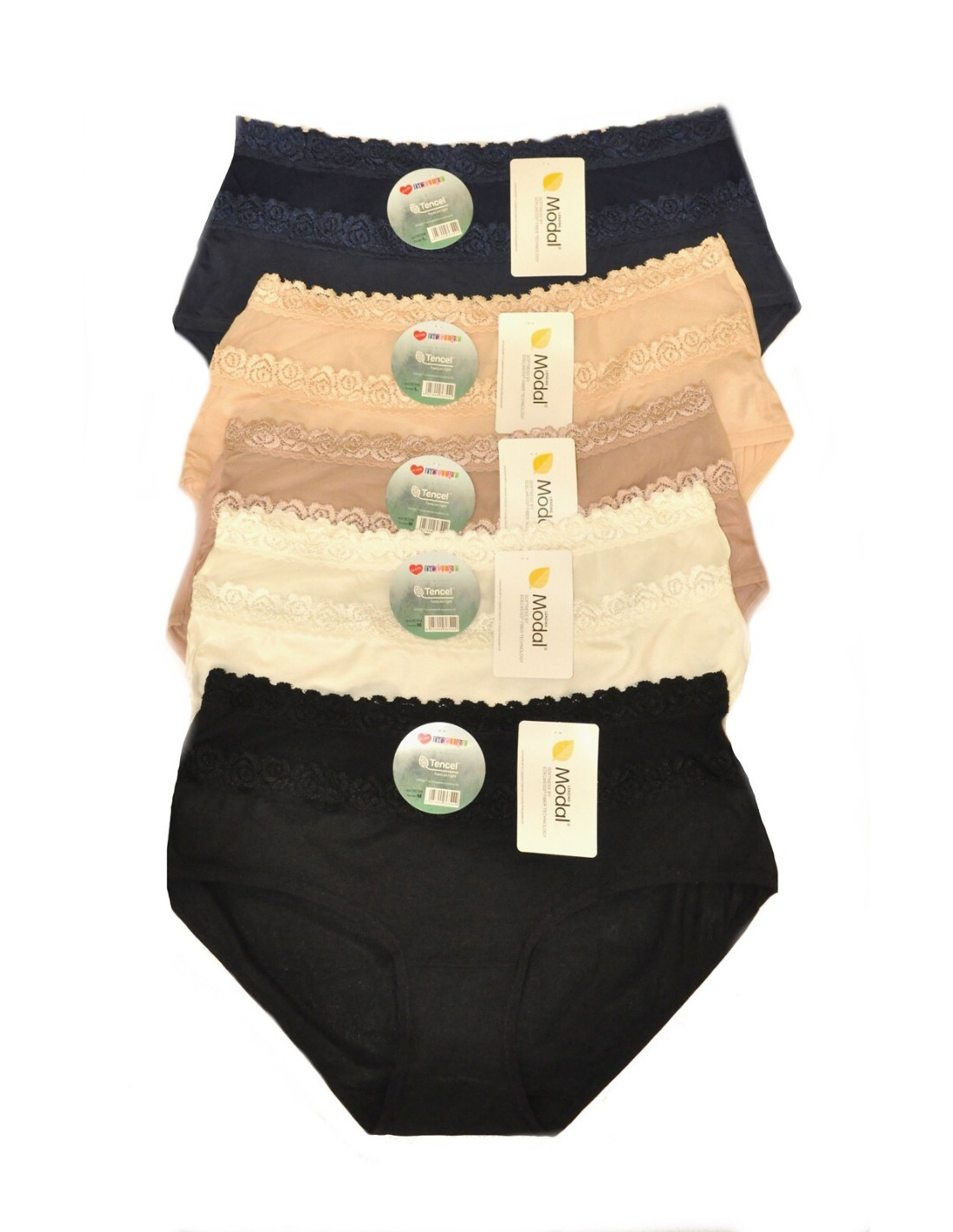 Moteriškos kelnaitės - pagamintos iš malonaus modalo - tiulio tinklelio intarpas ir subtilūs nėriniai viršutinėje linijoje - supakuotos į polietileninį maišelį po 12 vienetų galimos spalvos: moka, ecru, smėlio, juoda, tamsiai mėlyna - galimi pakuotės dydžiai: M, L, XL