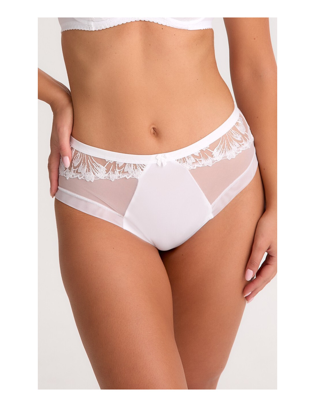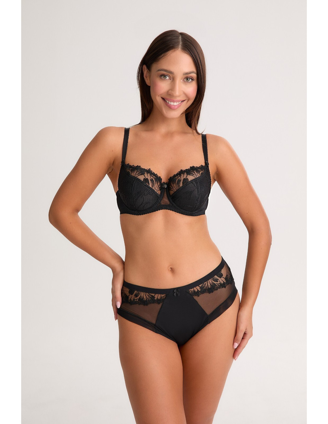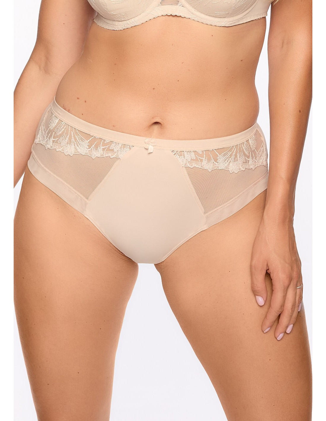 Klasikinės moteriškos kelnaitės - aukštesnė liemens linija, padidėję klubai - švelnus mikropluoštas - priekyje - tinklelis, dekoruotas gėlių siuvinėjimu - kojos užbaigtos dvigubu tiuliu