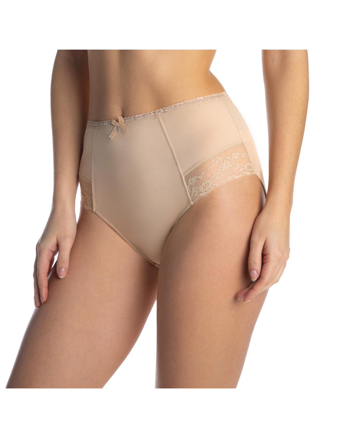 Aukšto kilimo kelnaitės moterims - padidintos ant klubų - apkirpti klubai - priekyje puošta nėrinių intarpu - juosmens juosta dekoruota atlasiniu lankeliu