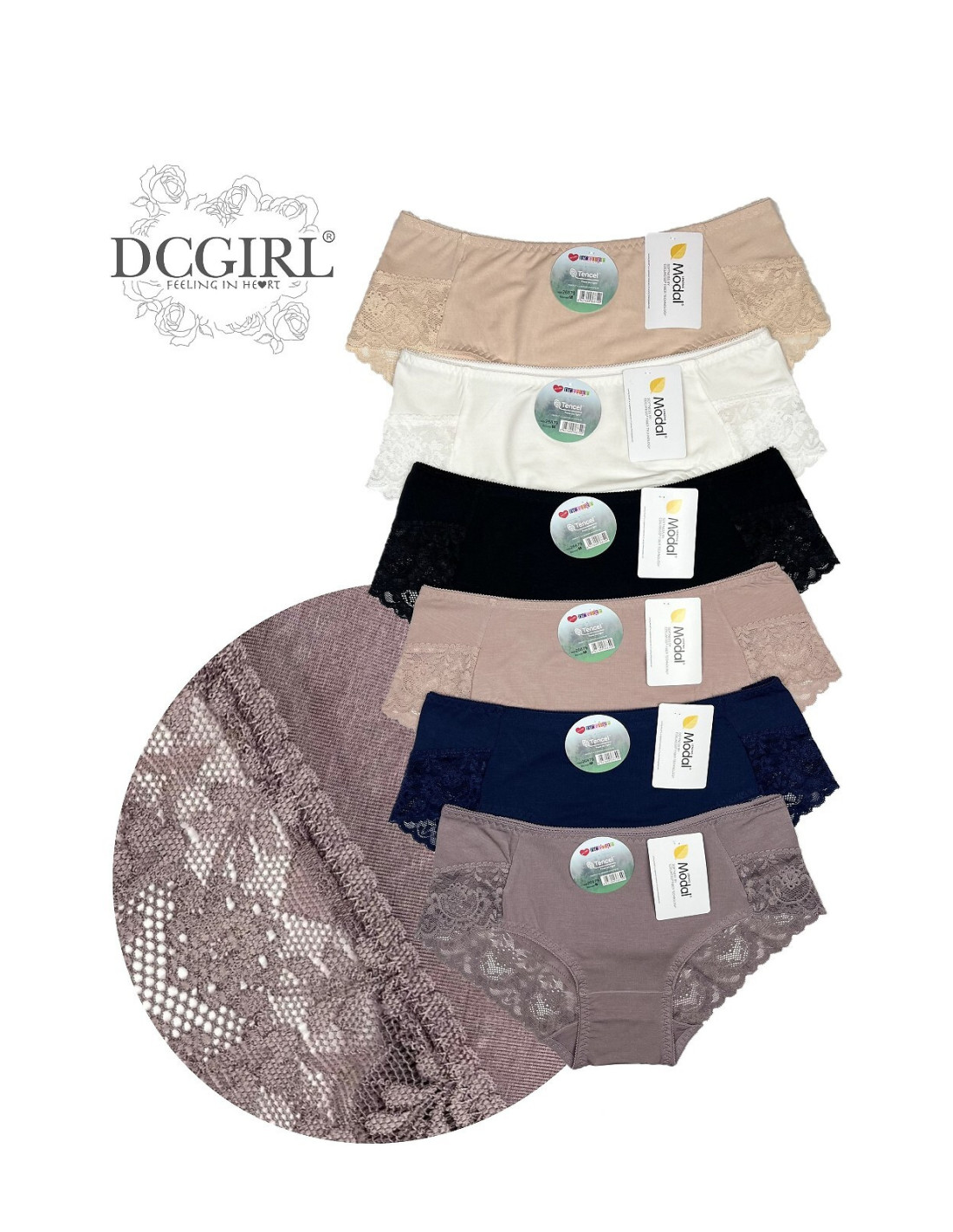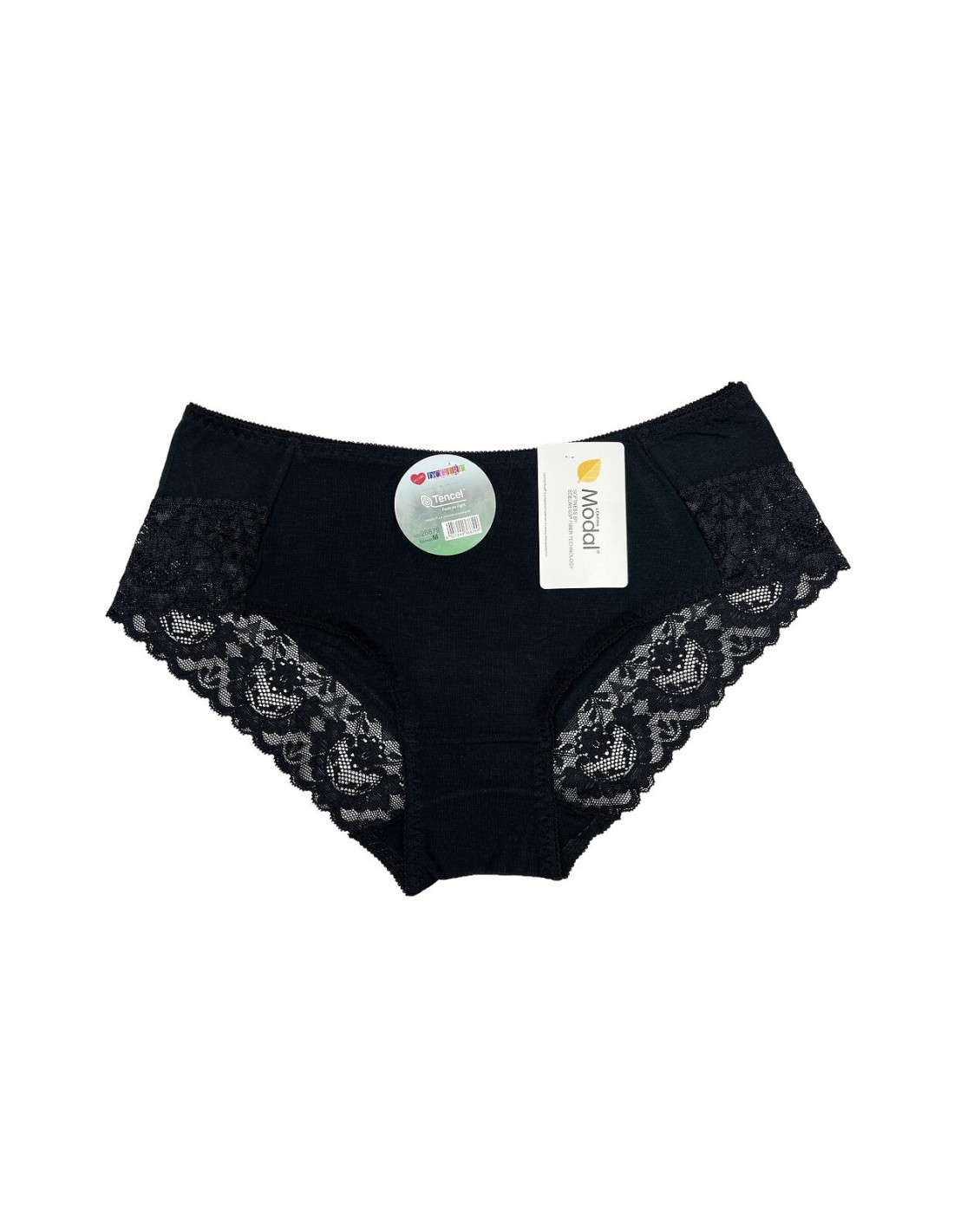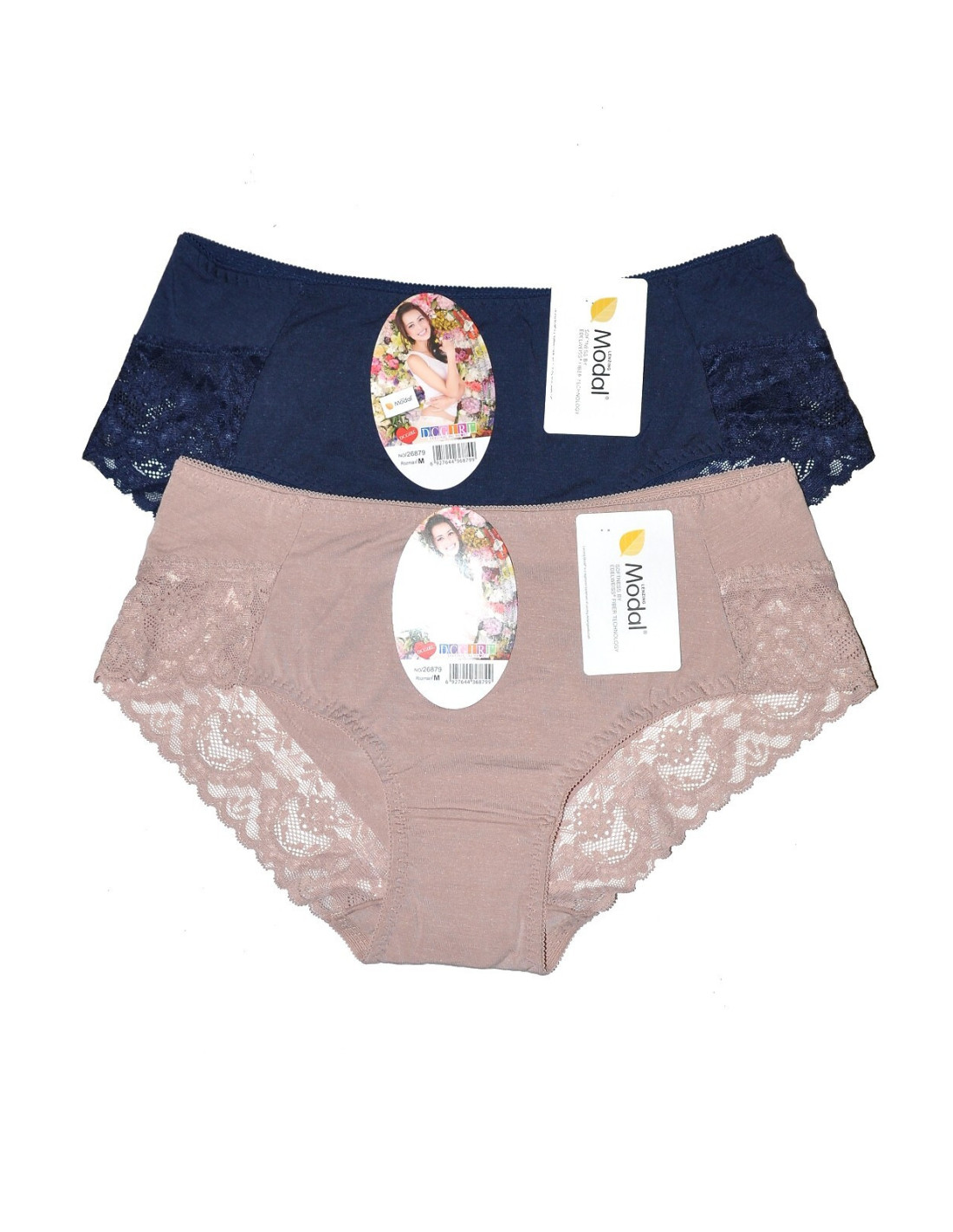 Moteriškos kelnaitės, pagamintos iš kūnui malonaus modalo - su kaupu ant klubų - kojos ir nugara dekoruotos nėriniais - supakuotos plastikiniame maišelyje poromis - galimos spalvos: smėlio, moka, juoda, tamsiai mėlyna, ecru - pasirinktos atsitiktine tvarka