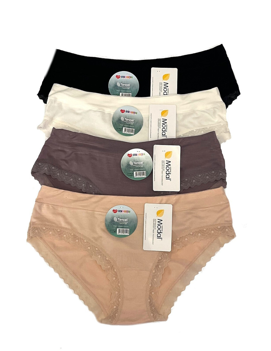 Moteriškos kelnaitės, pagamintos iš kūnui malonaus modalo - klasikinio kirpimo - kojas puošia švelnūs elastingi nėriniai - supakuotos plastikiniame maišelyje po 2 vienetus - atsitiktinai pasirinktos spalvos: juoda, smėlio, ecru, moka